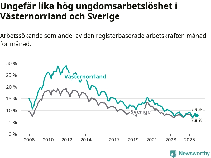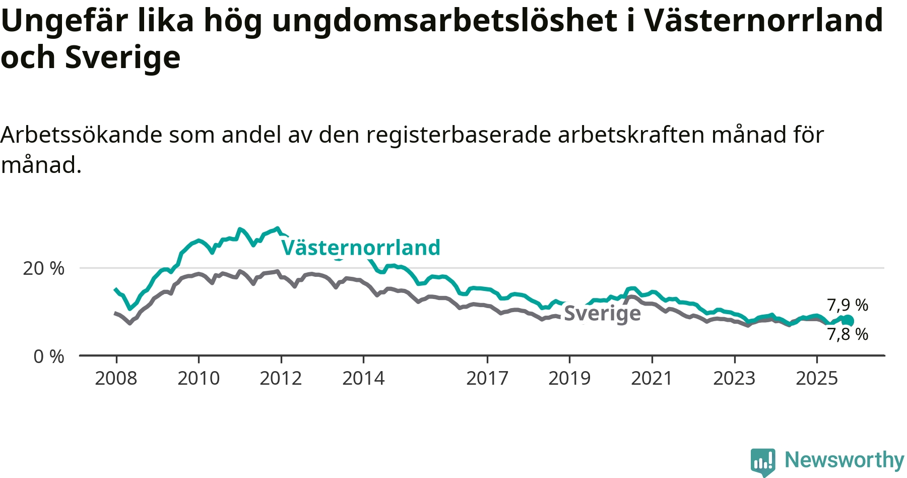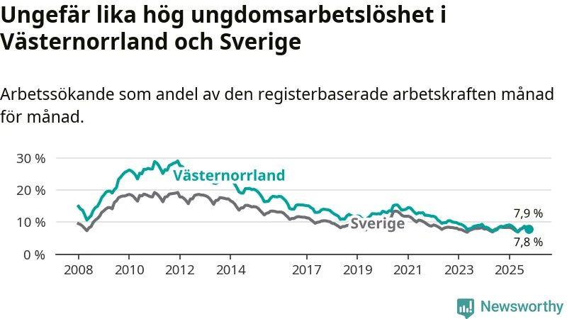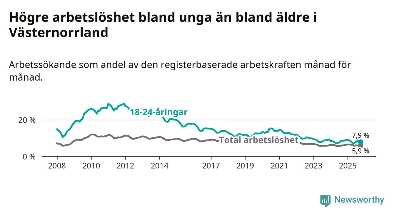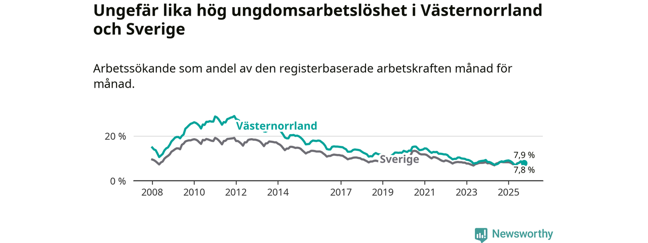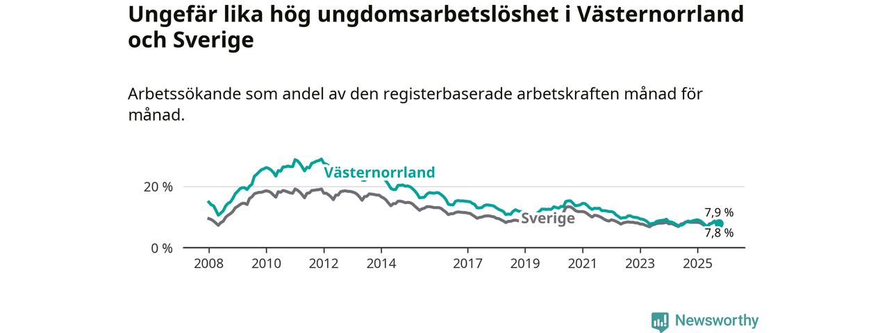 Medan Västernorrland har lägre total arbetslöshet än Sverige, ligger ungdomsarbetslösheten på i stort sett samma nivå.