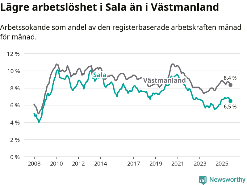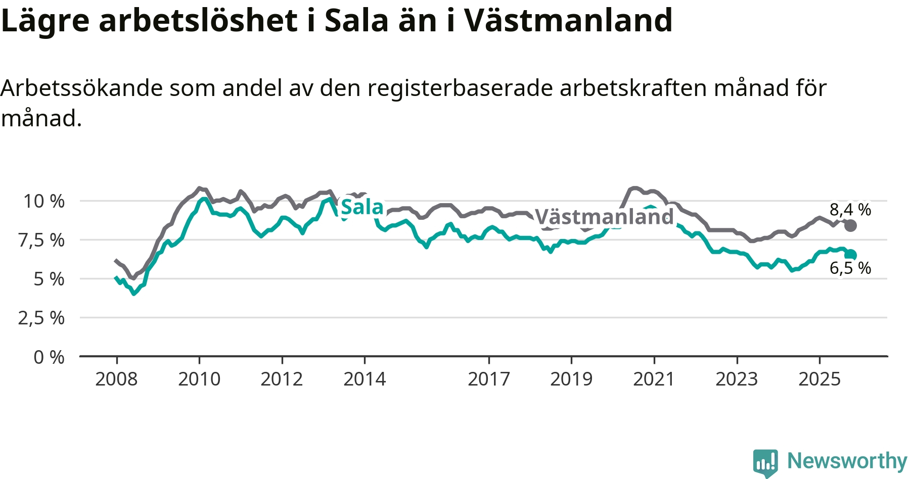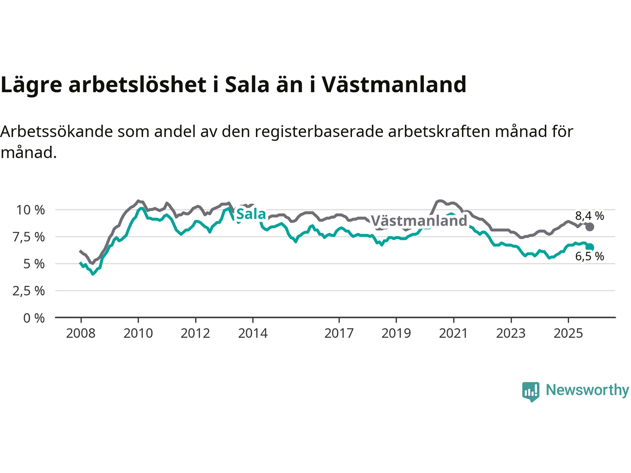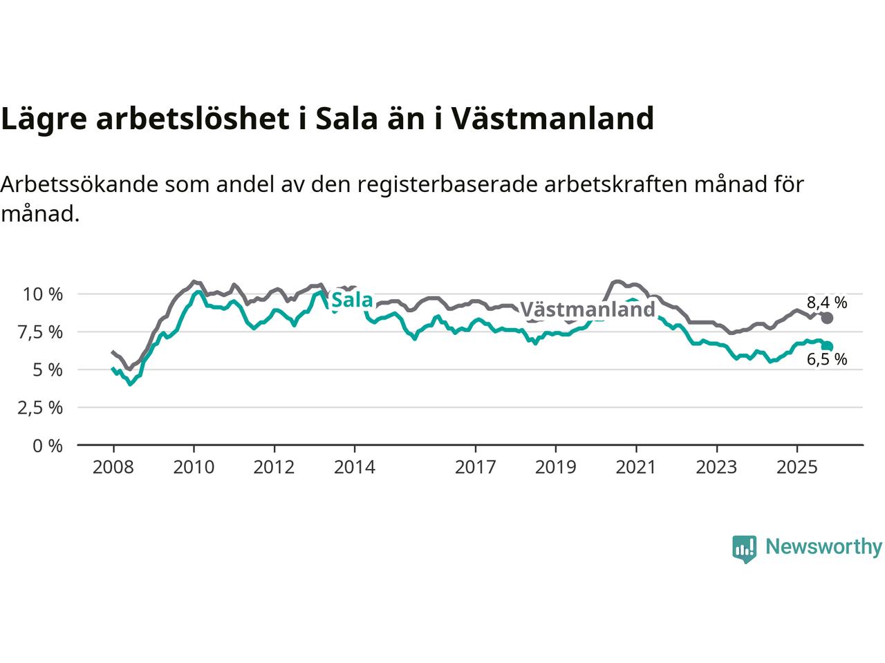 Under oktober månad rapporterade Sala kommun en total arbetslöshet på 6,5 procent. Det är en ökning jämfört med samma tidpunkt i fjol (+0,4 procentenheter). I Västmanlands län däremot sjunker arbetslösheten något.