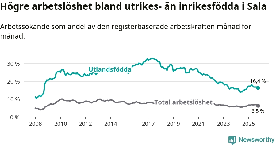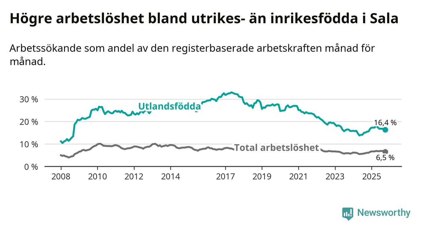 Arbetslösheten bland utlandsfödda var 16,4 procent i Sala under oktober månad, motsvarande 317 av 1 933 personer. Det är 0,9 procentenheter fler än vid samma tidpunkt i fjol (+14 om man räknar personer). Därmed är de utlandsföddas arbetslöshet högre än vid samma tidpunkt i fjol för elfte månaden i följd.