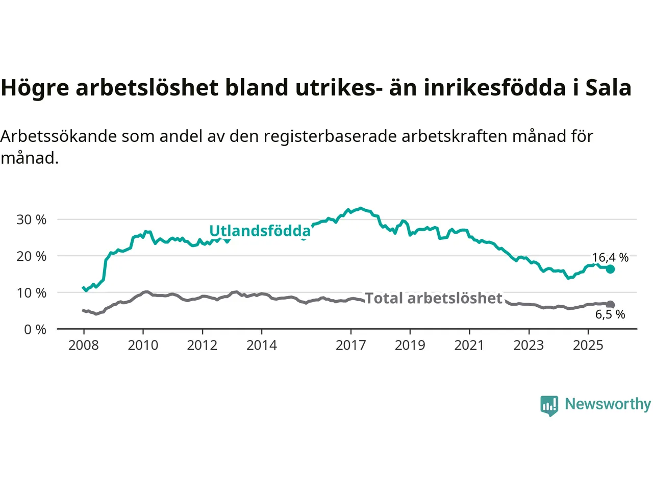 Den senaste månadsstatistiken från Arbetsförmedlingen visar på en uppgång i arbetslöshet bland utlandsfödda i Sala kommun med 0,9 procentenheter. Arbetslösheten bland invånare födda i ett annat land låg i oktober på 16,4 procent.