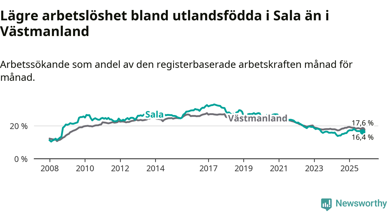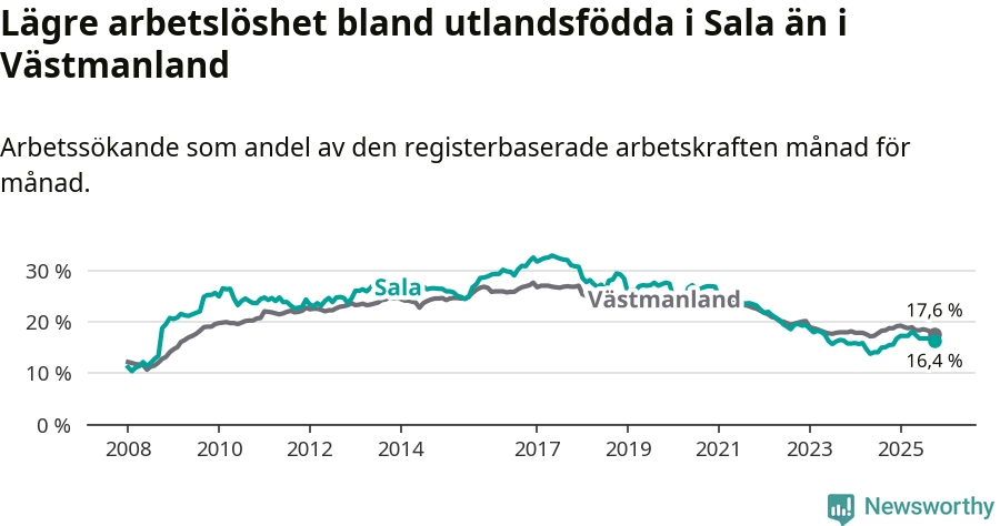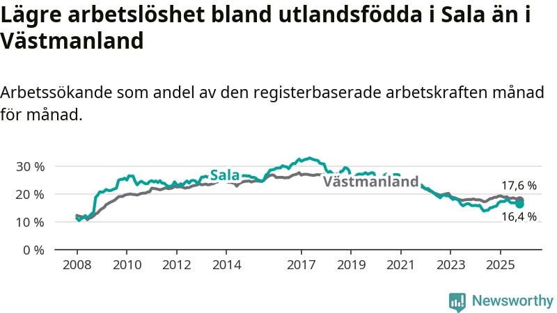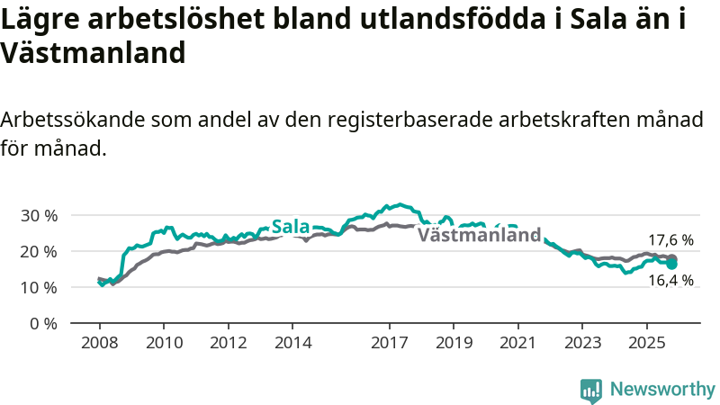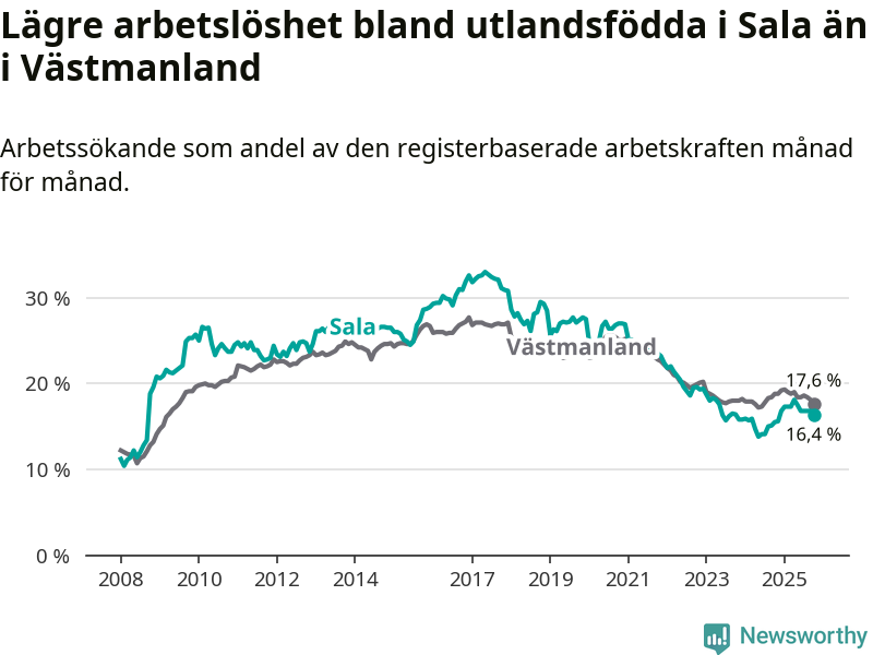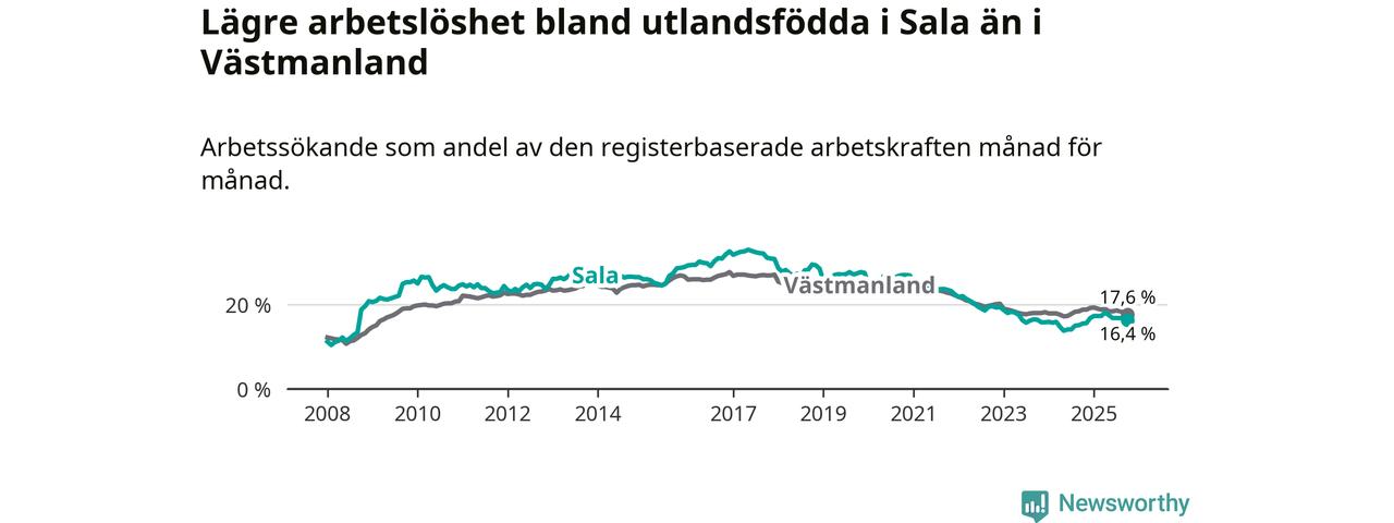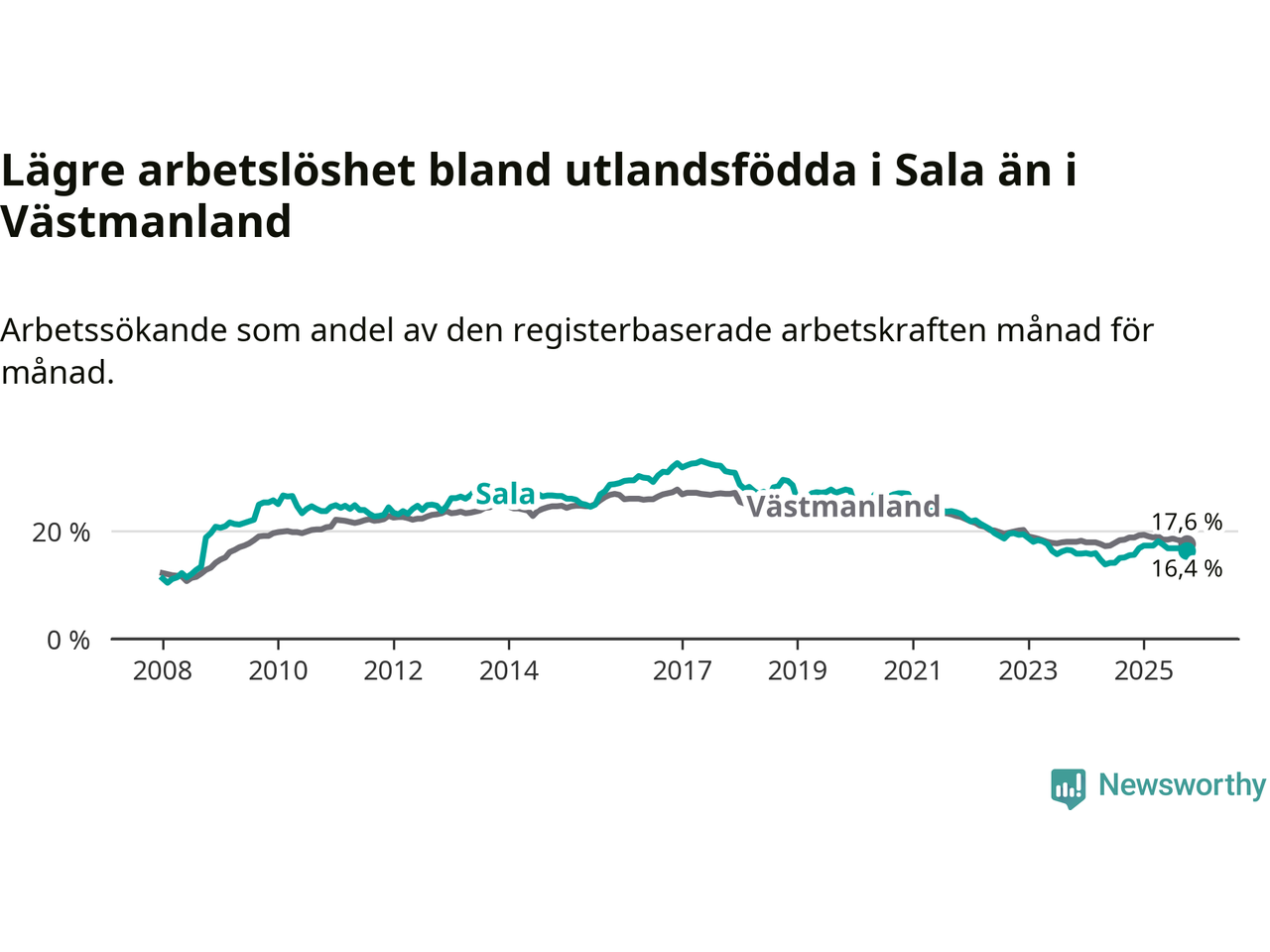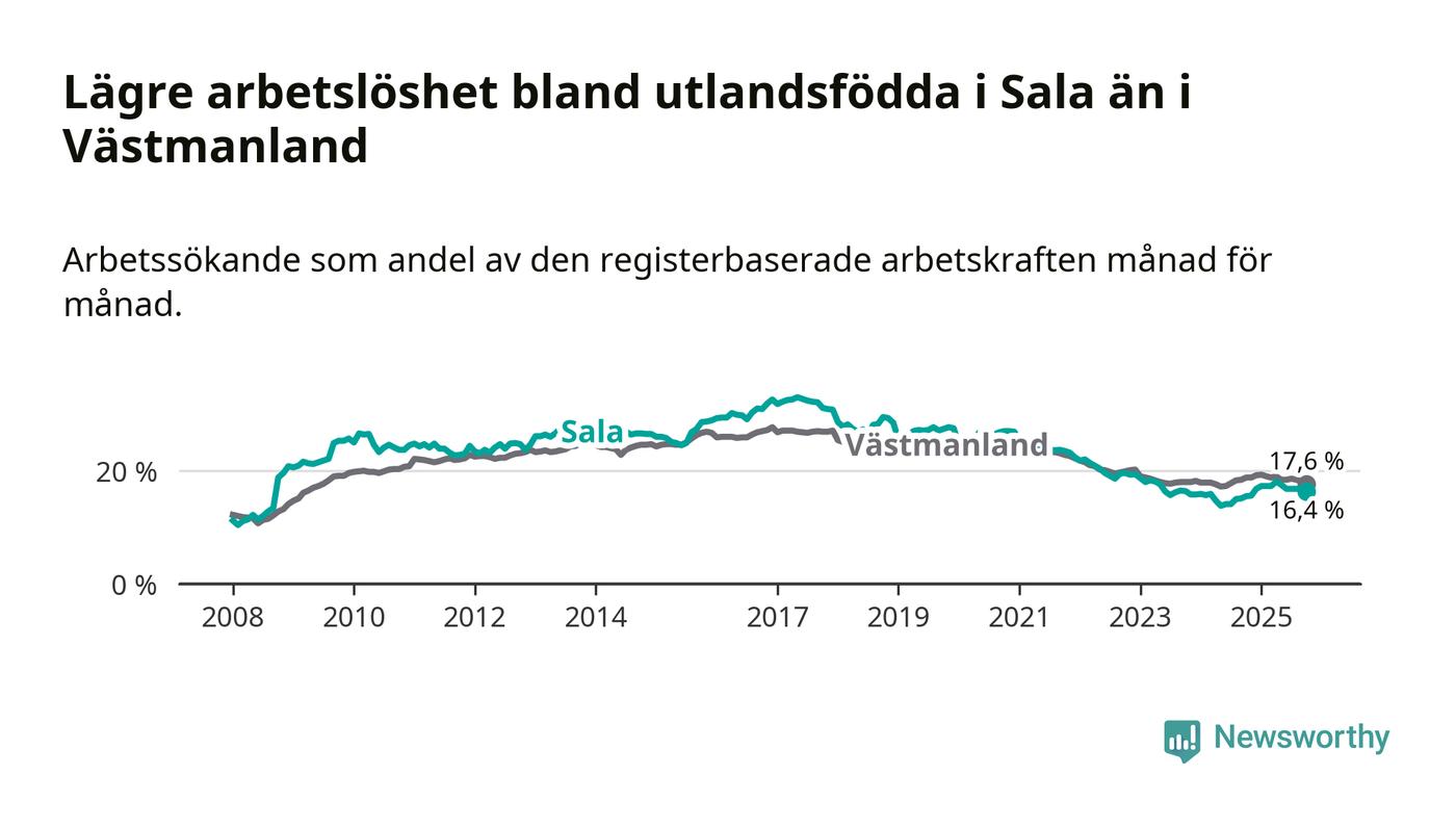 Medan arbetslösheten bland utlandsfödda alltså ökar i Sala så minskar den i Västmanland. Jämfört med oktober förra året har andelen arbetslösa utlandsfödda i länet minskat med 1,2 procentenheter (till 17,6 procent). Trots den senaste uppgången har Sala med andra ord fortfarande lägre arbetslöshet bland utlandsfödda än Västmanland.