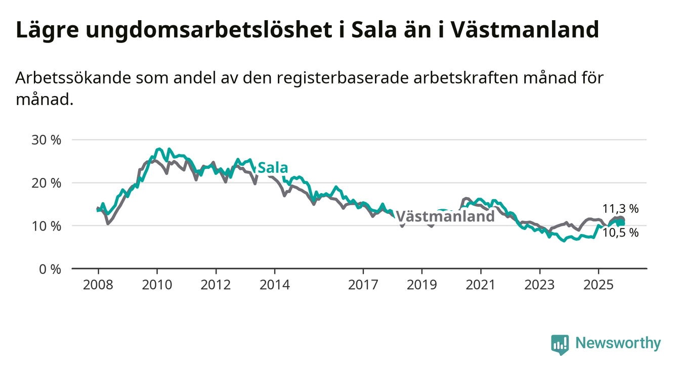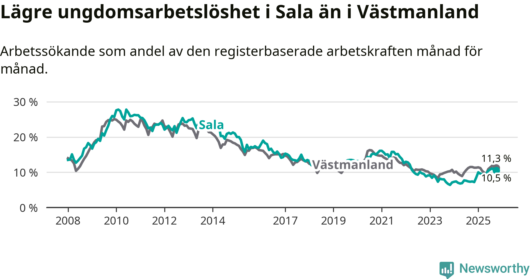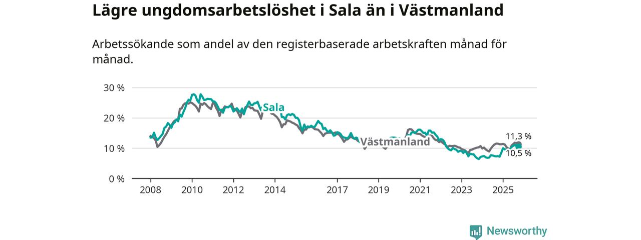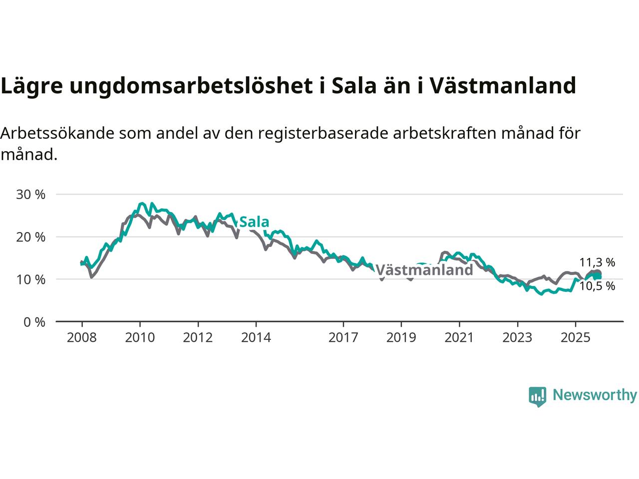 Precis som den totala arbetslösheten ligger ungdomsarbetslösheten i Sala lägre än i Västmanland som helhet. Skillnaden mellan kommunen och länet är 0,8 procentenheter.