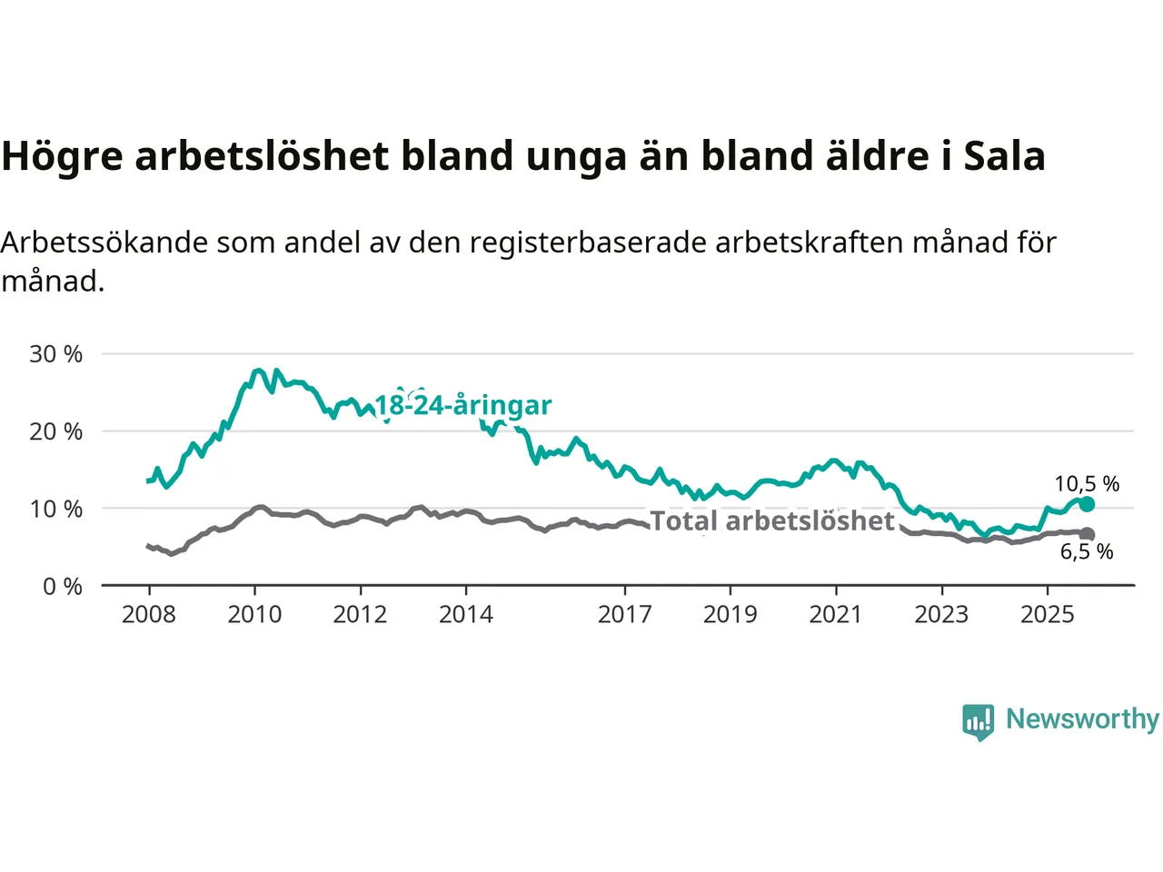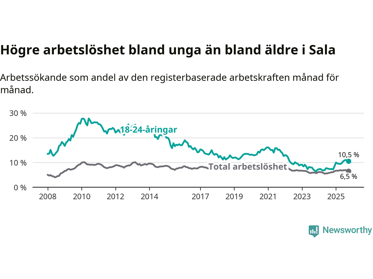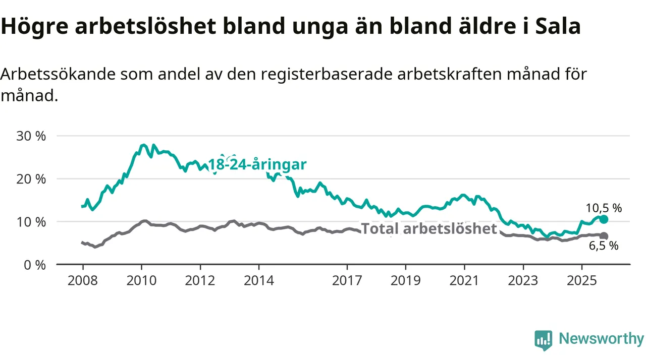I och med den senaste månadens uppgång har de ungas arbetslöshet i Sala stigit 14 månader i följd (upp från 7,4 procent i augusti 2024 till 10,5 procent nu).