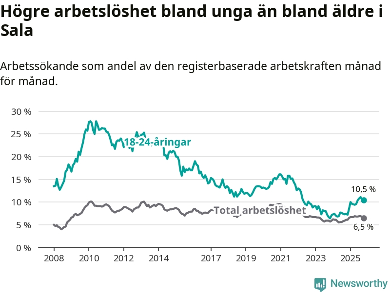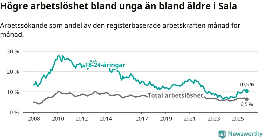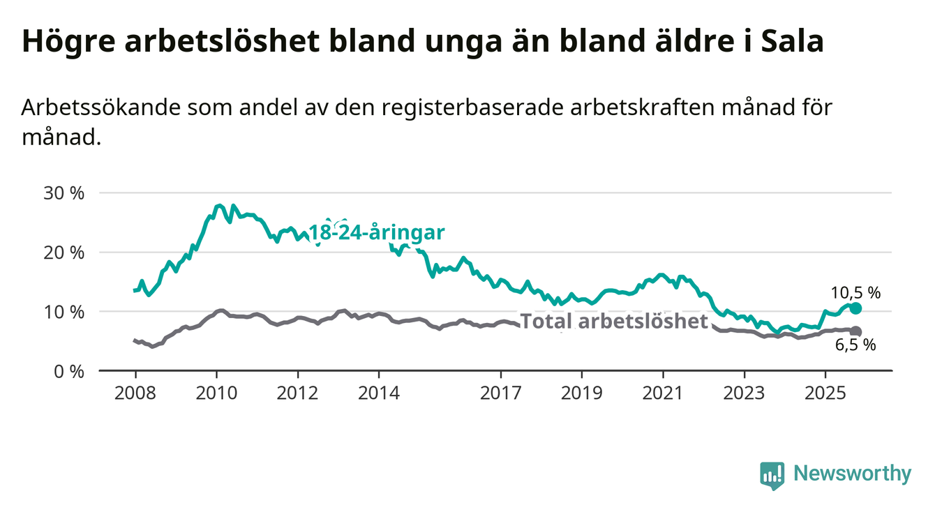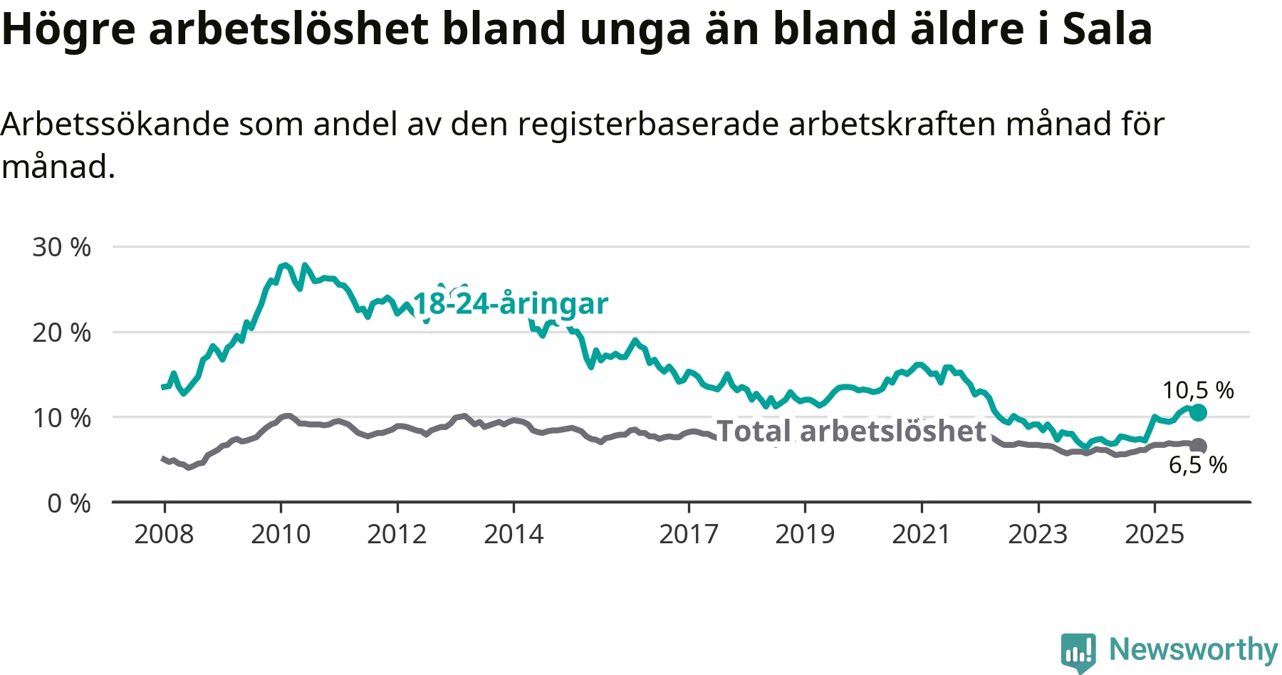 I och med den senaste månadens uppgång har de ungas arbetslöshet i Sala stigit 14 månader i följd (upp från 7,4 procent i augusti 2024 till 10,5 procent nu).