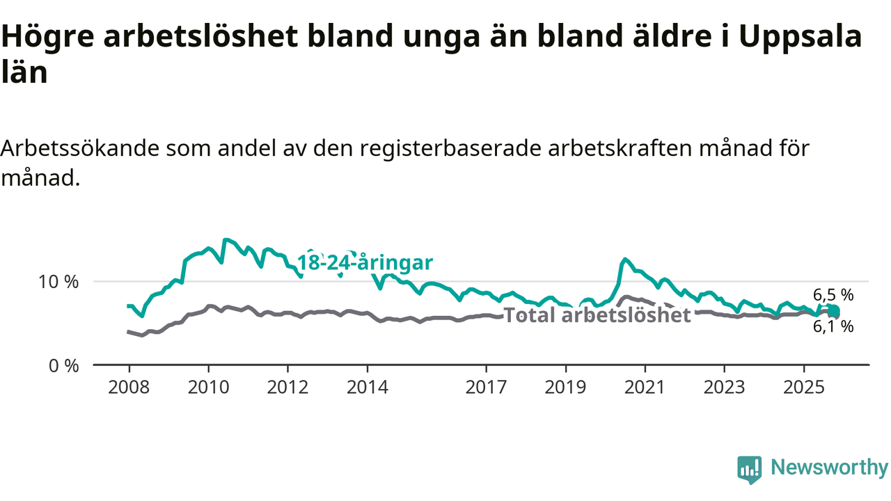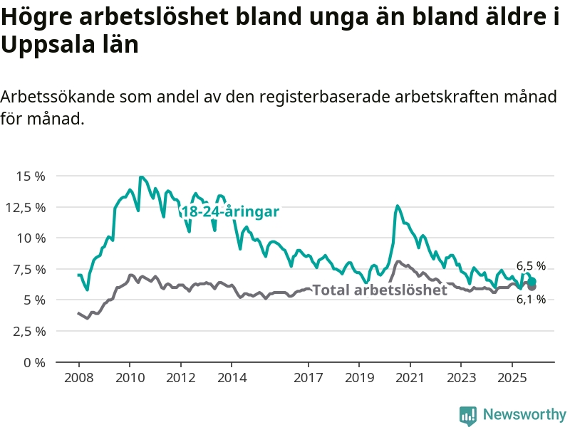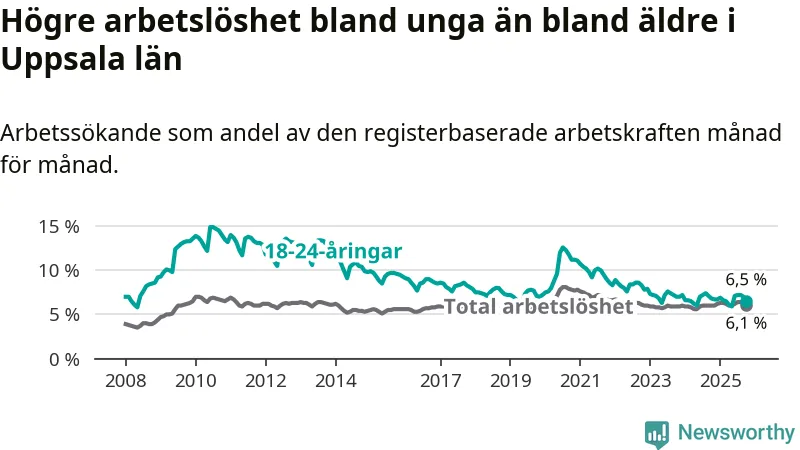 Till skillnad från den totala arbetslösheten sjunker arbetslösheten bland unga (−0,3 procentenheter). I oktober var 6,5 procent av 18–24-åringarna inskrivna som arbetssökande (motsvarande 1 540 personer). Mäter vi antalet inskrivna ser vi en minskning med 60 personer på ett års sikt.