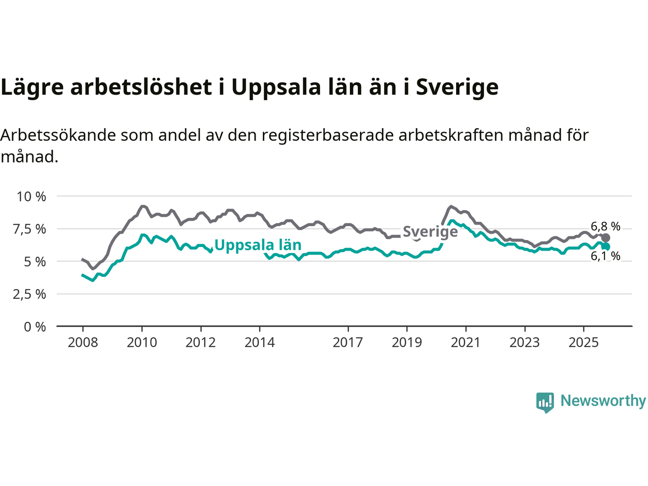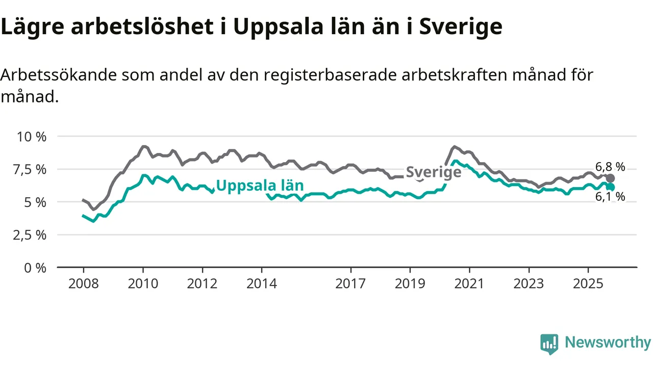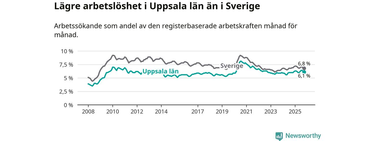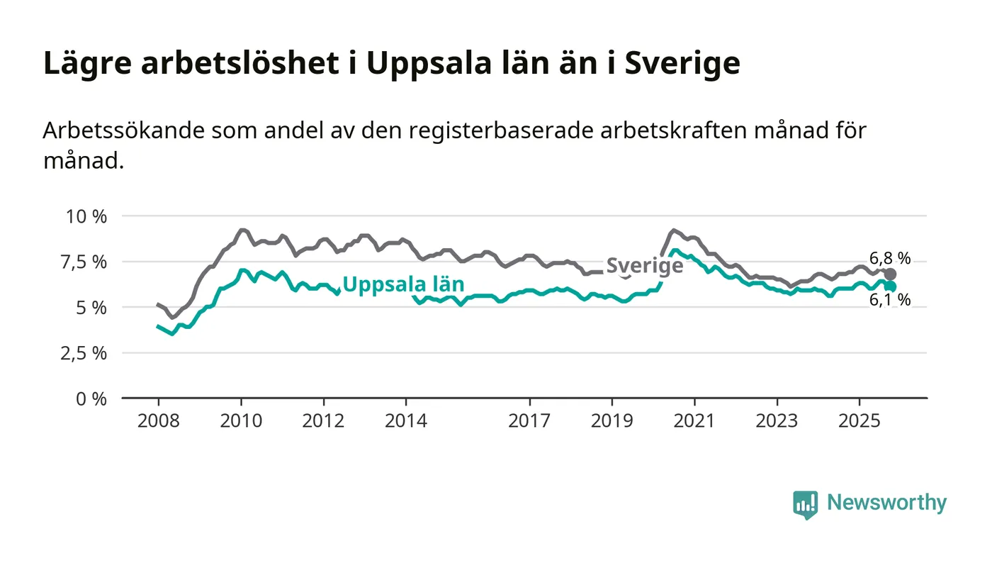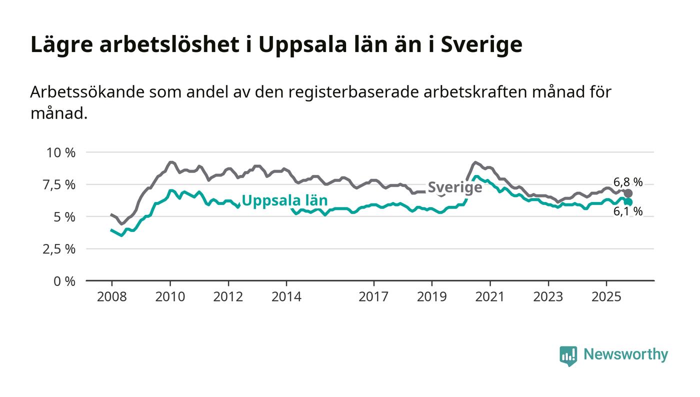 Även om arbetslösheten i Uppsala alltså ökar, så ligger den fortfarande under snittet i hela Sverige (6,1 procent i länet, jämfört med 6,8 procent i hela riket). Norrbotten har den lägsta arbetslösheten i riket (3,9 procent), medan Skåne har den högsta (8,8 procent). För att Uppsala skulle komma ner i samma arbetslöshetsnivå som Norrbotten skulle 4 461 personer behöva sysselsättas.