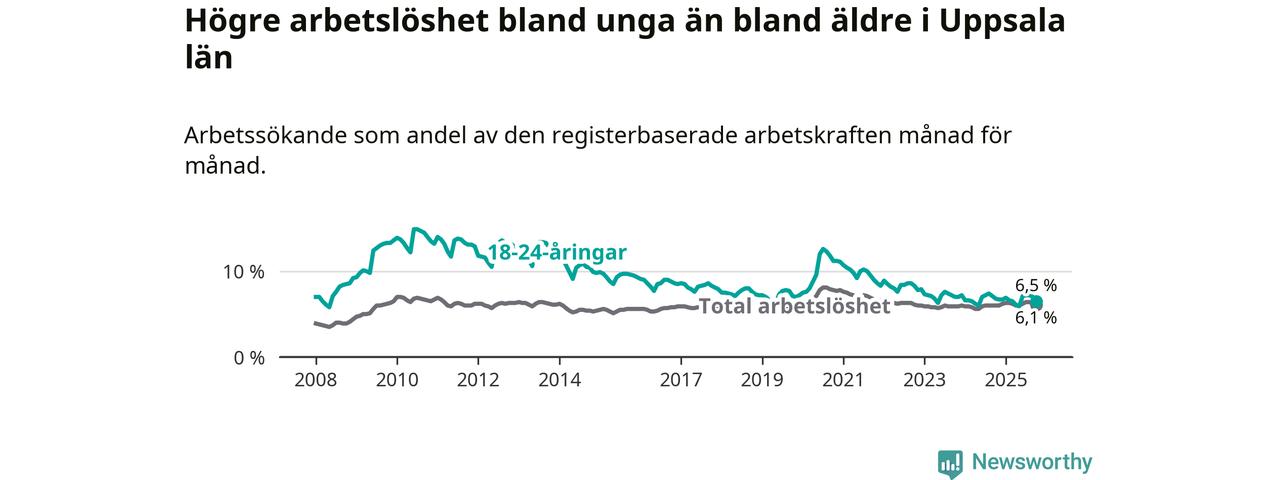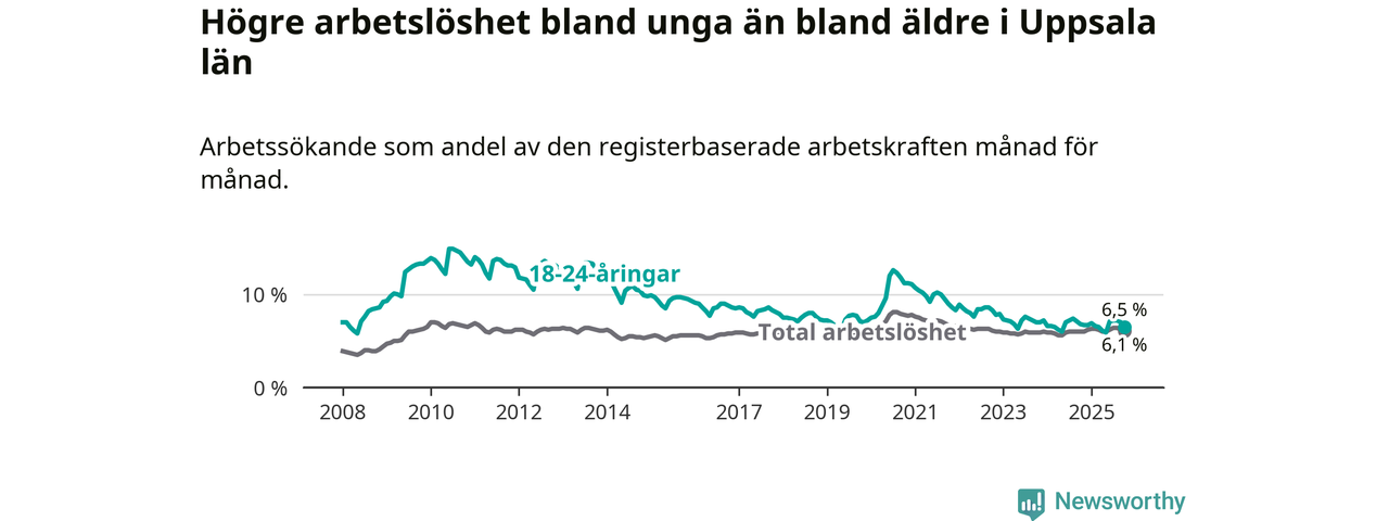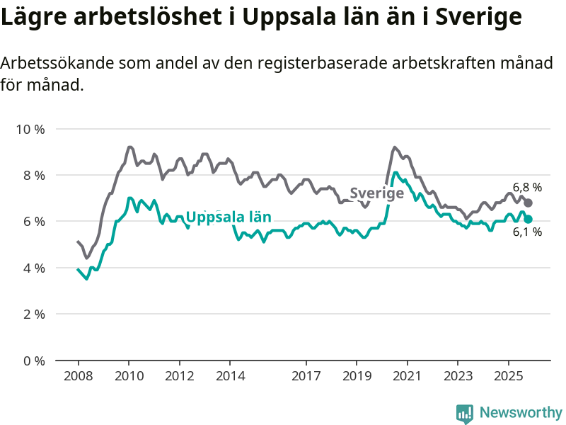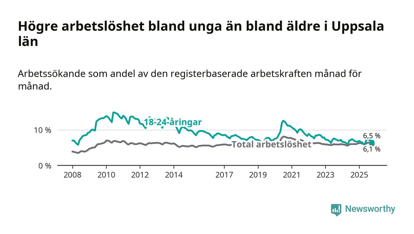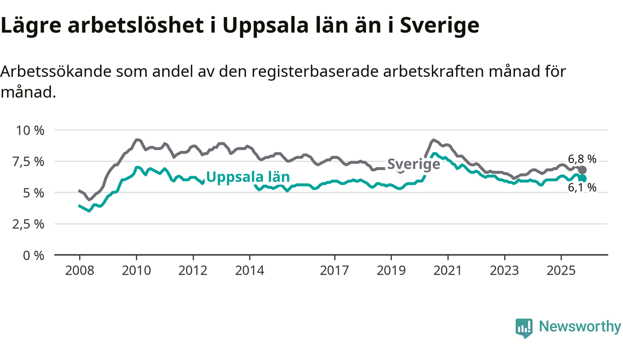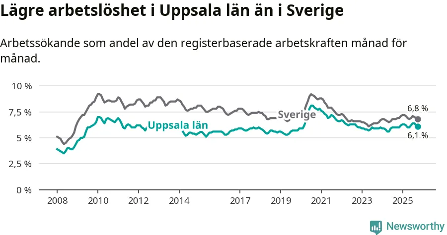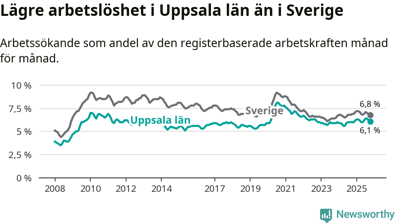 Även om arbetslösheten i Uppsala alltså ökar, så ligger den fortfarande under snittet i hela Sverige (6,1 procent i länet, jämfört med 6,8 procent i hela riket). Norrbotten har den lägsta arbetslösheten i riket (3,9 procent), medan Skåne har den högsta (8,8 procent). För att Uppsala skulle komma ner i samma arbetslöshetsnivå som Norrbotten skulle 4 461 personer behöva sysselsättas.