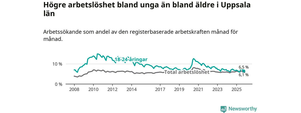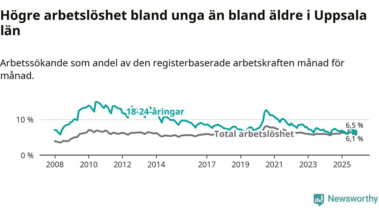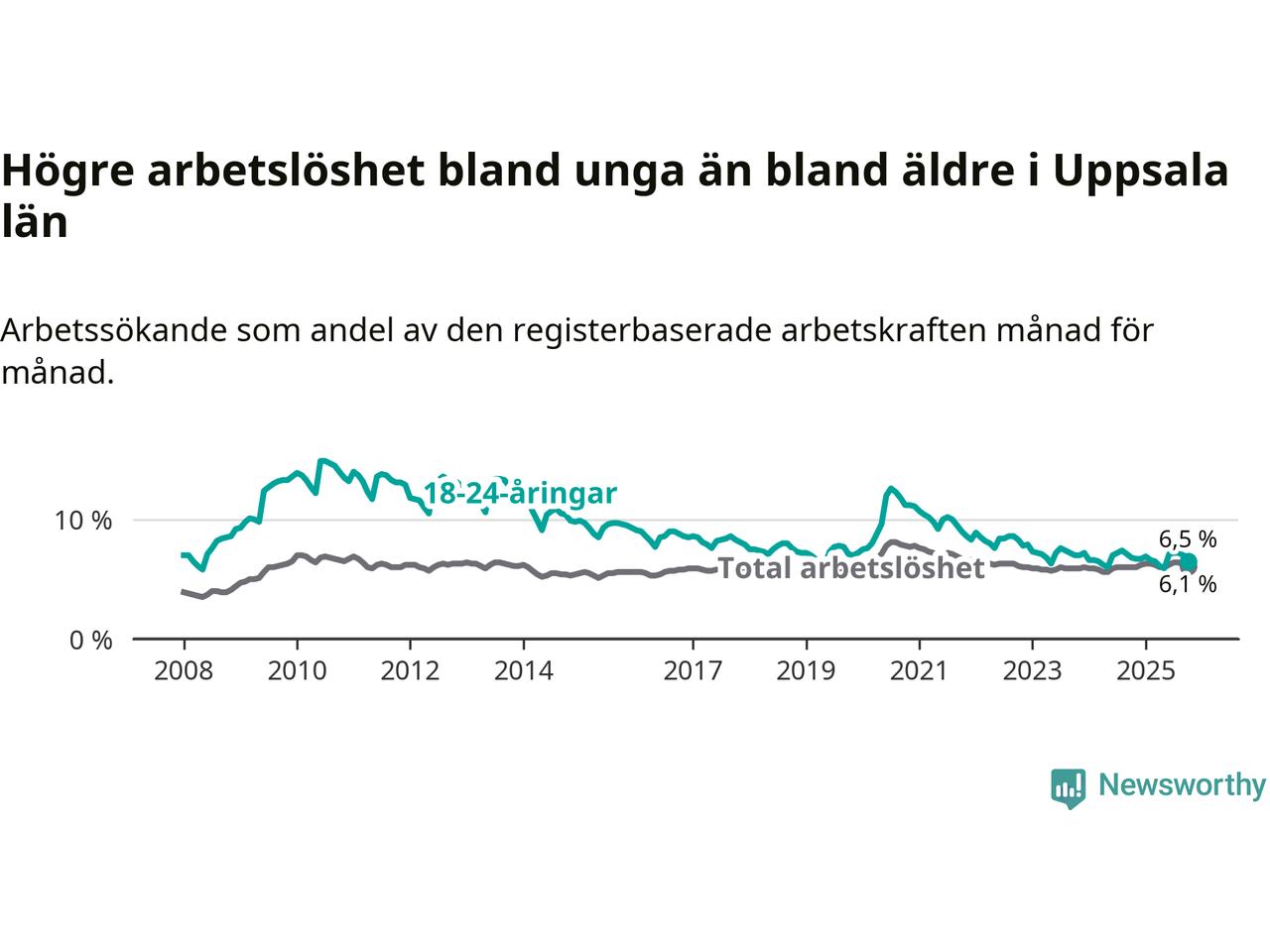 Under oktober månad rapporterade Uppsala län en total arbetslöshet på 6,1 procent. Det är en ökning jämfört med samma tidpunkt i fjol (+0,1 procentenheter). I Sverige däremot sjunker arbetslösheten något.