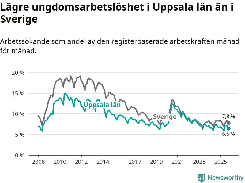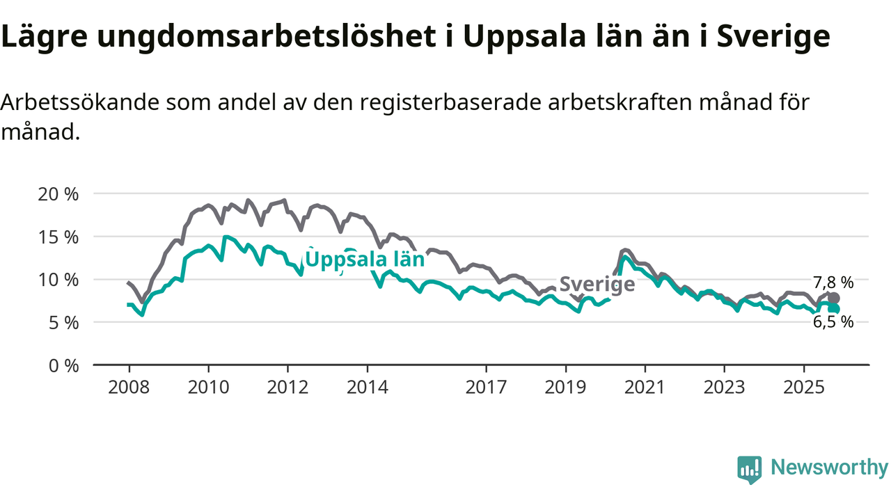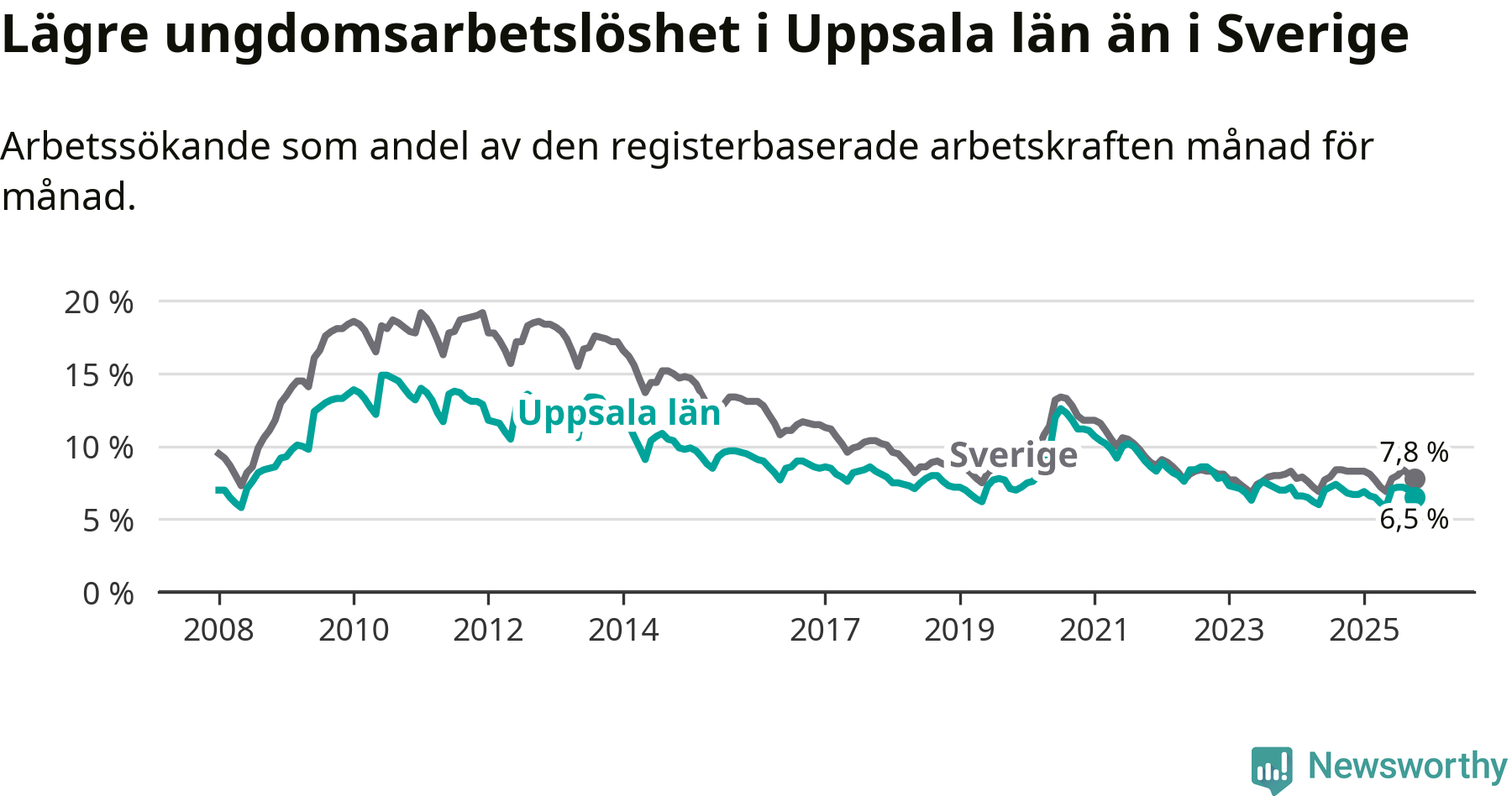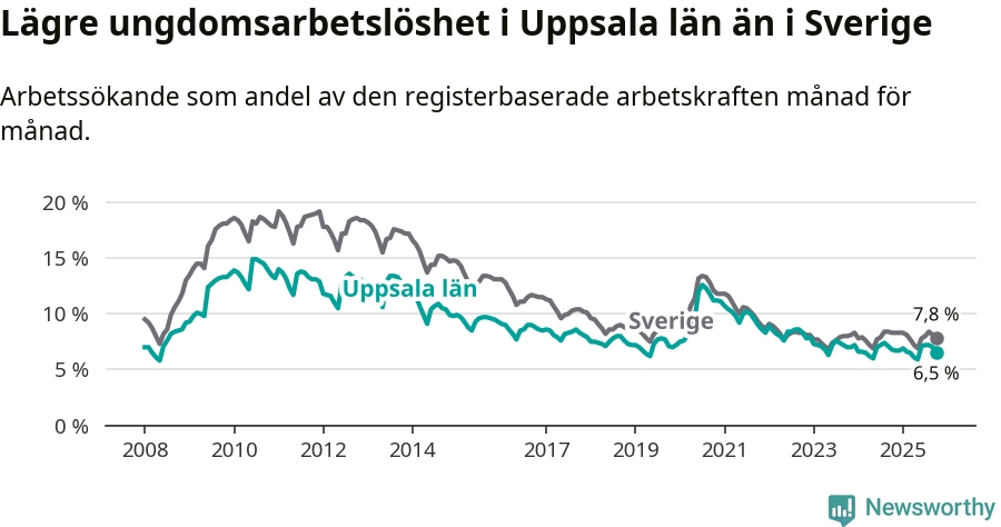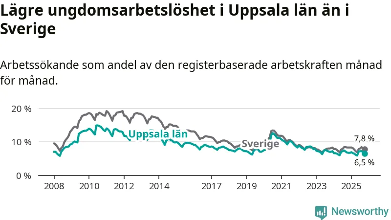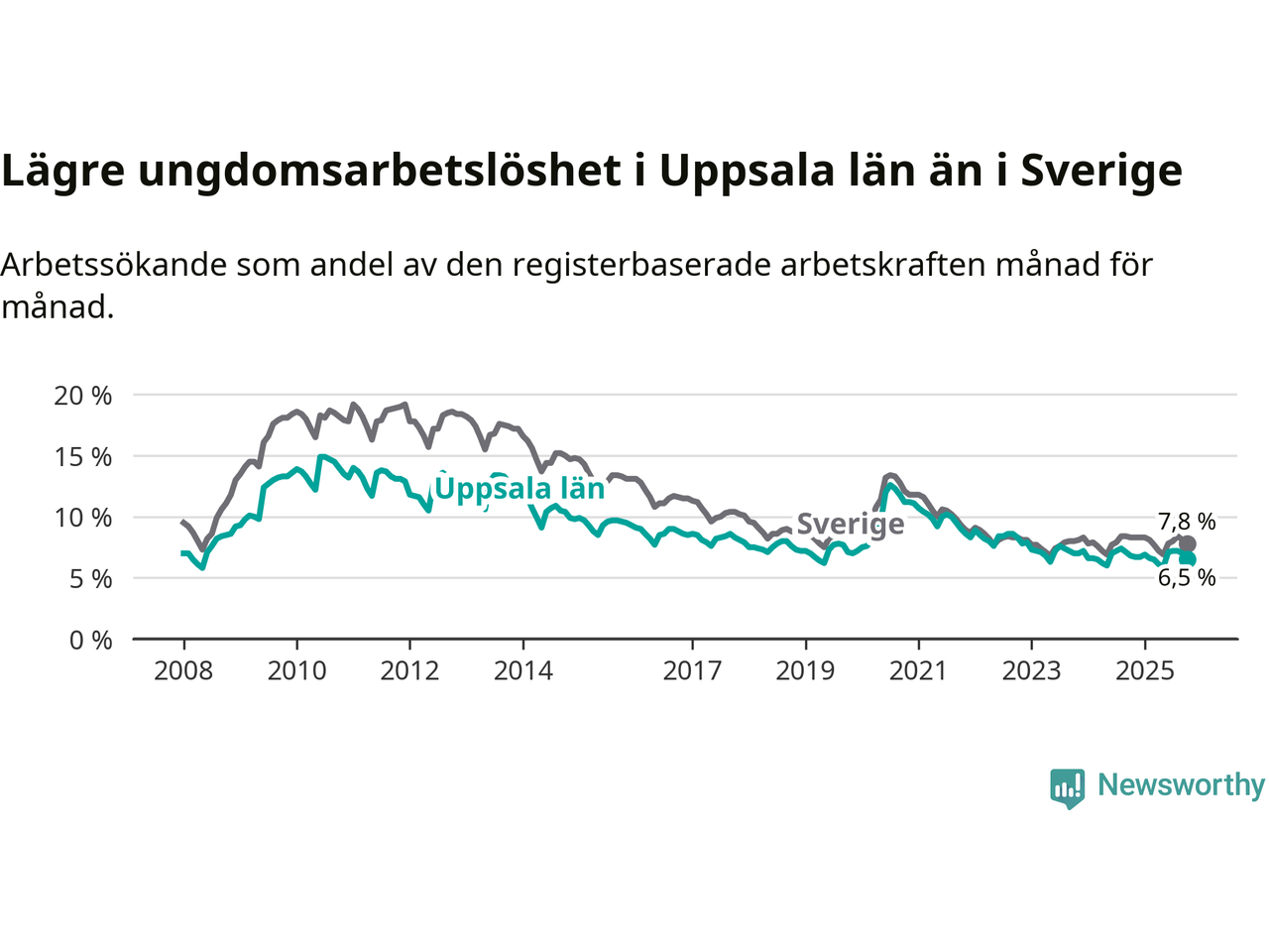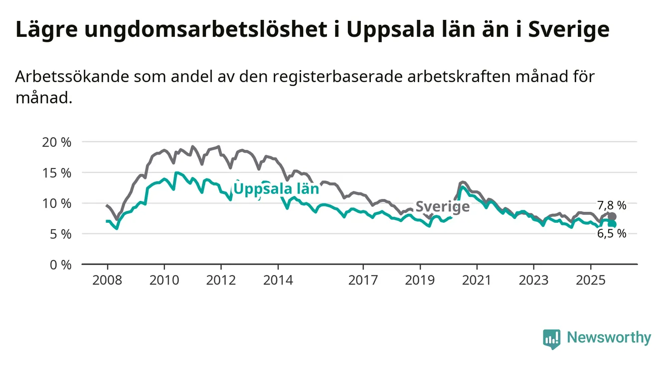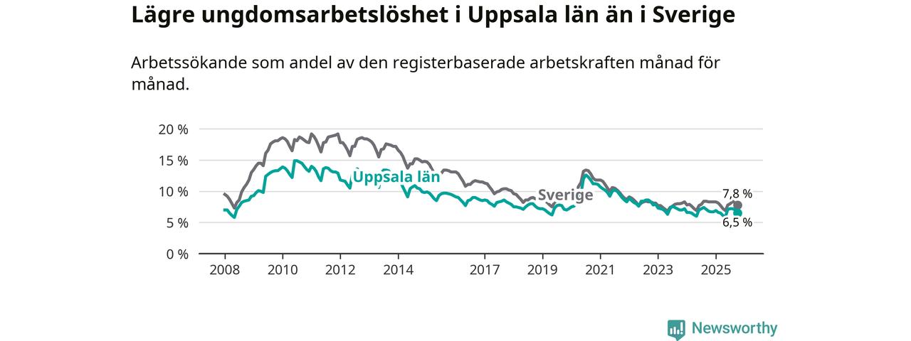 Precis som den totala arbetslösheten ligger ungdomsarbetslösheten i Uppsala lägre än i Sverige som helhet. Skillnaden mellan länet och riket är 1,3 procentenheter.