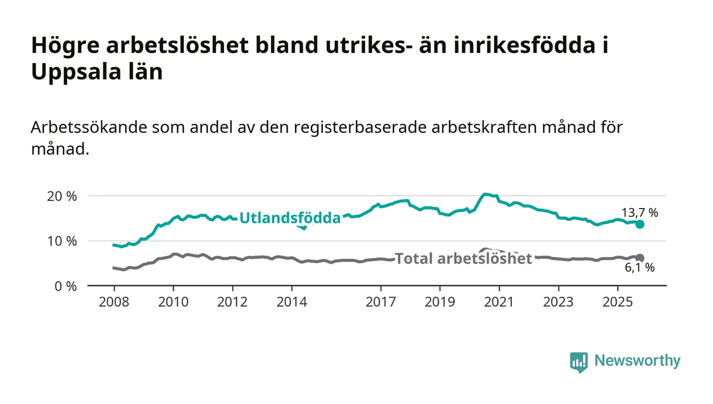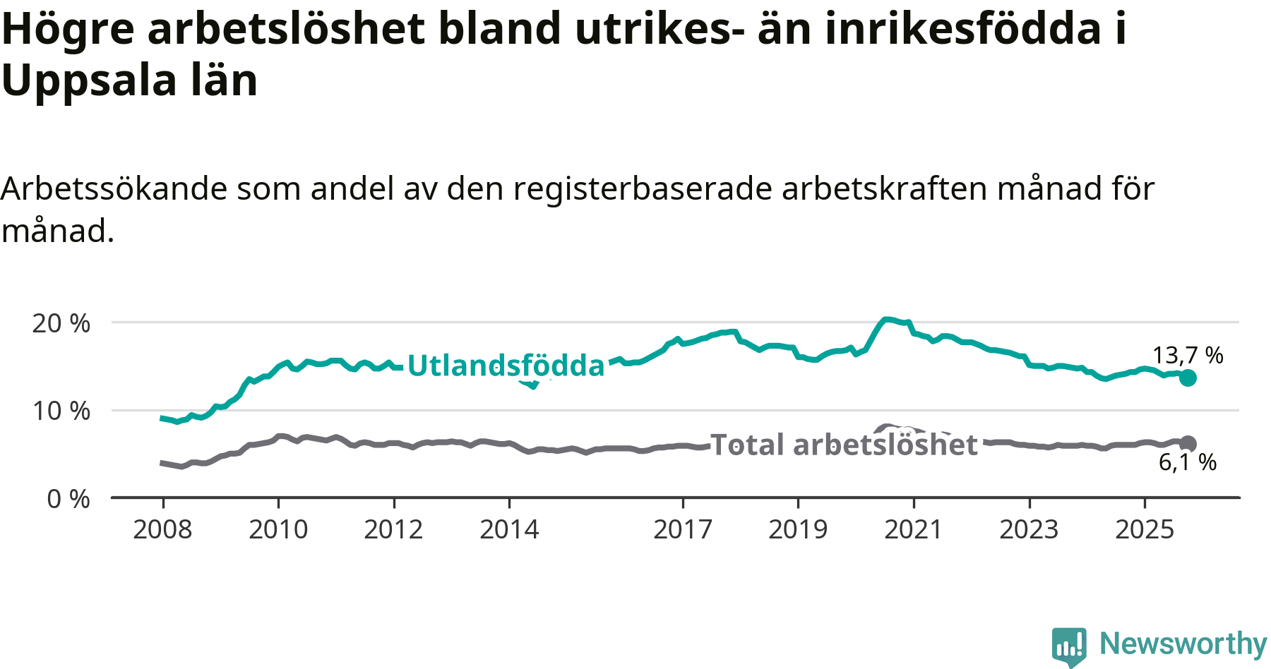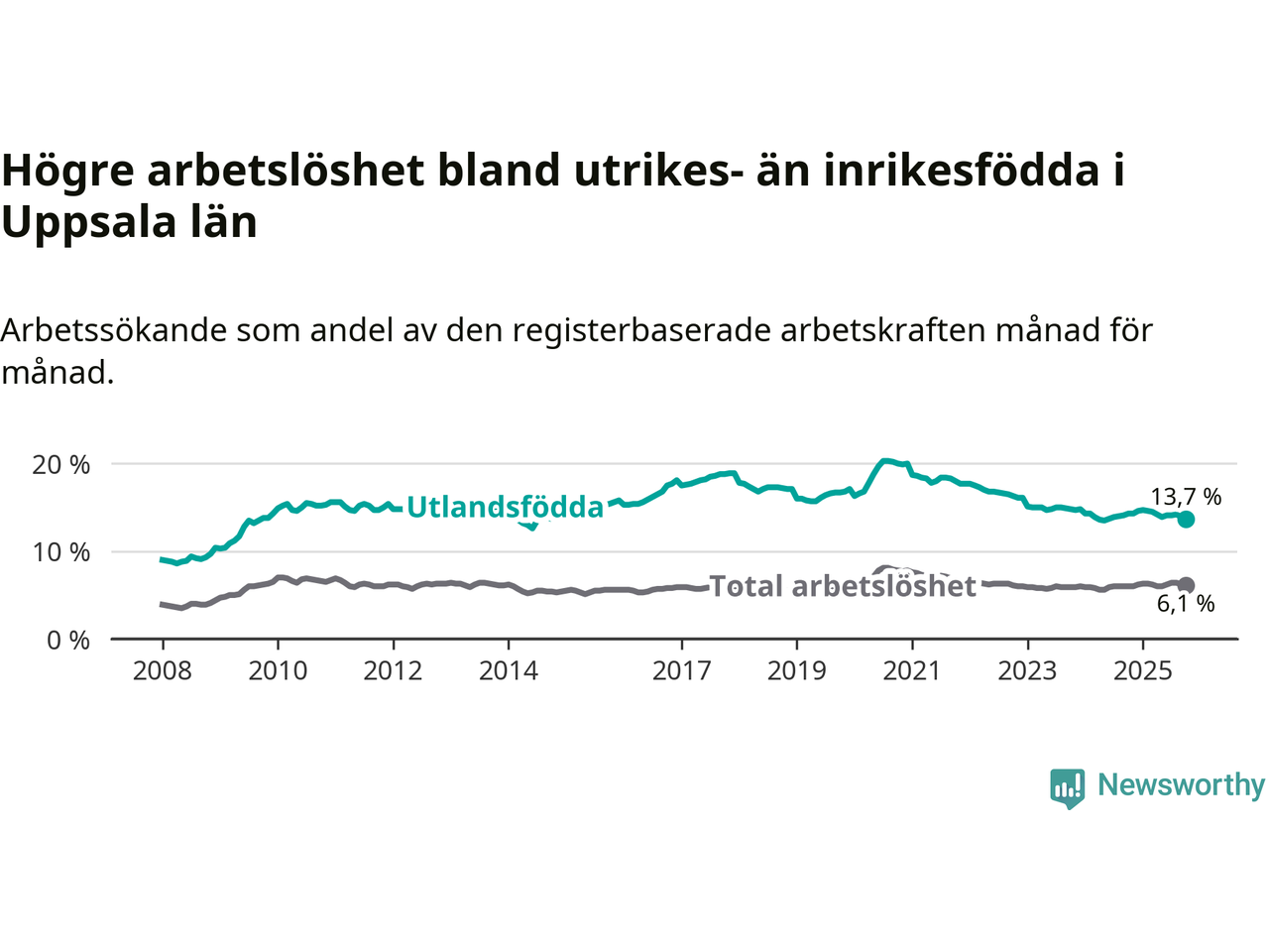 Arbetslösheten bland utlandsfödda var 13,7 procent i Uppsala under oktober månad, motsvarande 6 621 av 48 328 personer. Det är 0,6 procentenheter färre än vid samma tidpunkt i fjol (−145 om man räknar personer).