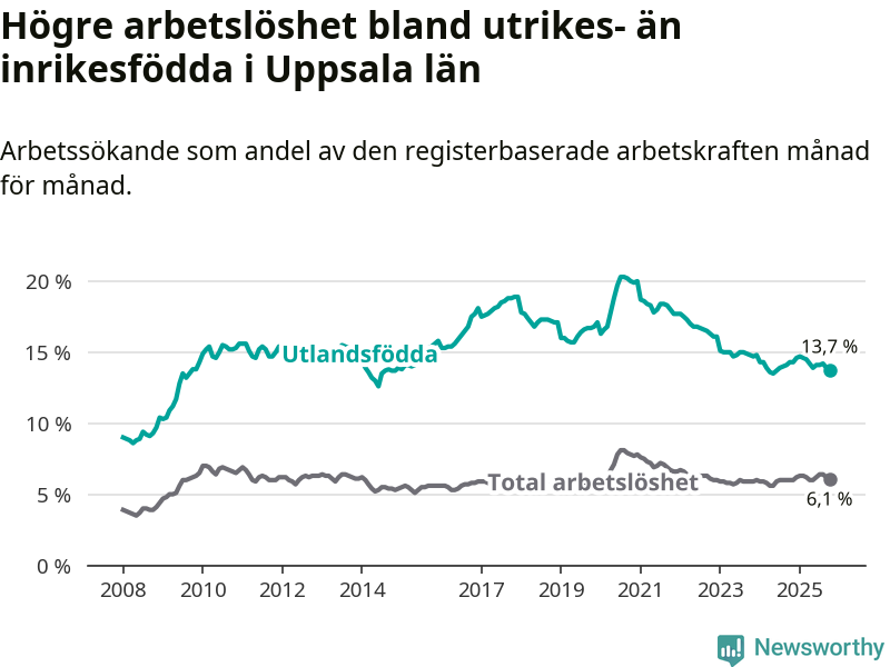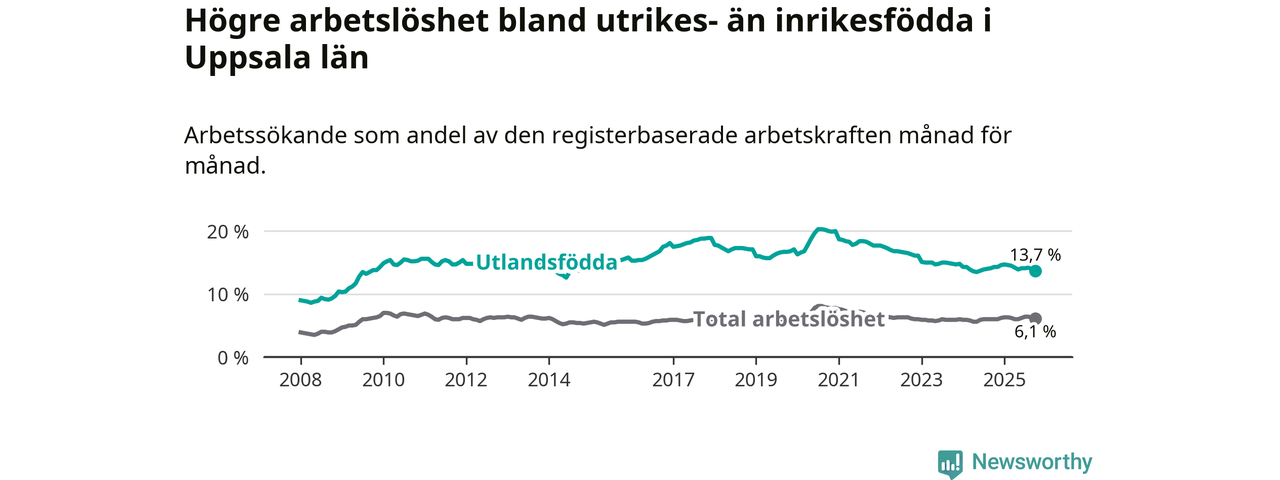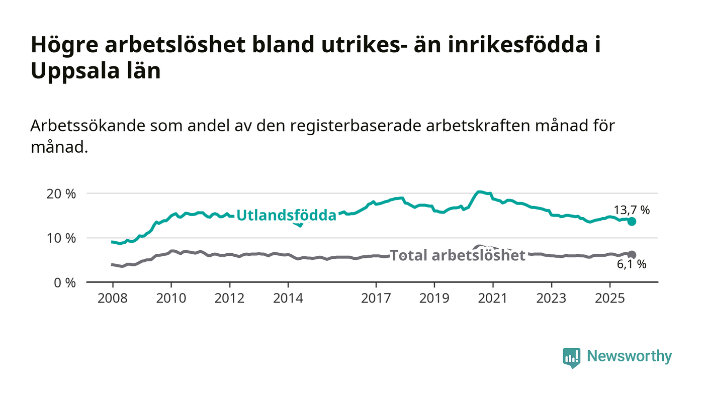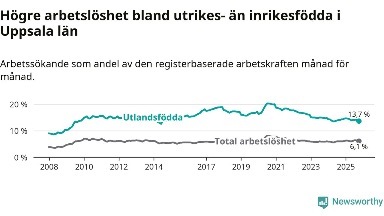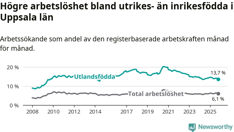 Arbetslösheten bland utlandsfödda var 13,7 procent i Uppsala under oktober månad, motsvarande 6 621 av 48 328 personer. Det är 0,6 procentenheter färre än vid samma tidpunkt i fjol (−145 om man räknar personer).