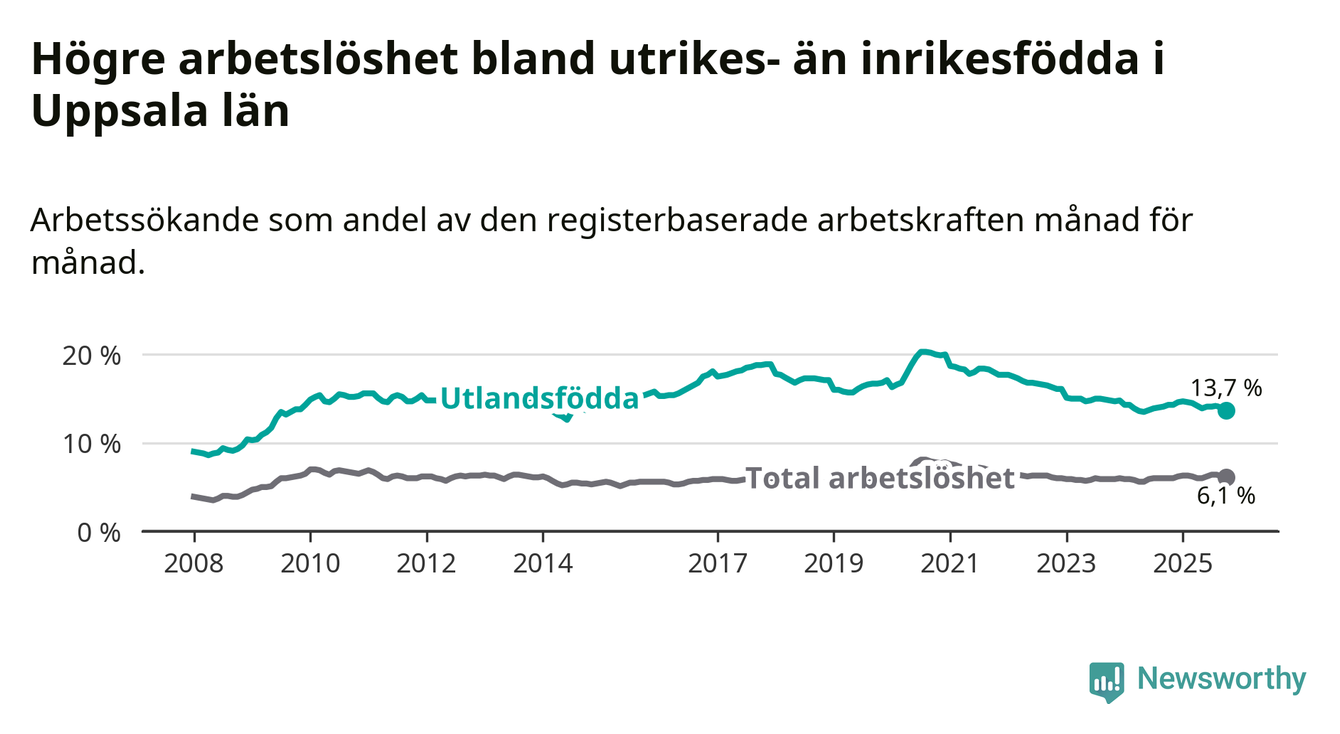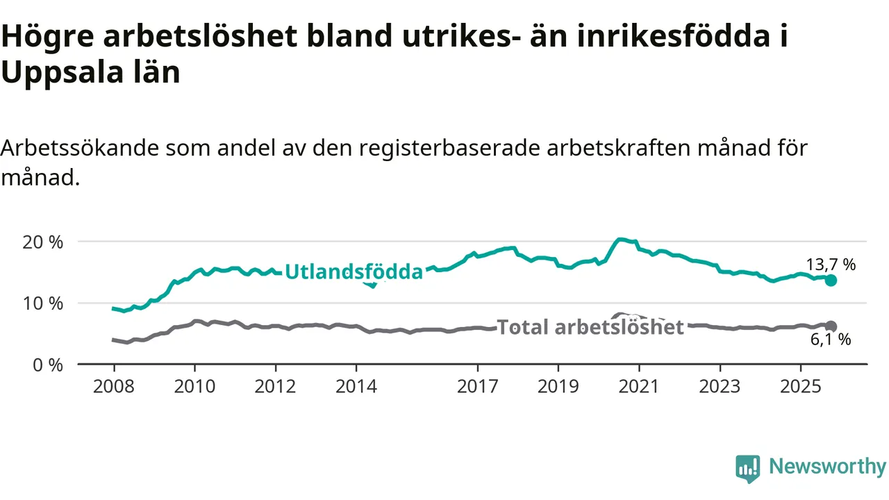 Skillnaden i arbetslöshet mellan utrikesfödda och hela befolkningen är 7,6 procentenheter i Uppsala. Det är en mindre skillnad än för ett år sedan (−0,7 procentenheter).