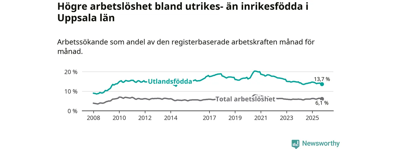 Den senaste månadsstatistiken från Arbetsförmedlingen visar på en nedgång i arbetslöshet bland utlandsfödda i Uppsala län med 0,6 procentenheter. Arbetslösheten bland invånare födda i ett annat land låg i oktober på 13,7 procent.