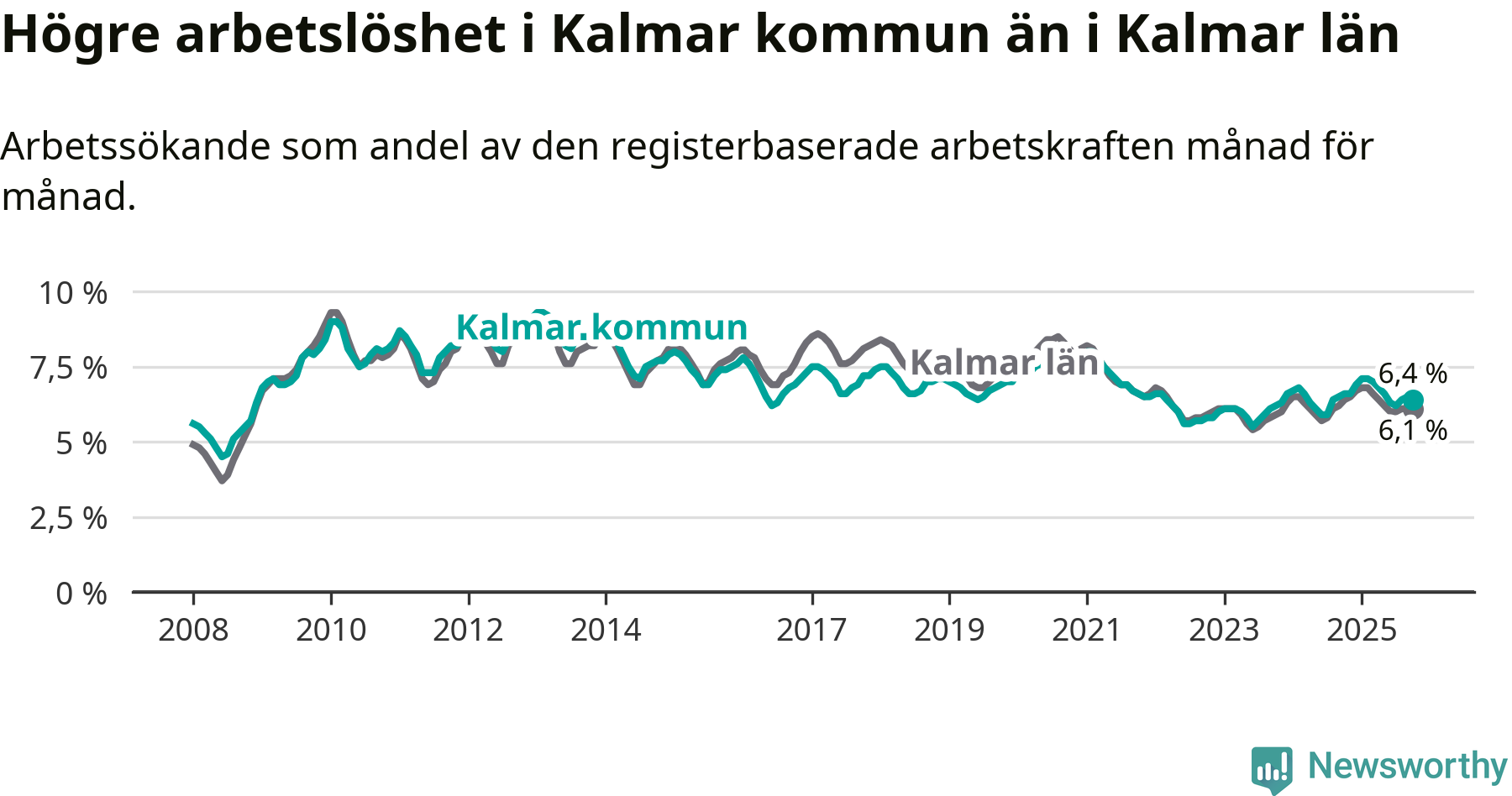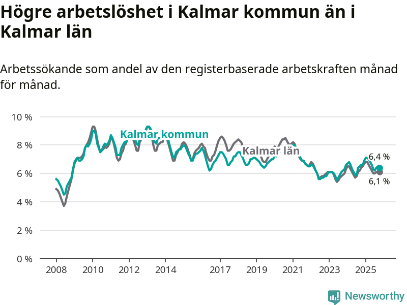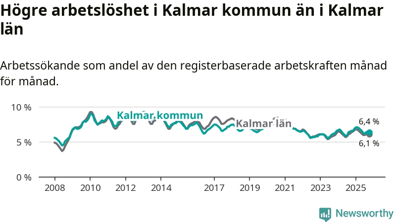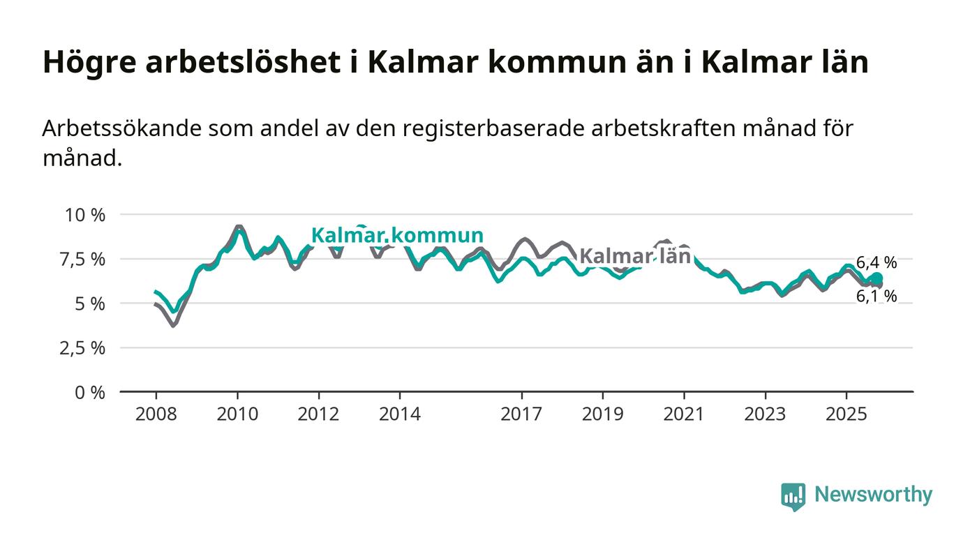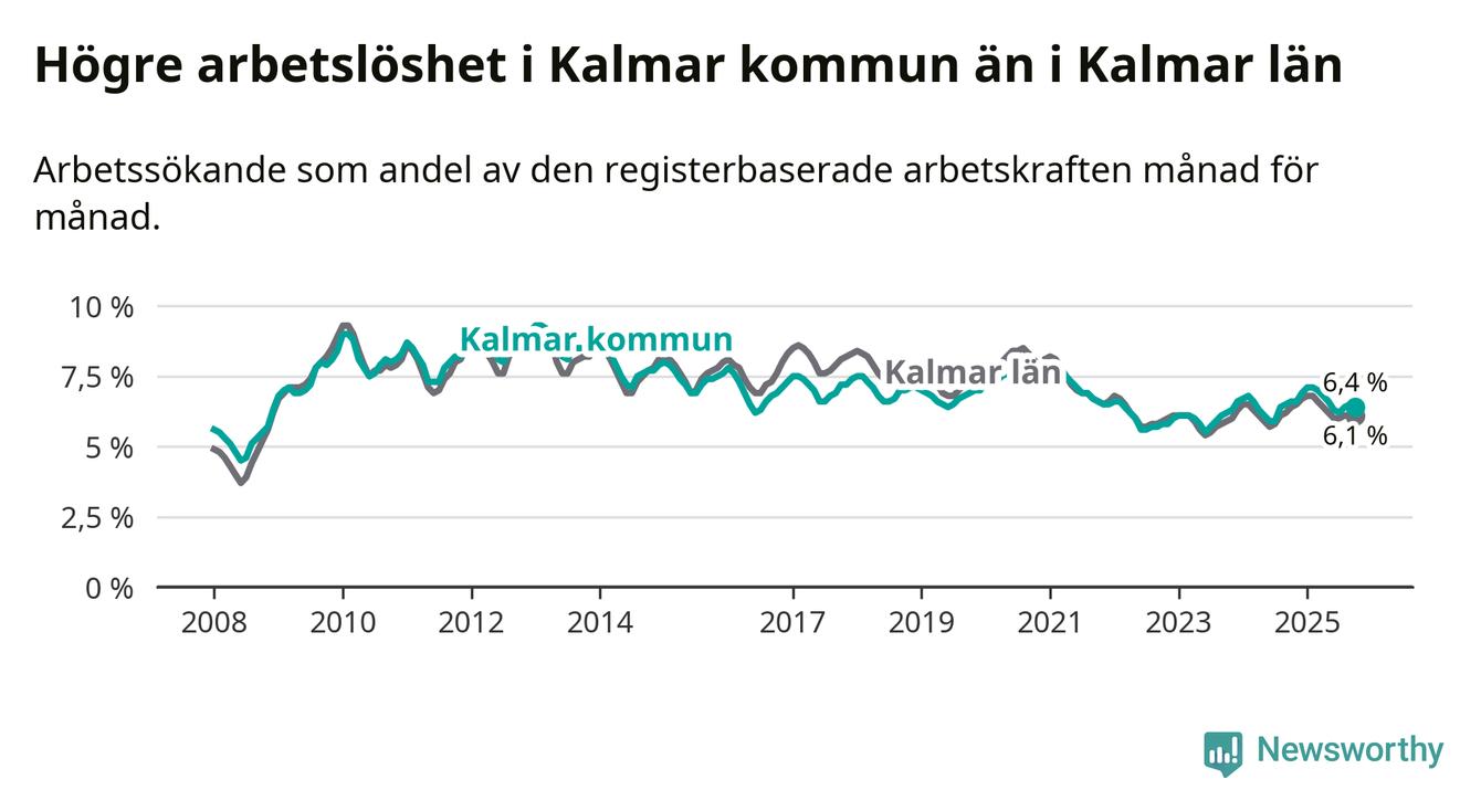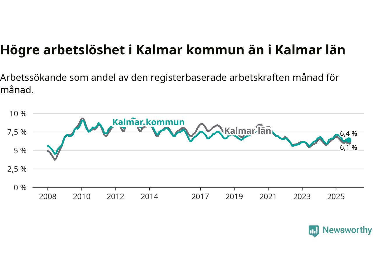 Under oktober månad rapporterade Kalmar kommun en total arbetslöshet på 6,4 procent. Det är en minskning jämfört med samma tidpunkt i fjol (−0,2 procentenheter). Även i Kalmar län sjunker arbetslösheten .