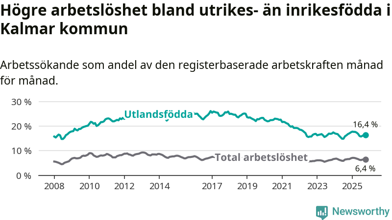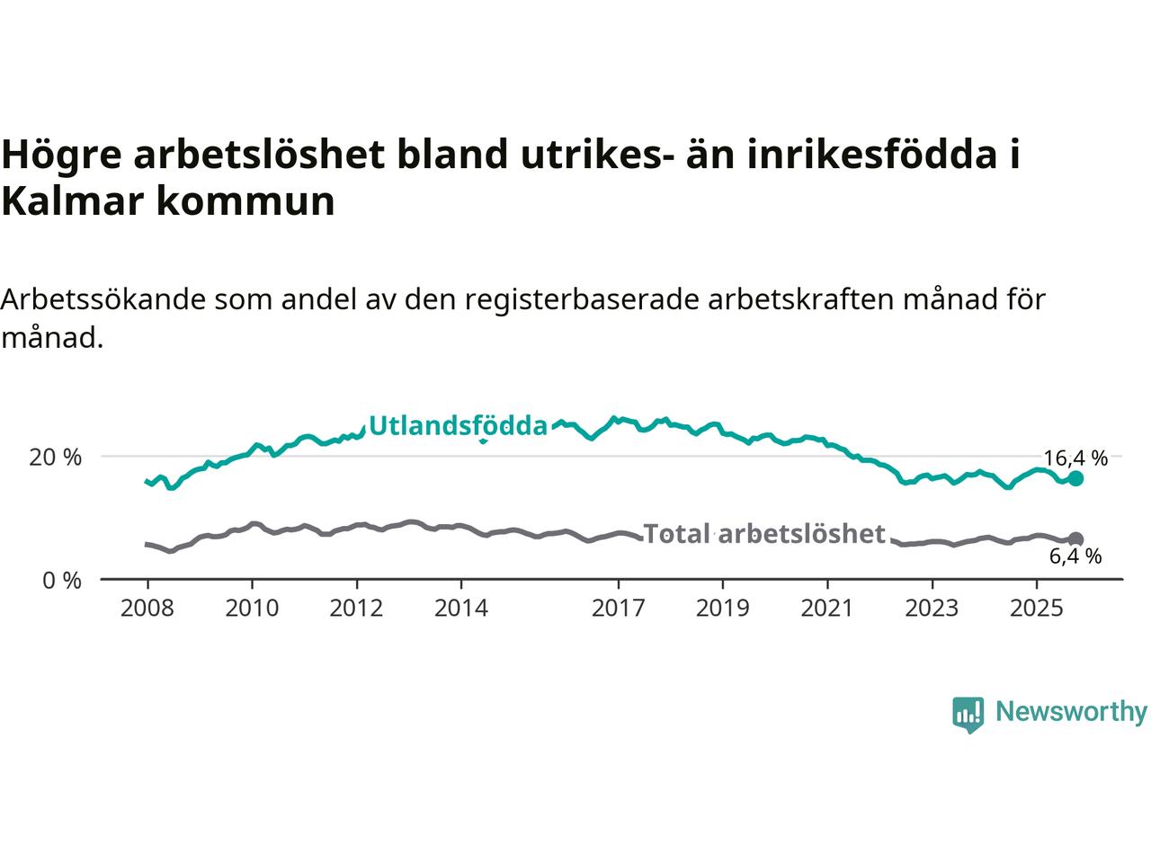Arbetslösheten bland utlandsfödda var 16,4 procent i Kalmar under oktober månad, motsvarande 1 179 av 7 189 personer. Det är 0,4 procentenheter färre än vid samma tidpunkt i fjol (−9 om man räknar personer). Den senaste månadens nedgång innebär ett trendbrott. Under de nio föregående månaderna hade arbetslösheten bland utlandsfödda varit högre än motsvarande tidpunkt året innan.