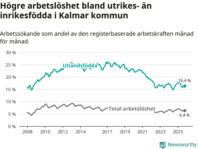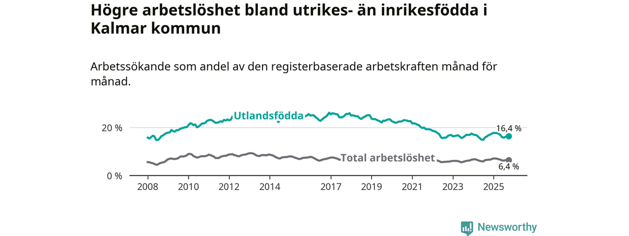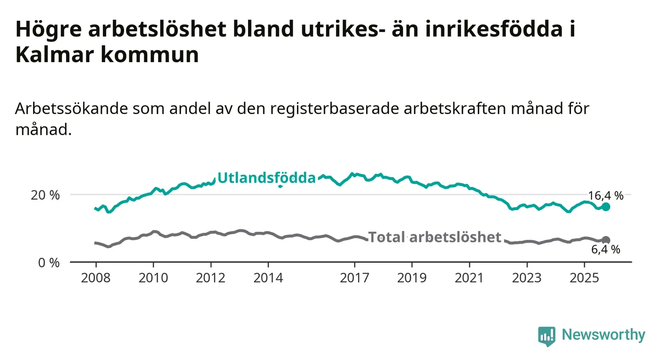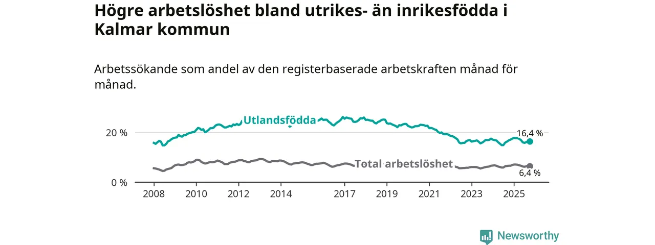 Sedan december 2024 har arbetslösheten bland utlandsfödda i Kalmar kommun ökat, men i oktober vände utvecklingen då andelen arbetslösa sjönk jämfört med året innan.
