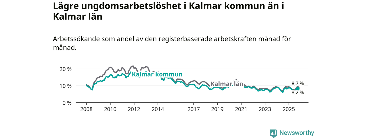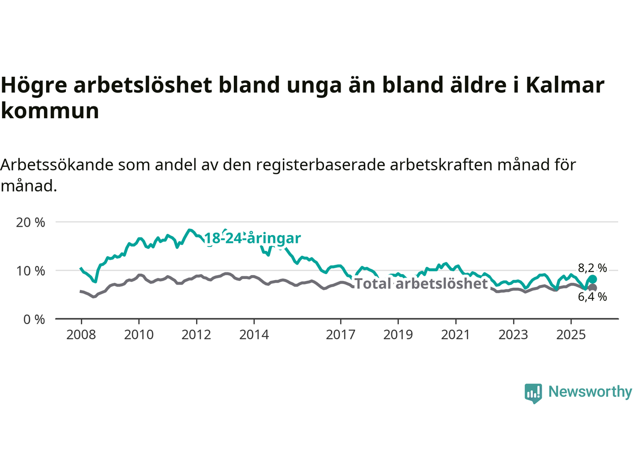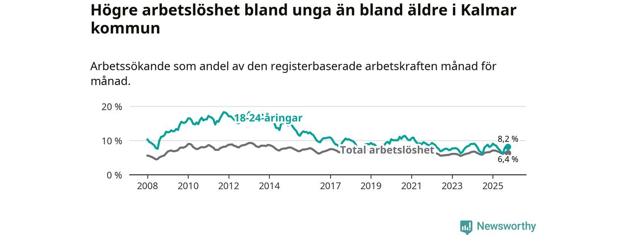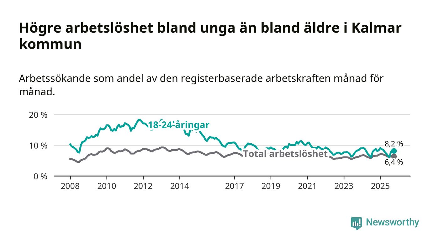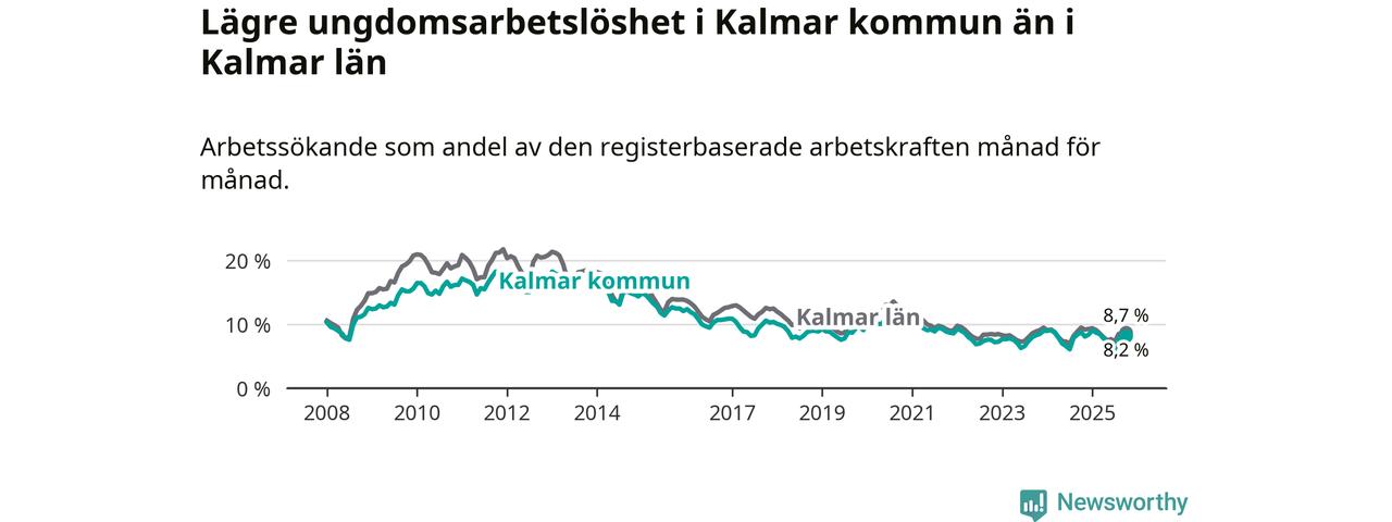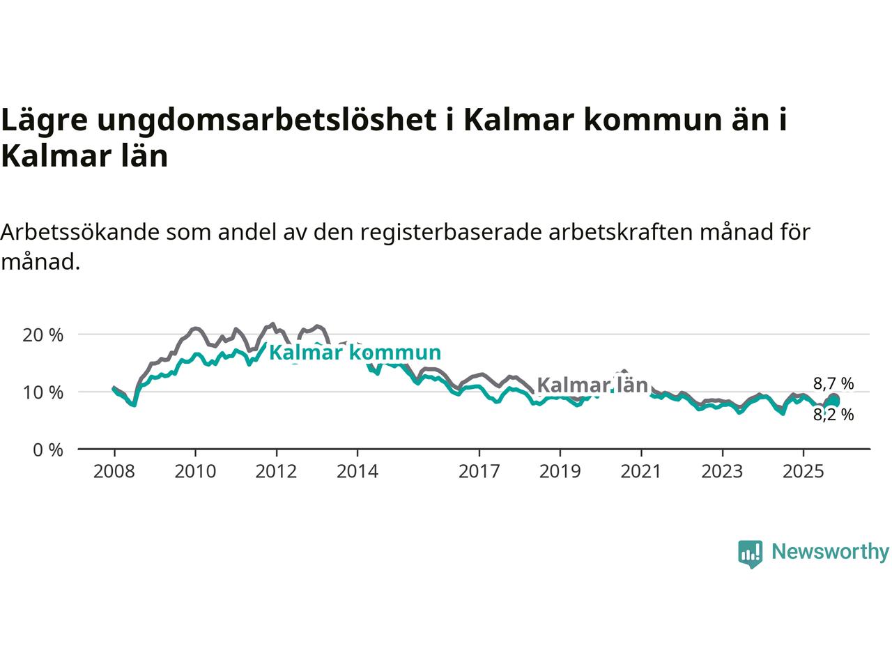 Medan Kalmar har högre total arbetslöshet än Kalmar län, ligger ungdomsarbetslösheten 0,5 procentenheter lägre i Kalmar.