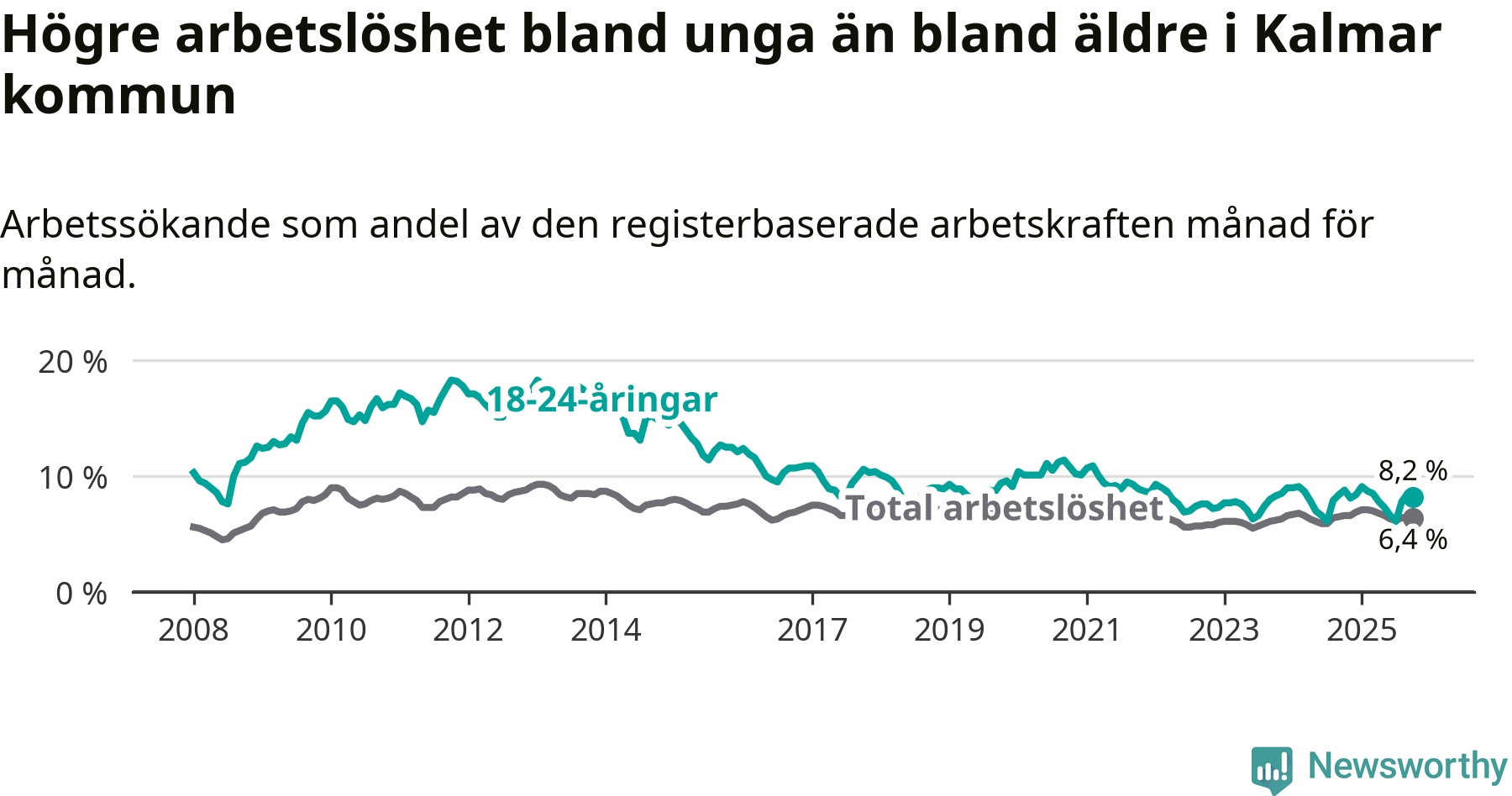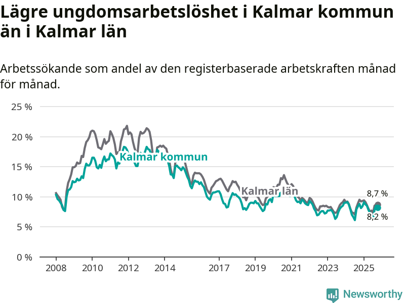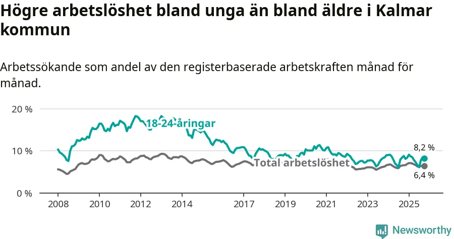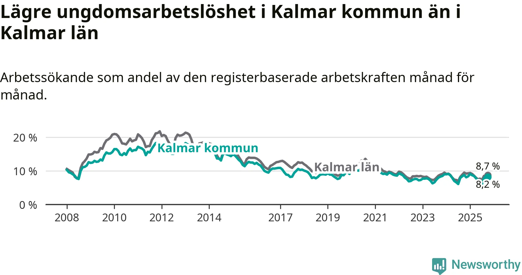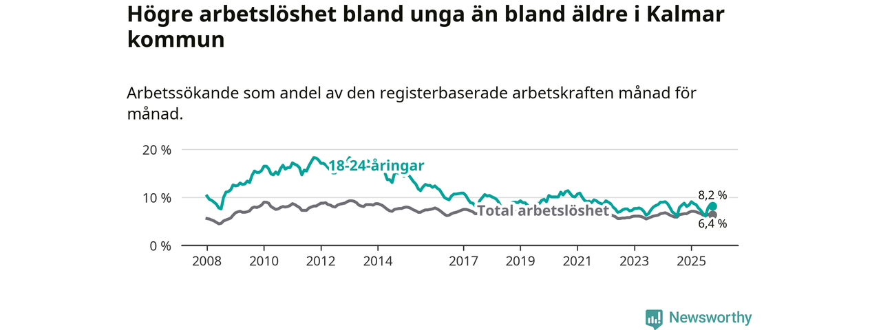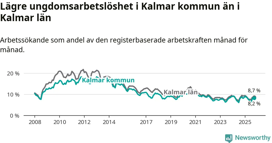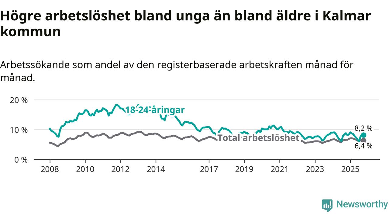 Medan Kalmar har högre total arbetslöshet än Kalmar län, ligger ungdomsarbetslösheten 0,5 procentenheter lägre i Kalmar.
