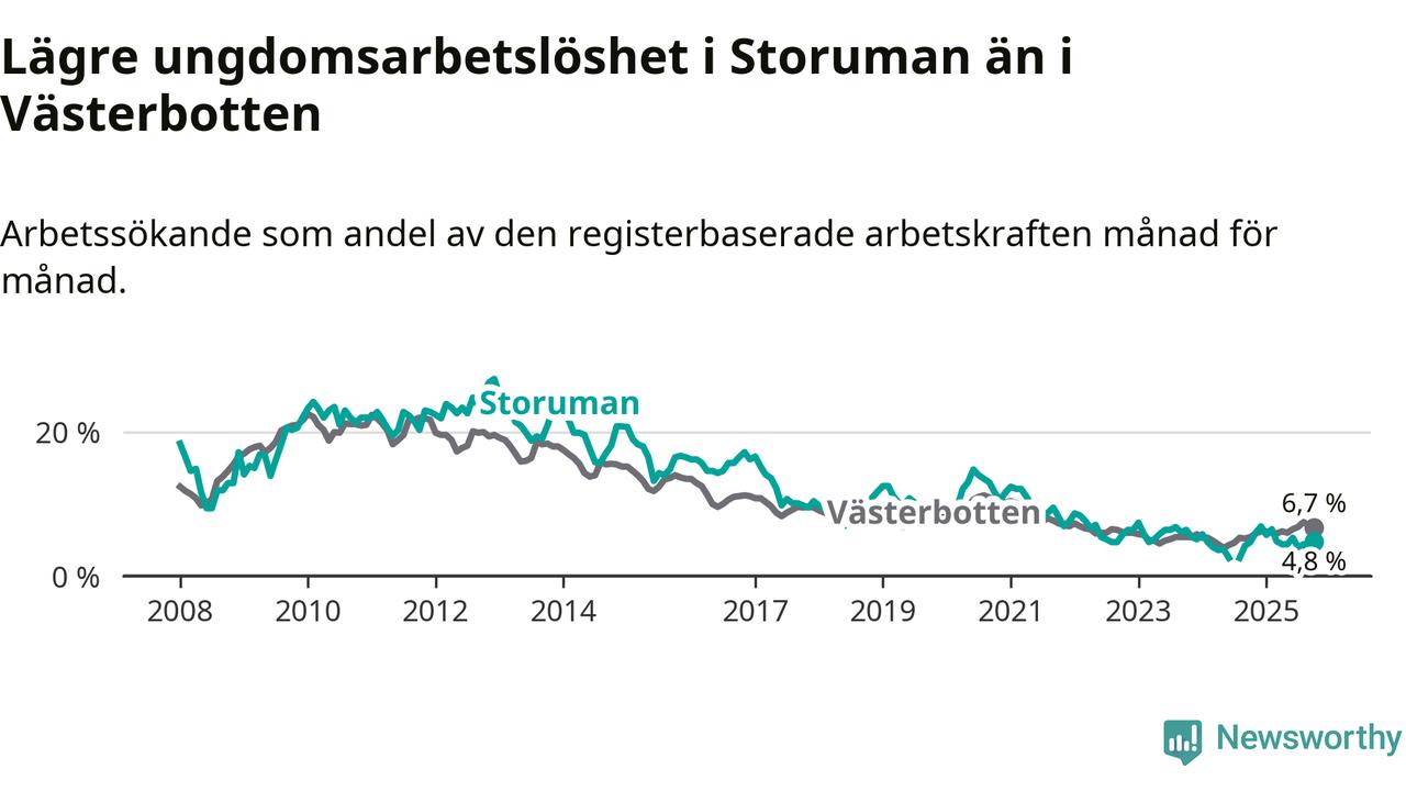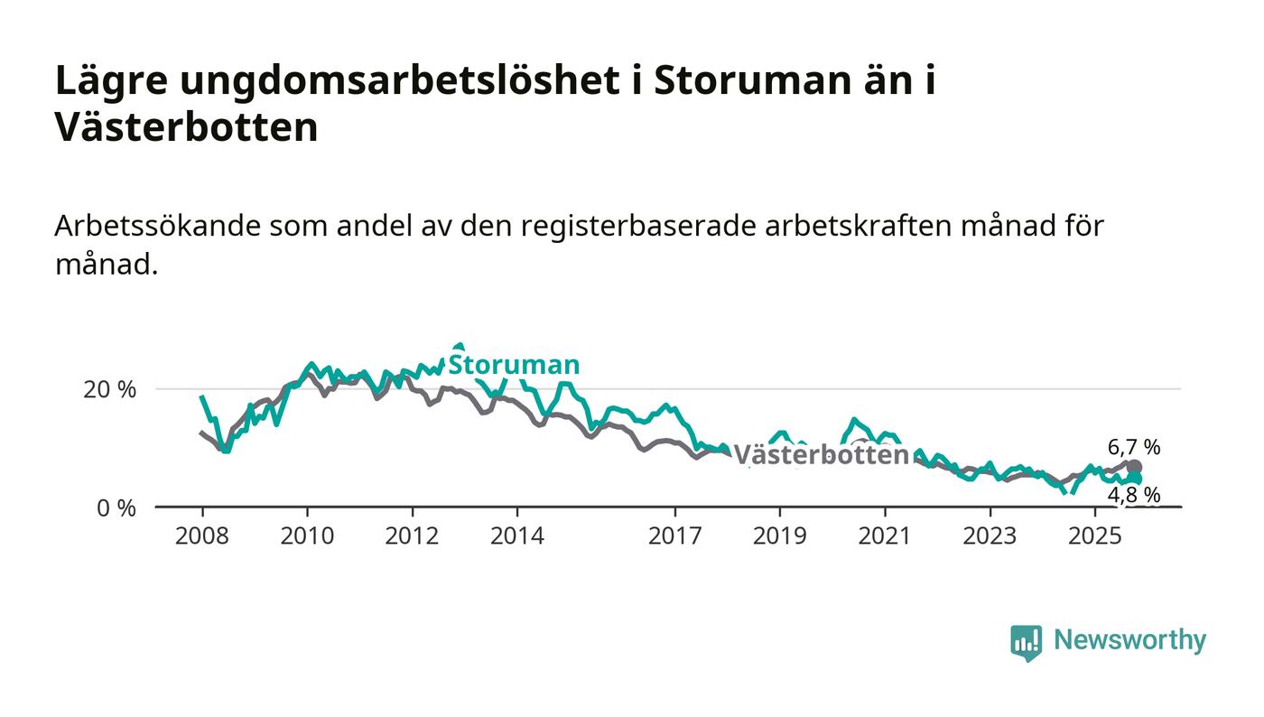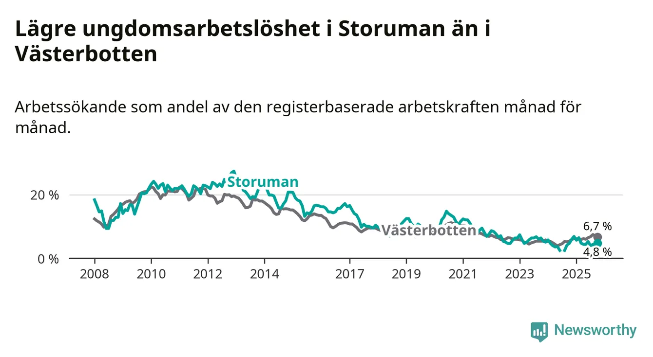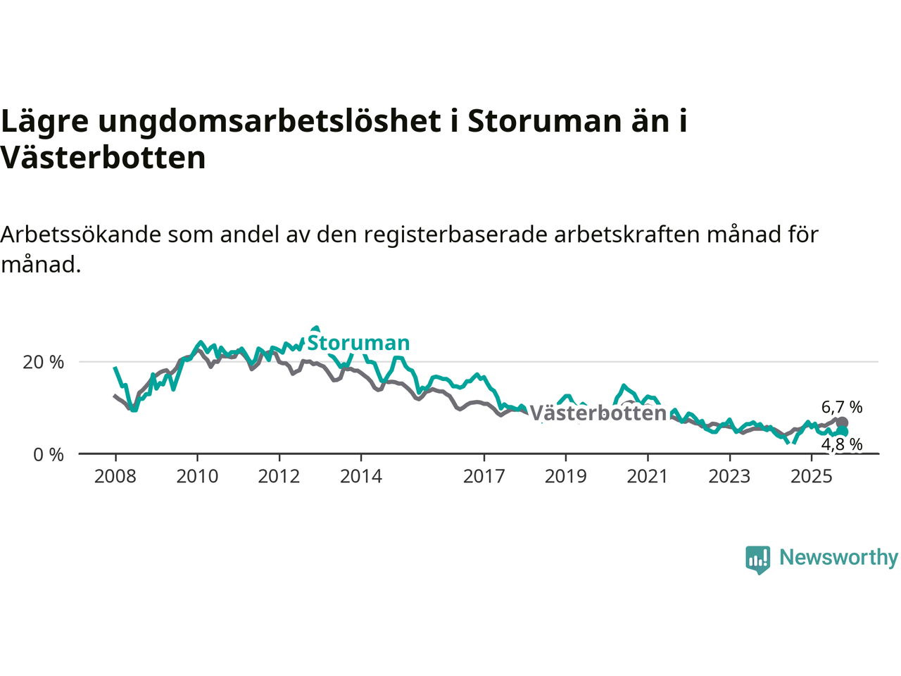Precis som den totala arbetslösheten ligger ungdomsarbetslösheten i Storuman lägre än i Västerbotten som helhet. Skillnaden mellan kommunen och länet är 1,9 procentenheter.