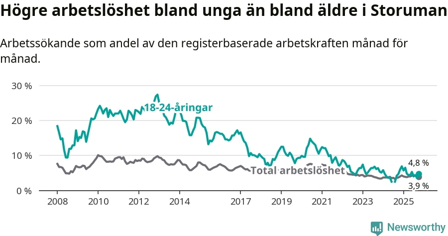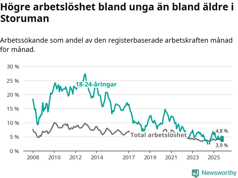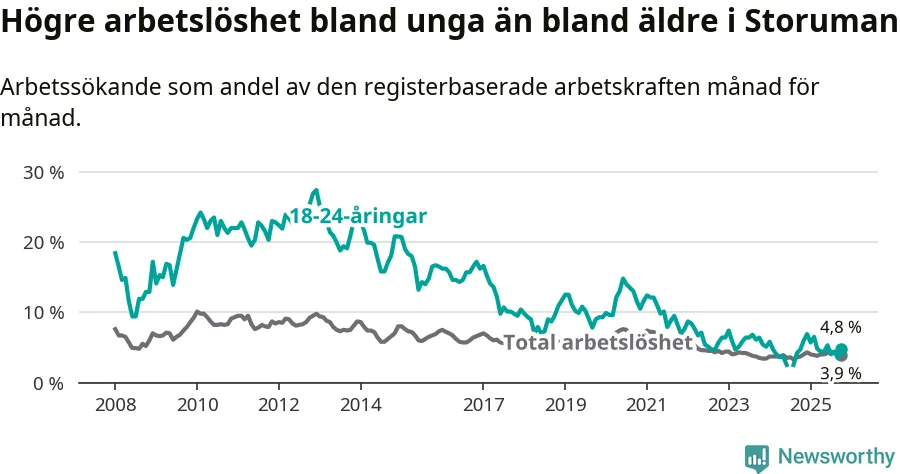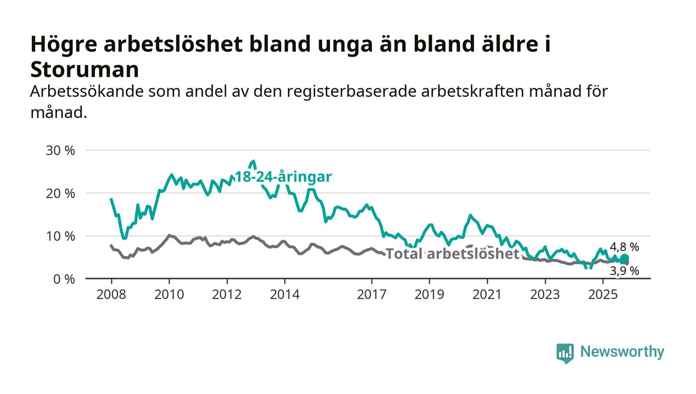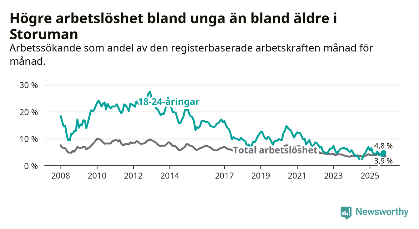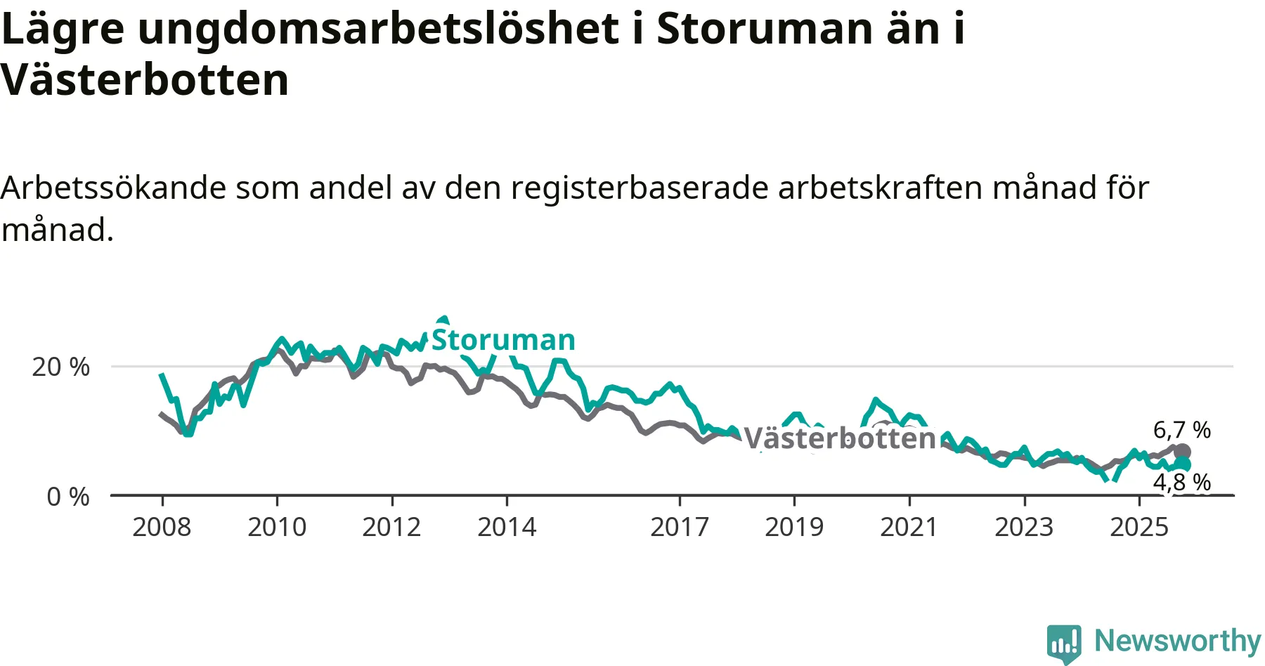 Precis som den totala arbetslösheten ligger ungdomsarbetslösheten i Storuman lägre än i Västerbotten som helhet. Skillnaden mellan kommunen och länet är 1,9 procentenheter.