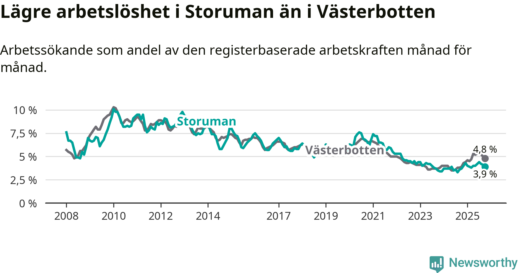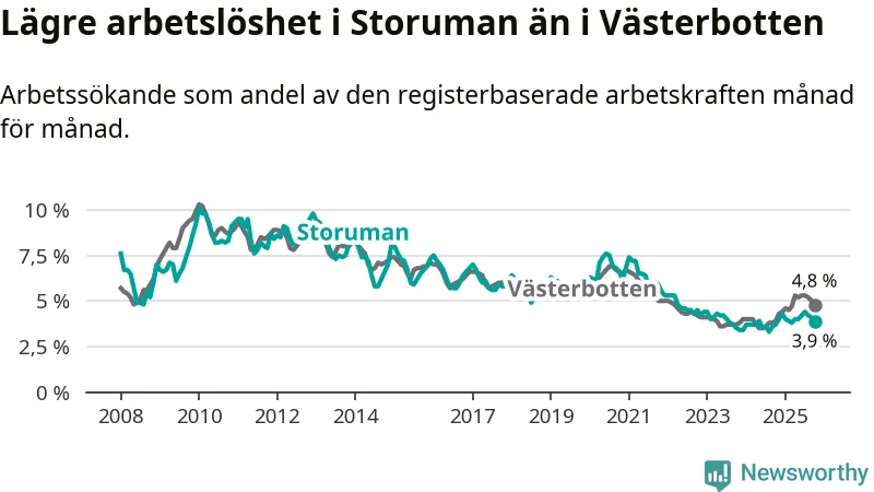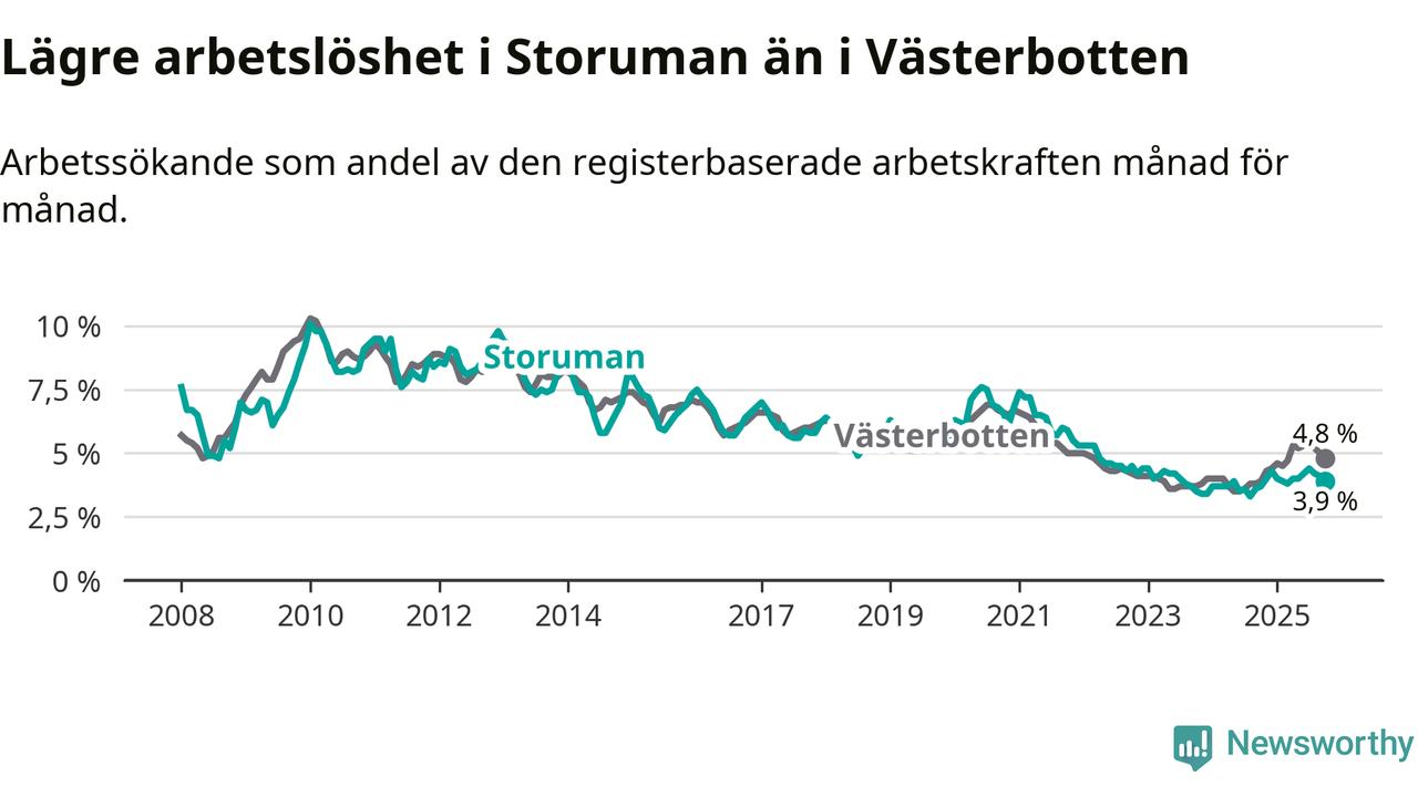 Även om arbetslösheten i Storuman alltså ökar, så ligger den fortfarande under snittet i hela Västerbottens län (3,9 procent i kommunen, jämfört med 4,8 procent i hela länet). Vindeln har den lägsta arbetslösheten i länet (3,1 procent), medan Skellefteå har den högsta (6,5 procent). För att Storuman skulle komma ner i samma arbetslöshetsnivå som Vindeln skulle 20 personer behöva sysselsättas.