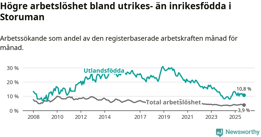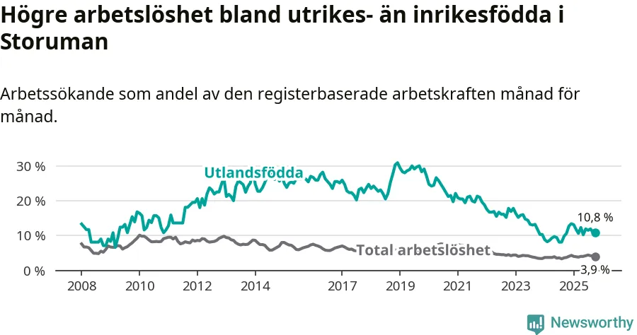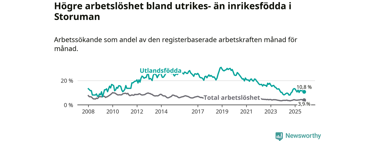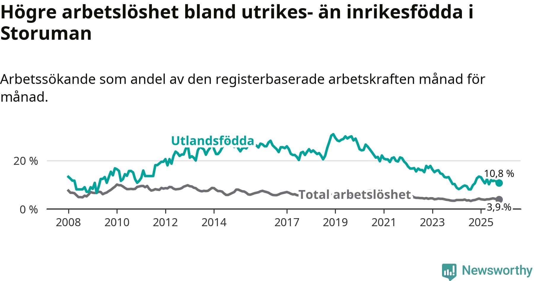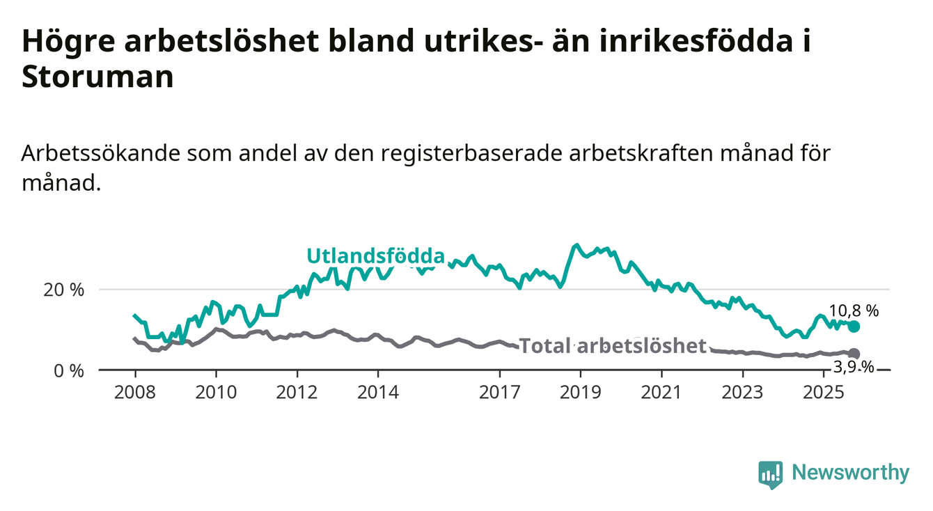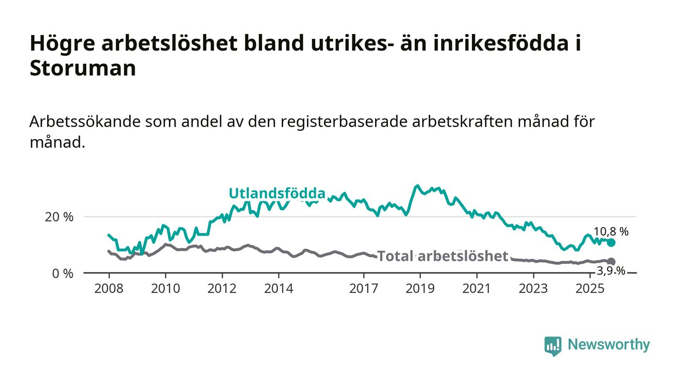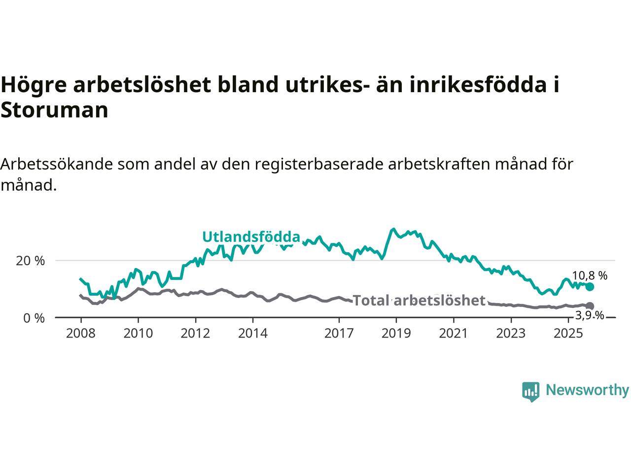 Arbetslösheten bland utlandsfödda var 10,8 procent i Storuman under oktober månad, motsvarande 32 av 296 personer. Det är 0,2 procentenheter fler än vid samma tidpunkt i fjol (+1 om man räknar personer). Därmed är de utlandsföddas arbetslöshet högre än vid samma tidpunkt i fjol för tolfte månaden i följd.
