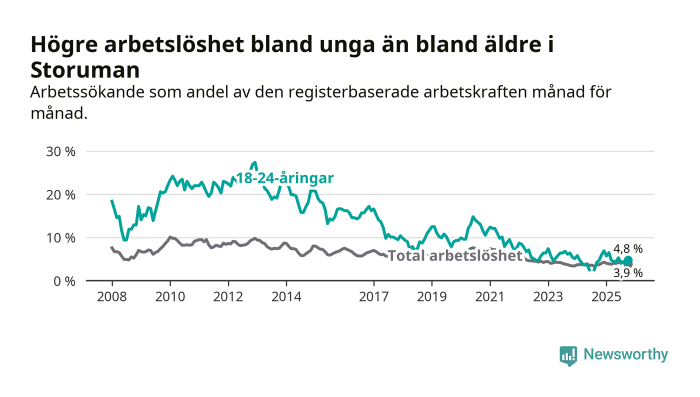 Precis som den totala arbetslösheten stiger arbetslösheten bland unga (+0,1 procentenheter). I oktober var 4,8 procent av 18–24-åringarna inskrivna som arbetssökande (motsvarande elva personer). Mäter vi antalet inskrivna har det däremot inte skett någon förändring.