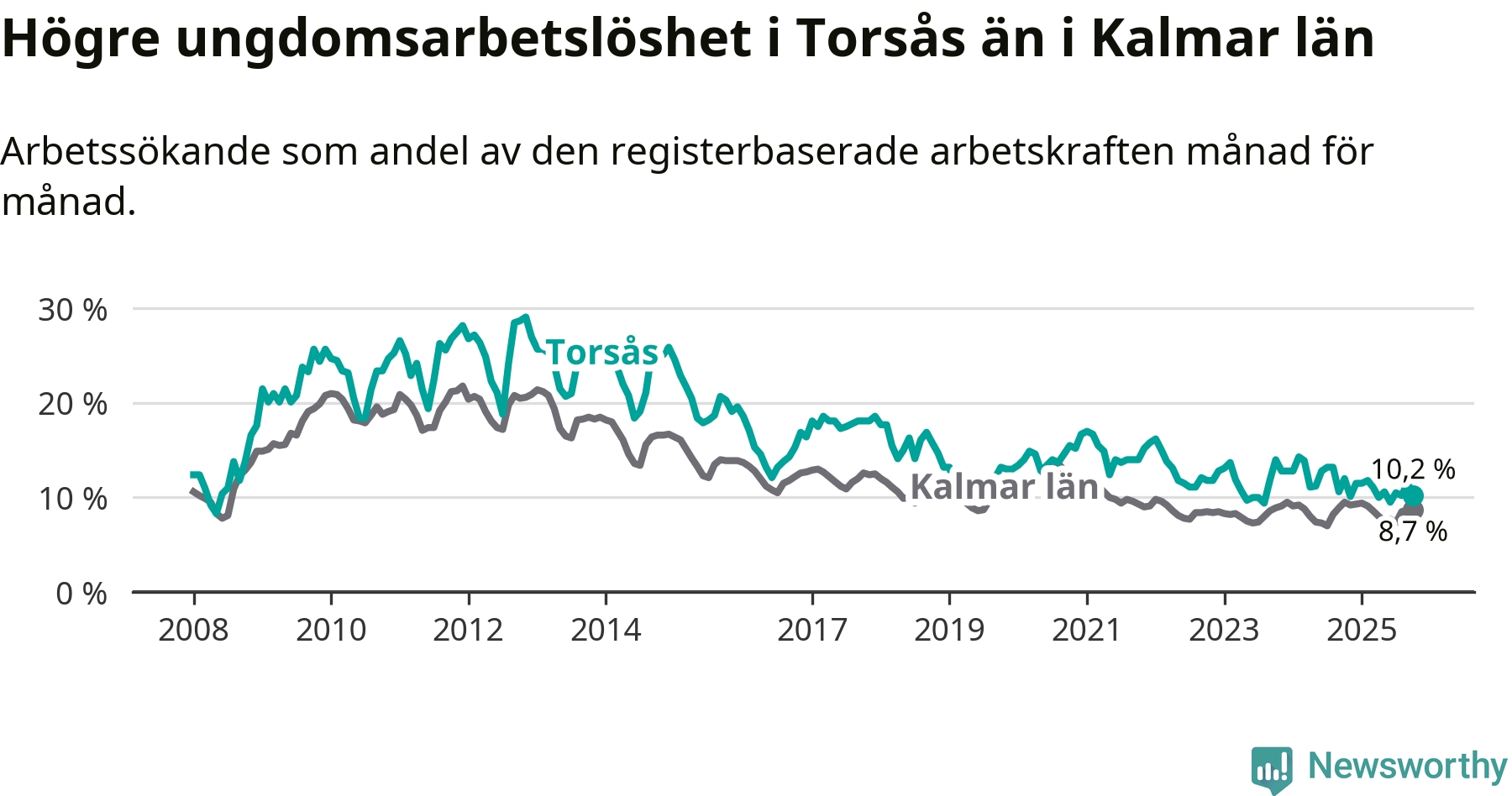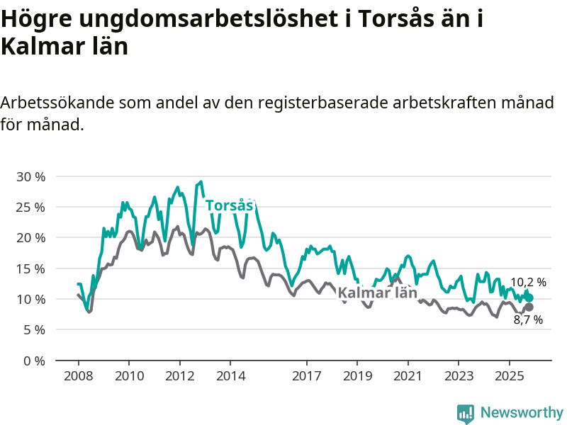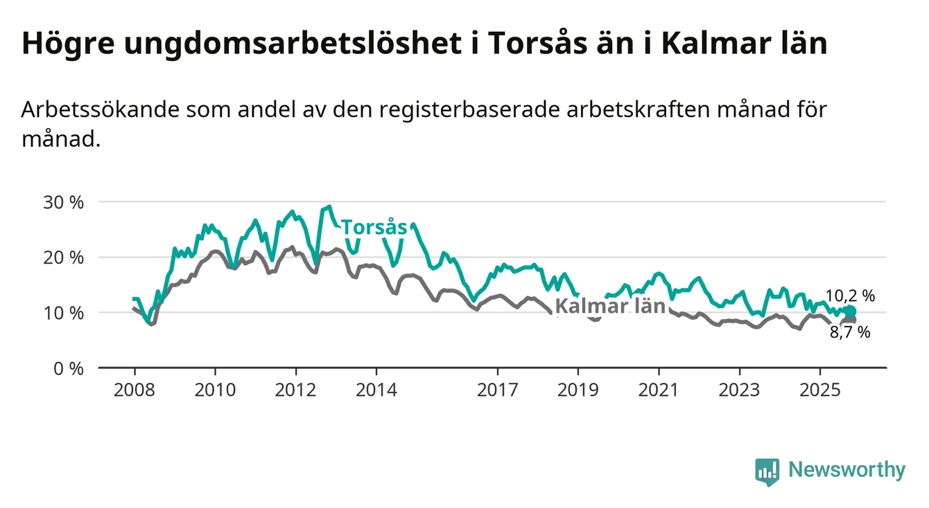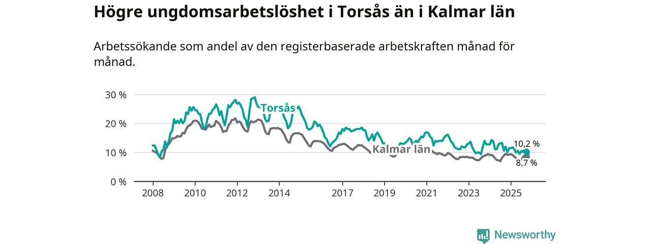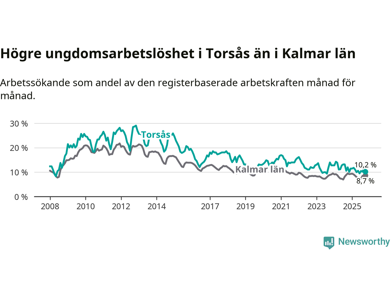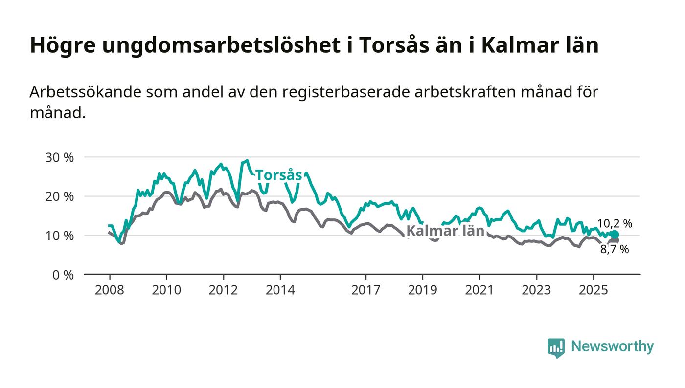 Medan Torsås har ungefär samma total arbetslöshet som Kalmar län, ligger ungdomsarbetslösheten 1,5 procentenheter högre i Torsås.