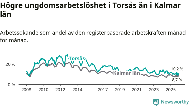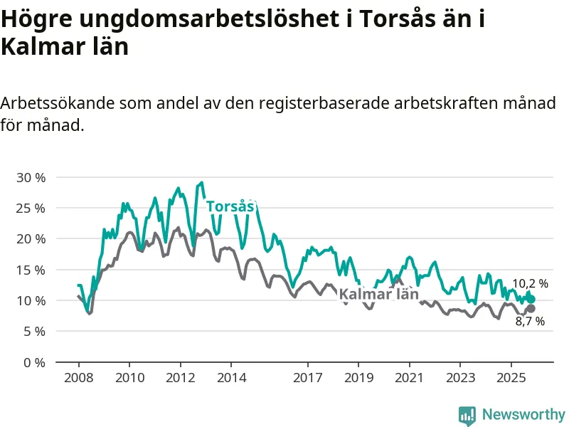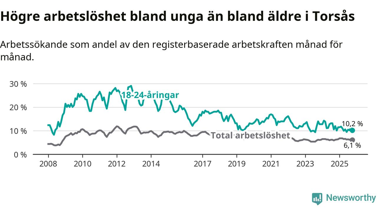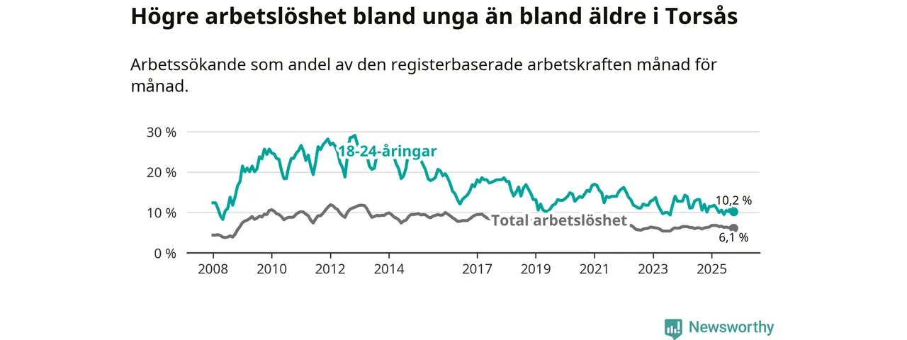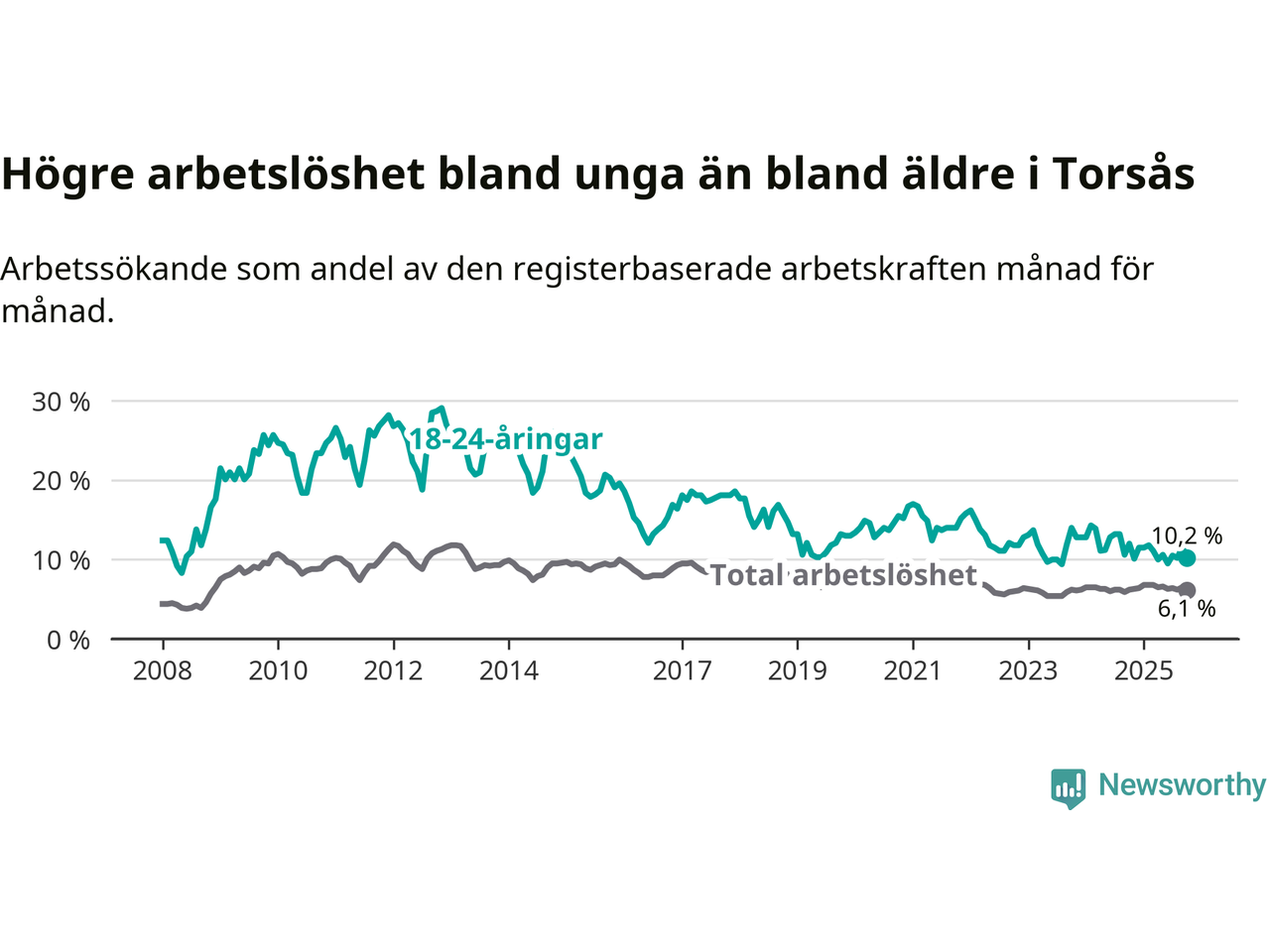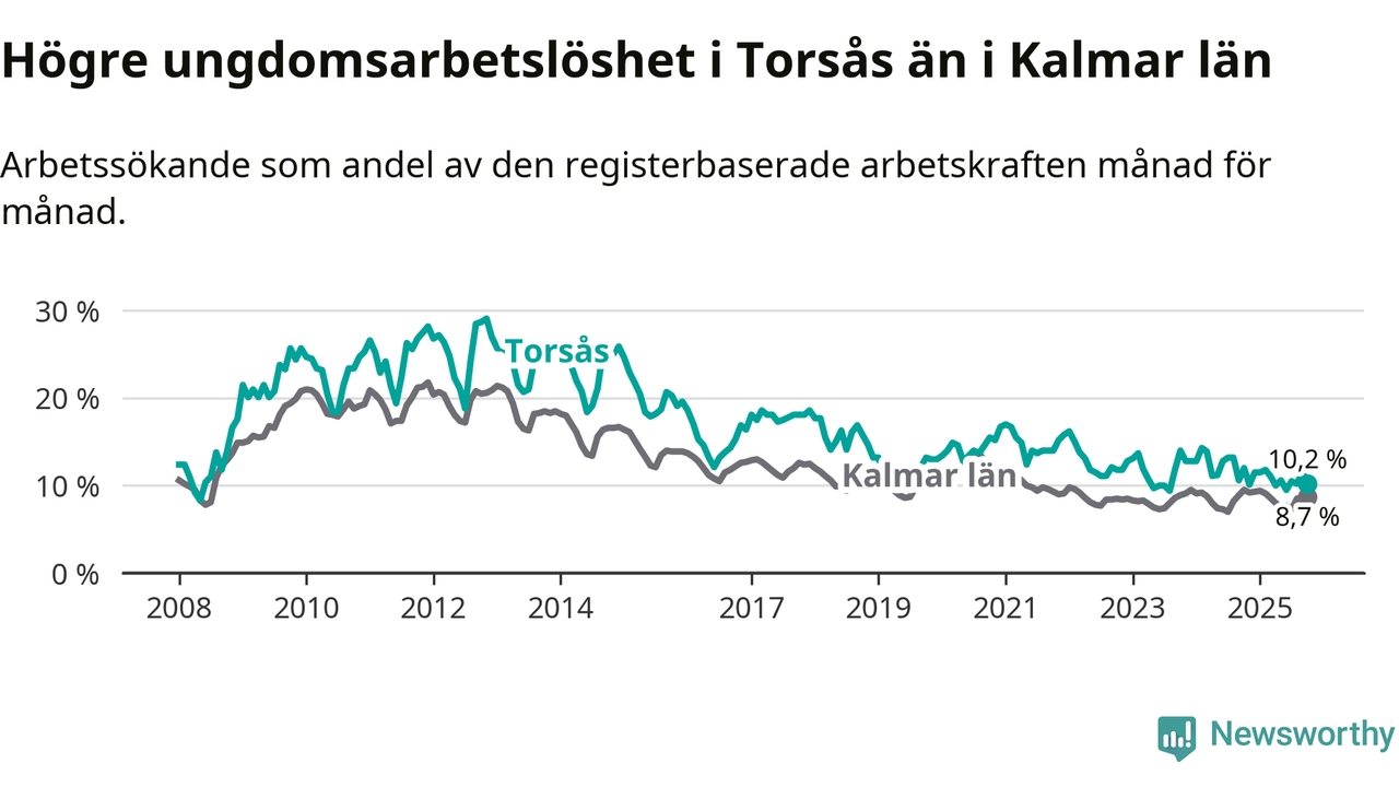 Medan Torsås har ungefär samma total arbetslöshet som Kalmar län, ligger ungdomsarbetslösheten 1,5 procentenheter högre i Torsås.