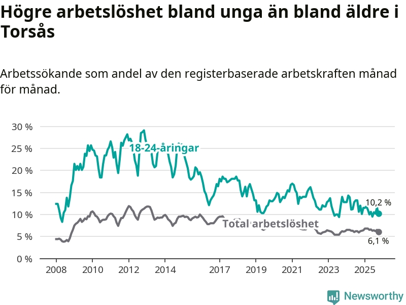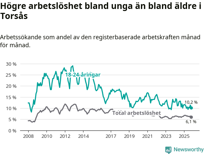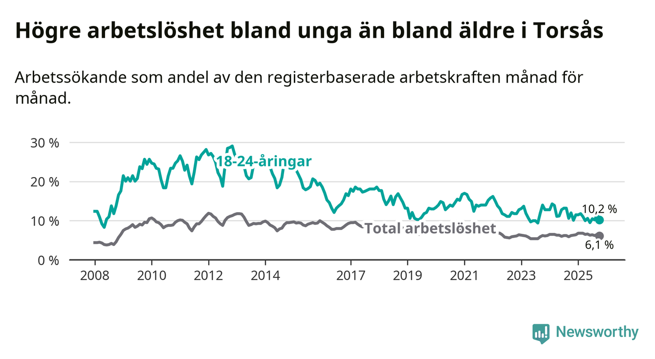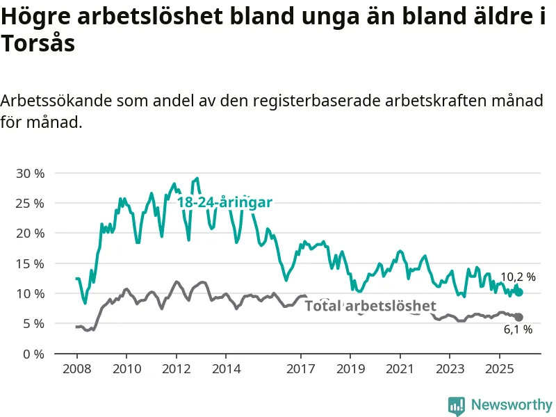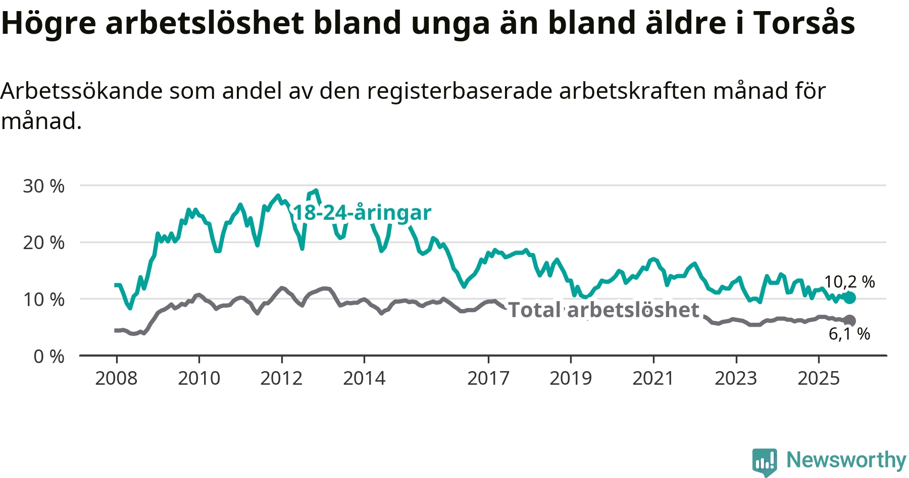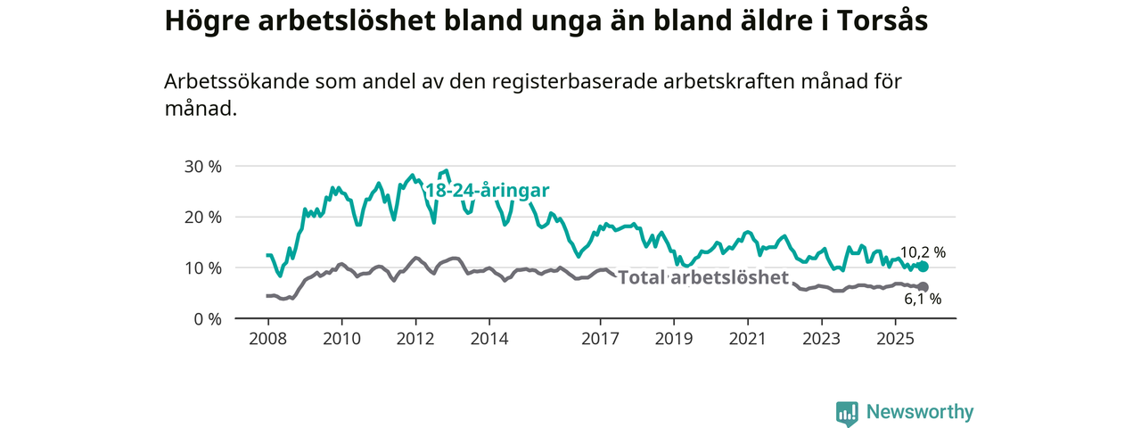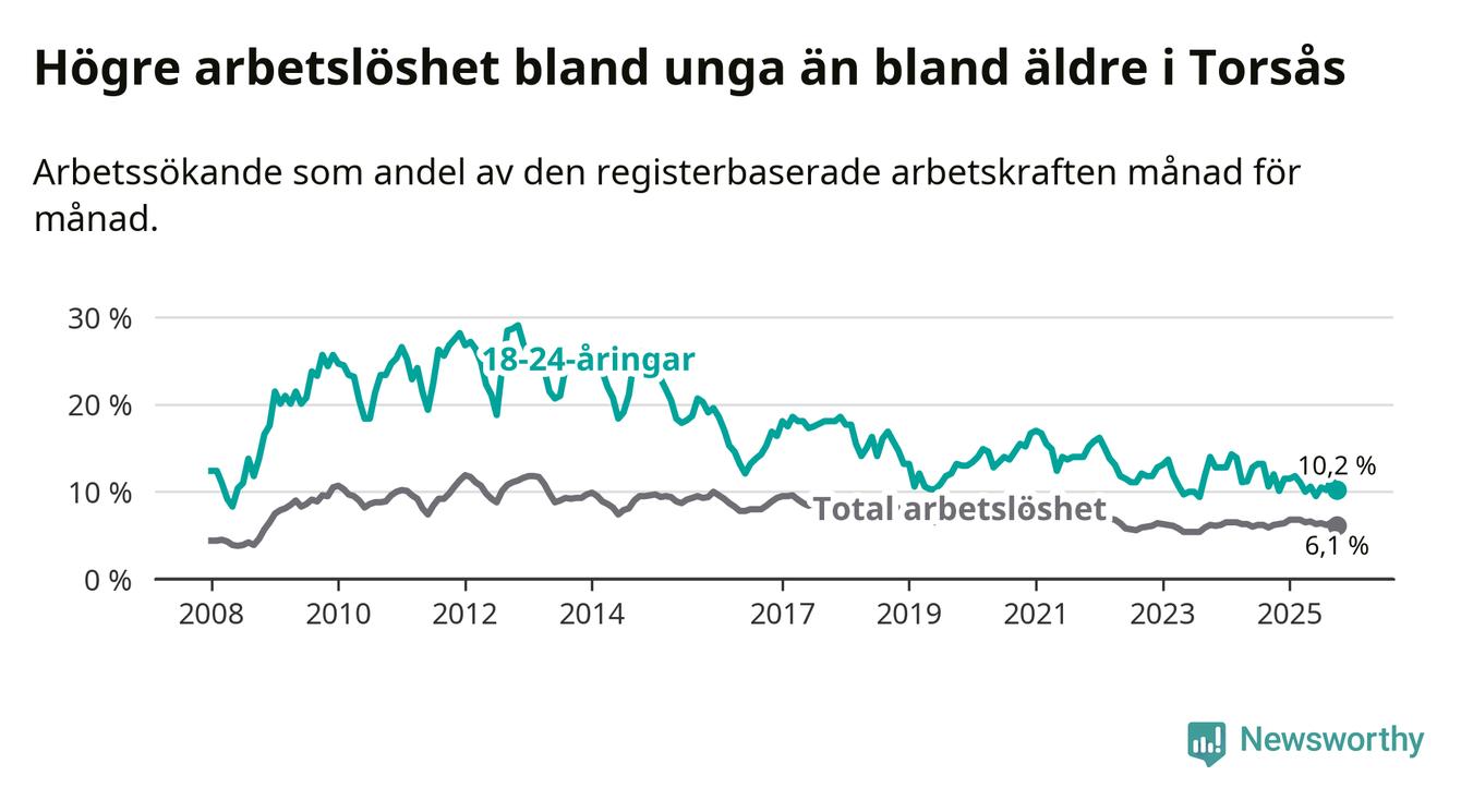 Medan Torsås har ungefär samma total arbetslöshet som Kalmar län, ligger ungdomsarbetslösheten 1,5 procentenheter högre i Torsås.
