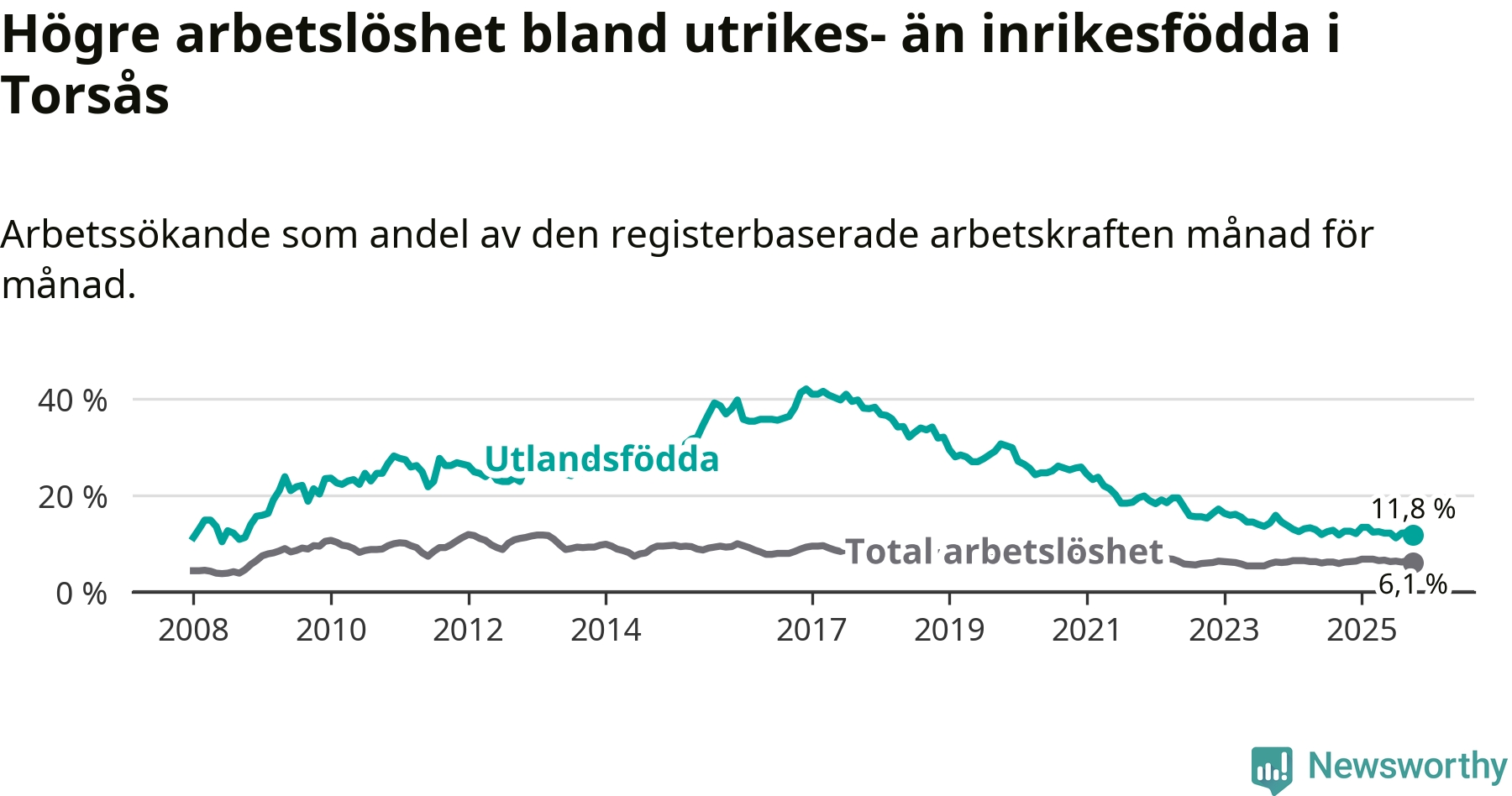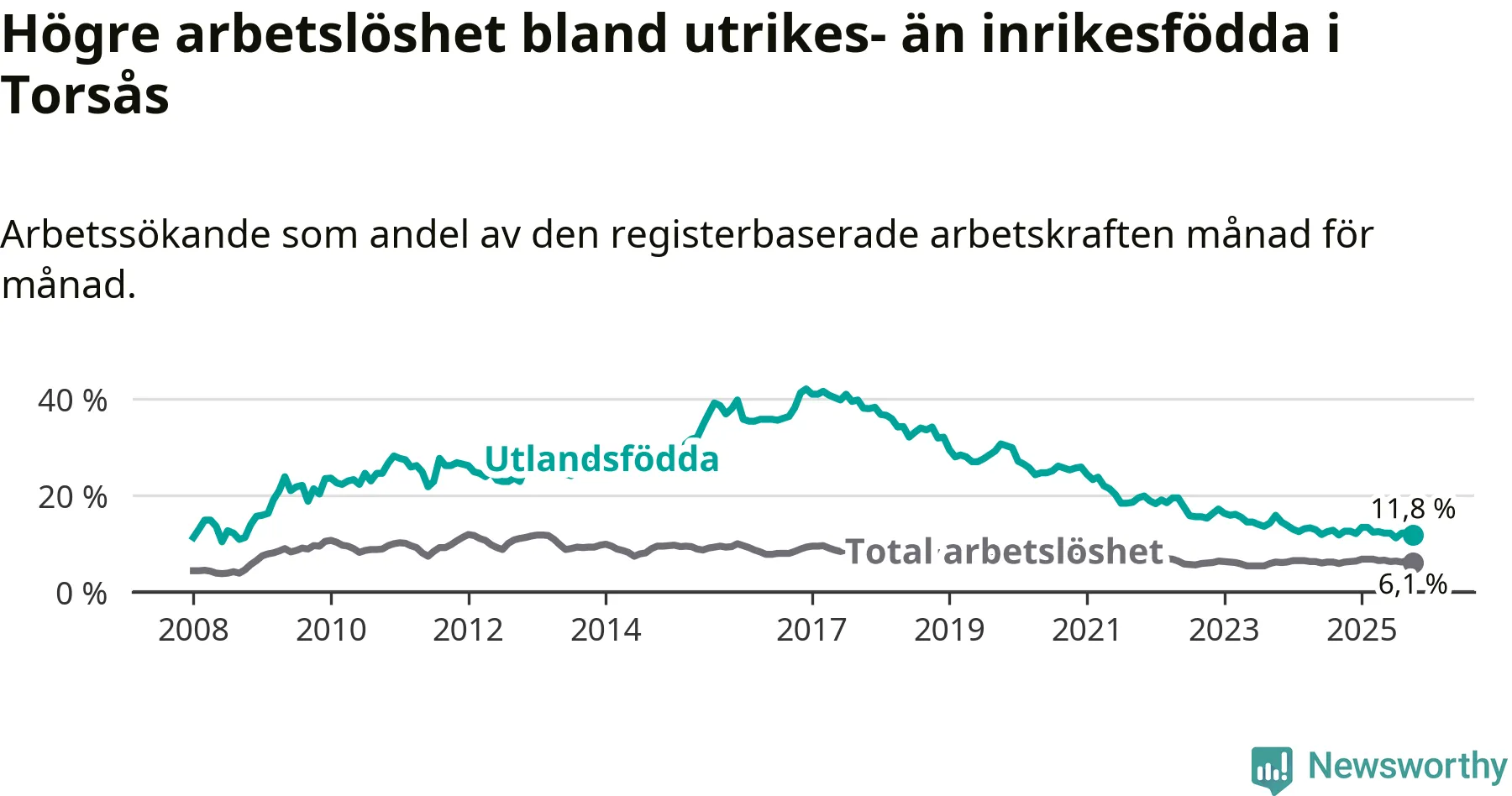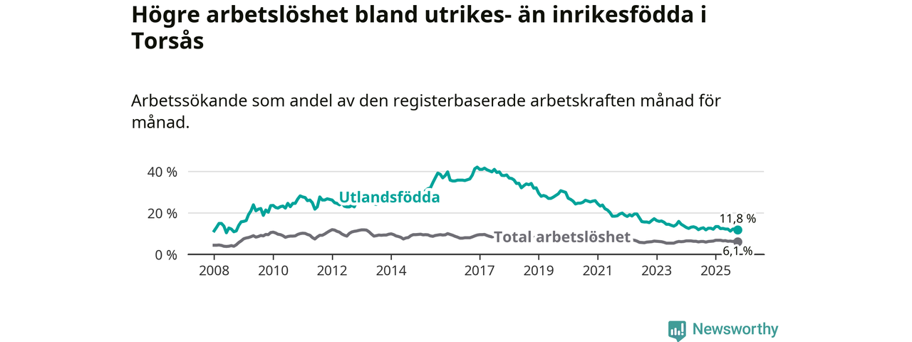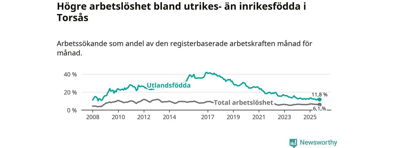 Arbetslösheten bland utlandsfödda var 11,8 procent i Torsås under oktober månad, motsvarande 44 av 373 personer. Det är 0,8 procentenheter färre än vid samma tidpunkt i fjol (−4 om man räknar personer). Den senaste månadens nedgång innebär ett trendbrott. Under de ett föregående månaderna hade arbetslösheten bland utlandsfödda varit högre än motsvarande tidpunkt året innan.