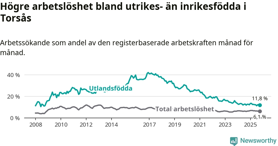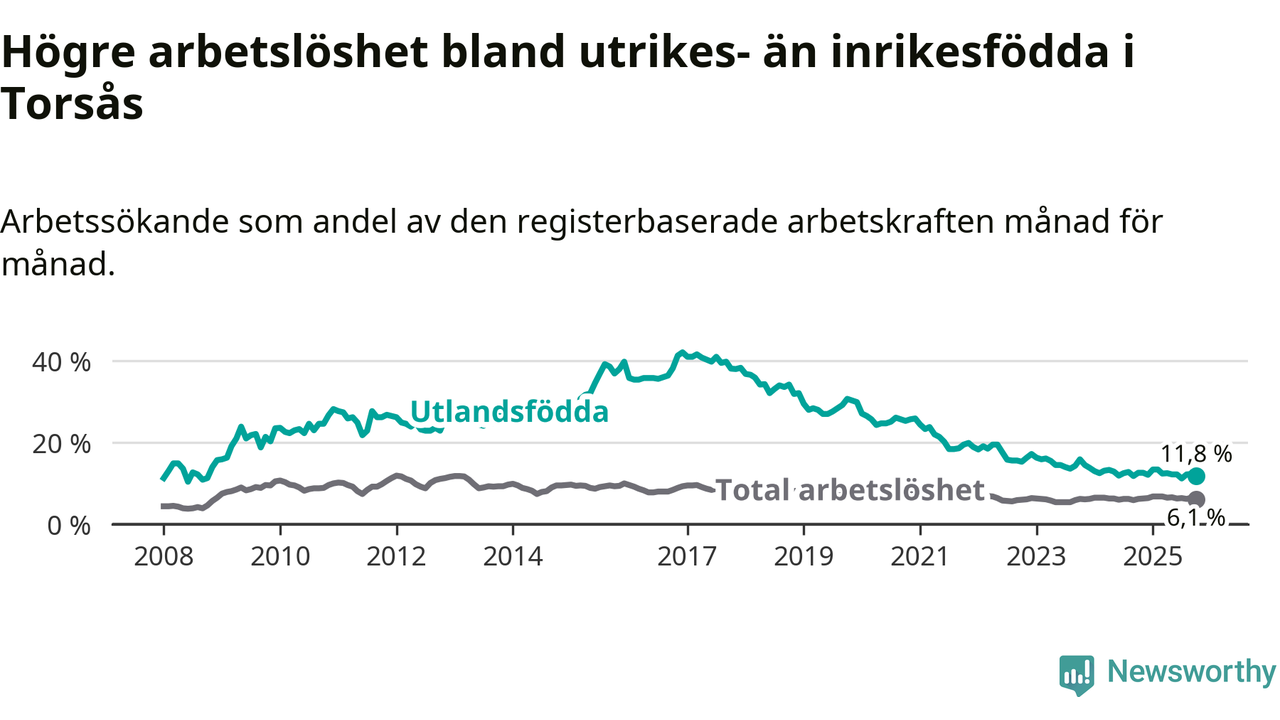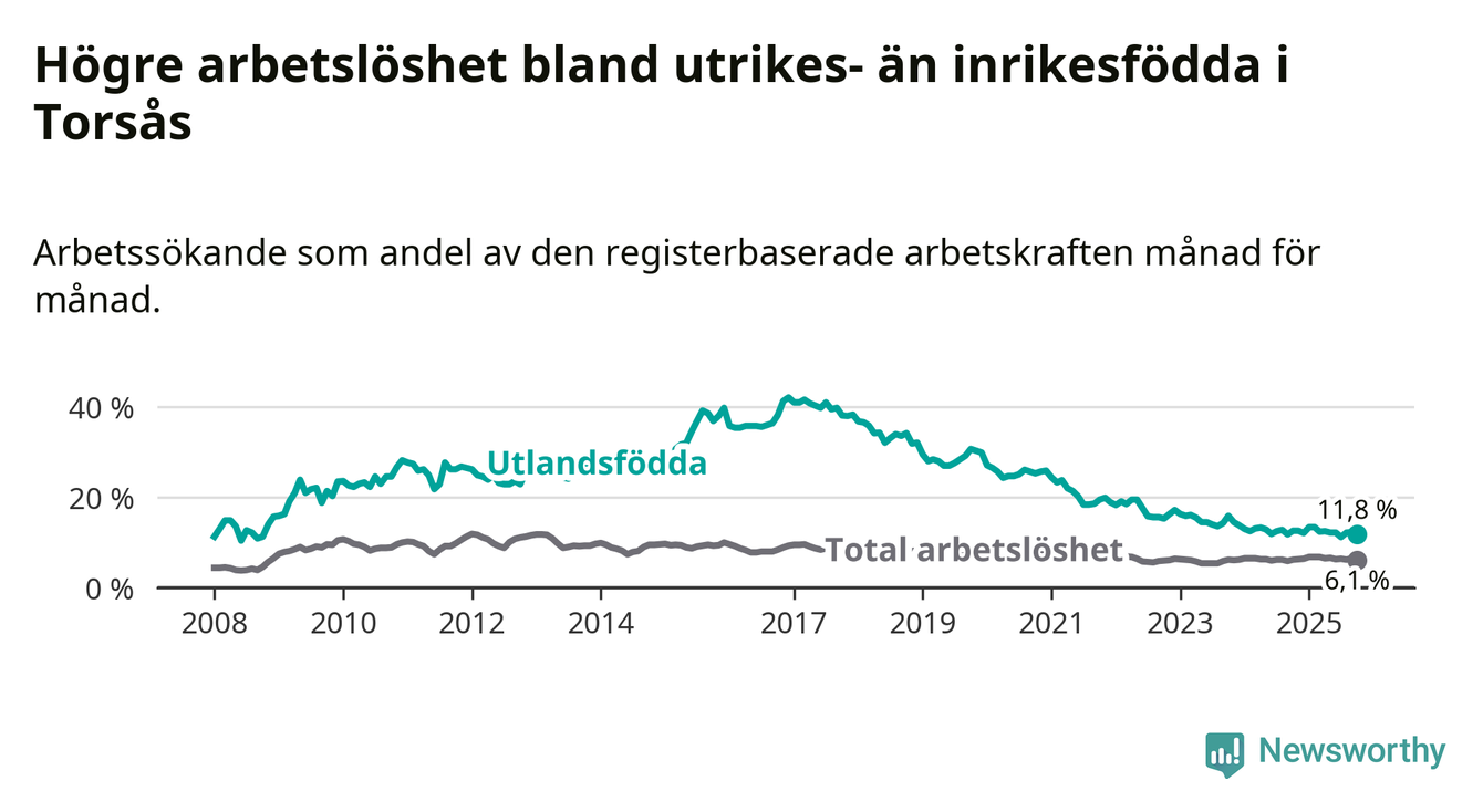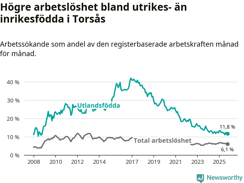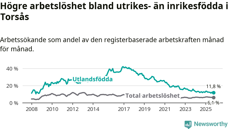 Arbetslösheten bland utlandsfödda var 11,8 procent i Torsås under oktober månad, motsvarande 44 av 373 personer. Det är 0,8 procentenheter färre än vid samma tidpunkt i fjol (−4 om man räknar personer). Den senaste månadens nedgång innebär ett trendbrott. Under de ett föregående månaderna hade arbetslösheten bland utlandsfödda varit högre än motsvarande tidpunkt året innan.