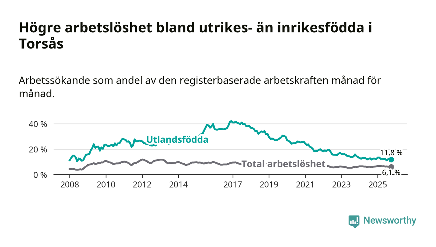 Skillnaden i arbetslöshet mellan utrikesfödda och hela befolkningen är 5,7 procentenheter i Torsås. Det är en mindre skillnad än för ett år sedan (−0,7 procentenheter).