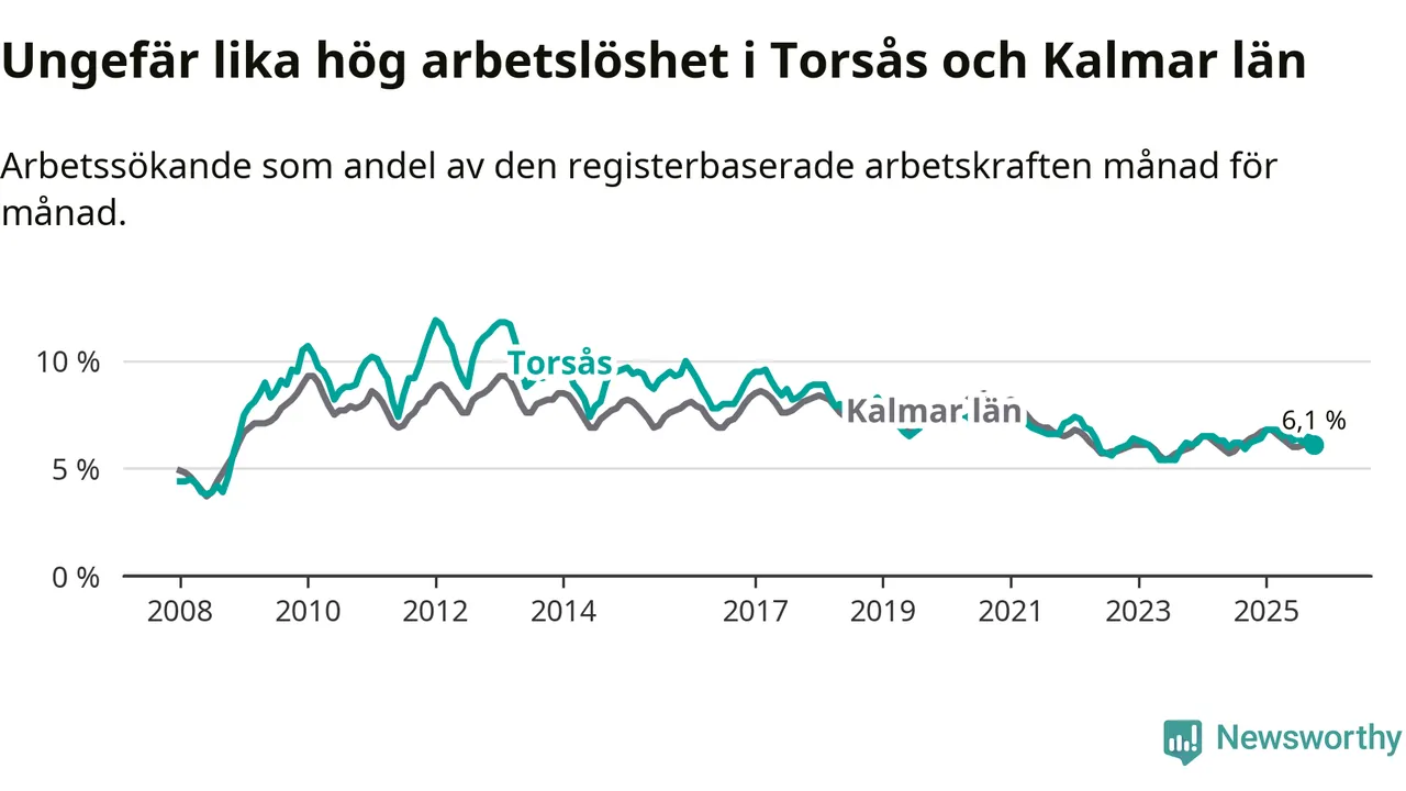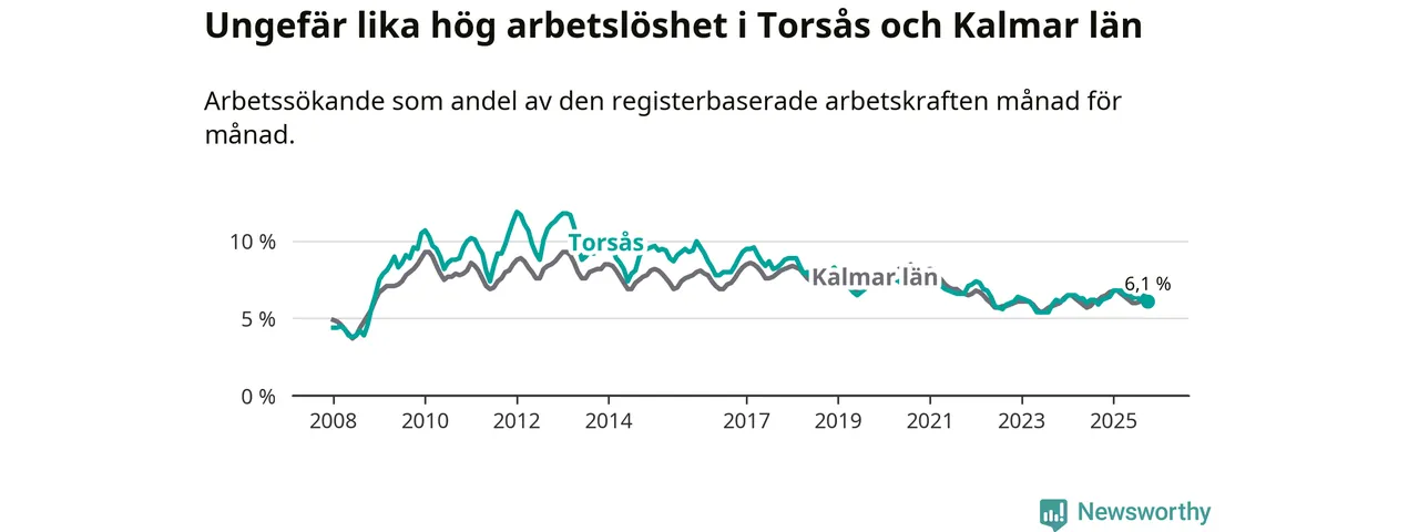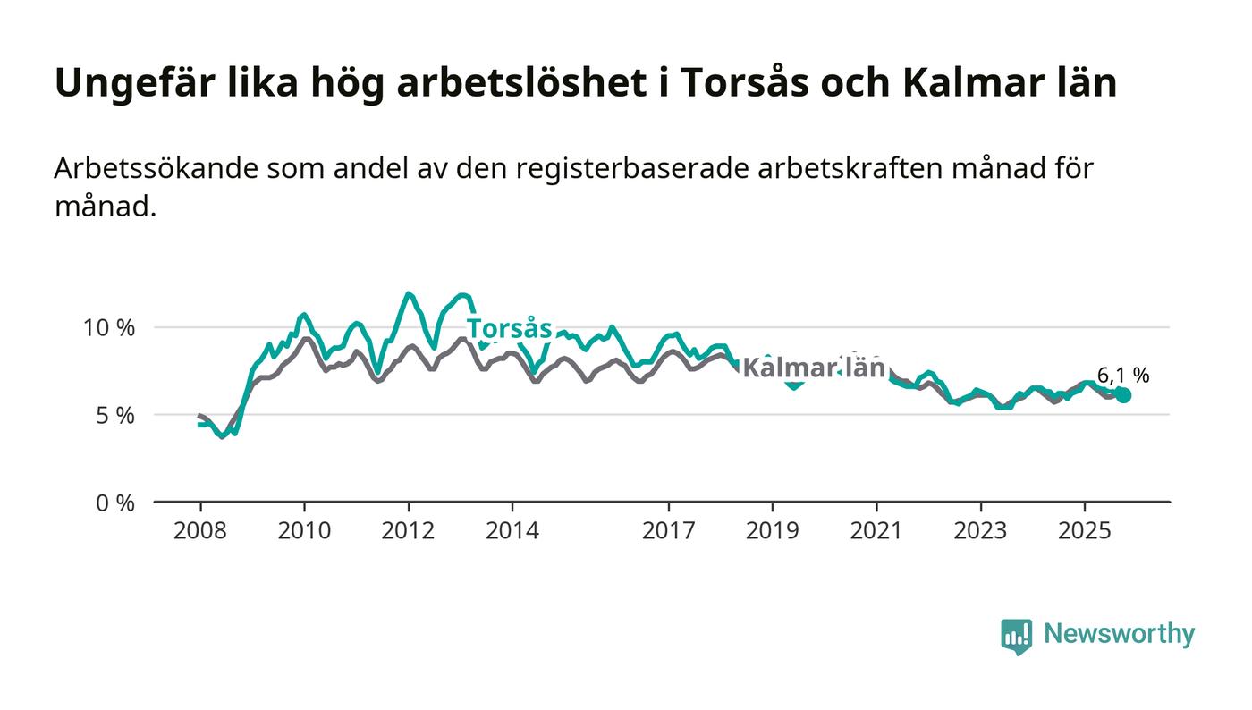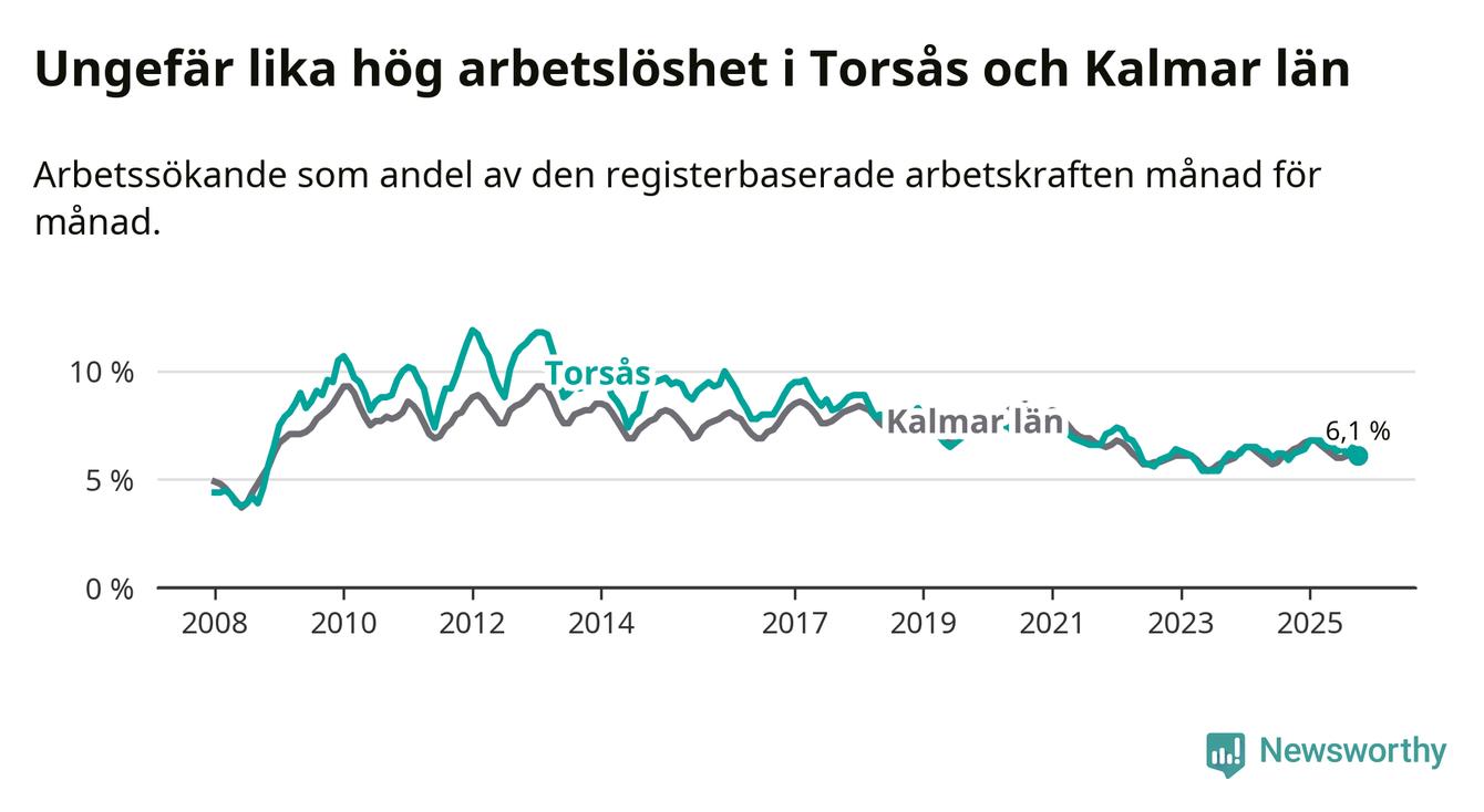 Under oktober månad rapporterade Torsås kommun en total arbetslöshet på 6,1 procent. Det är en minskning jämfört med samma tidpunkt i fjol (−0,1 procentenheter). Även i Kalmar län sjunker arbetslösheten .