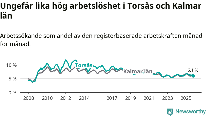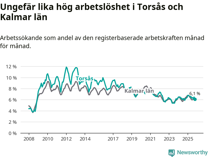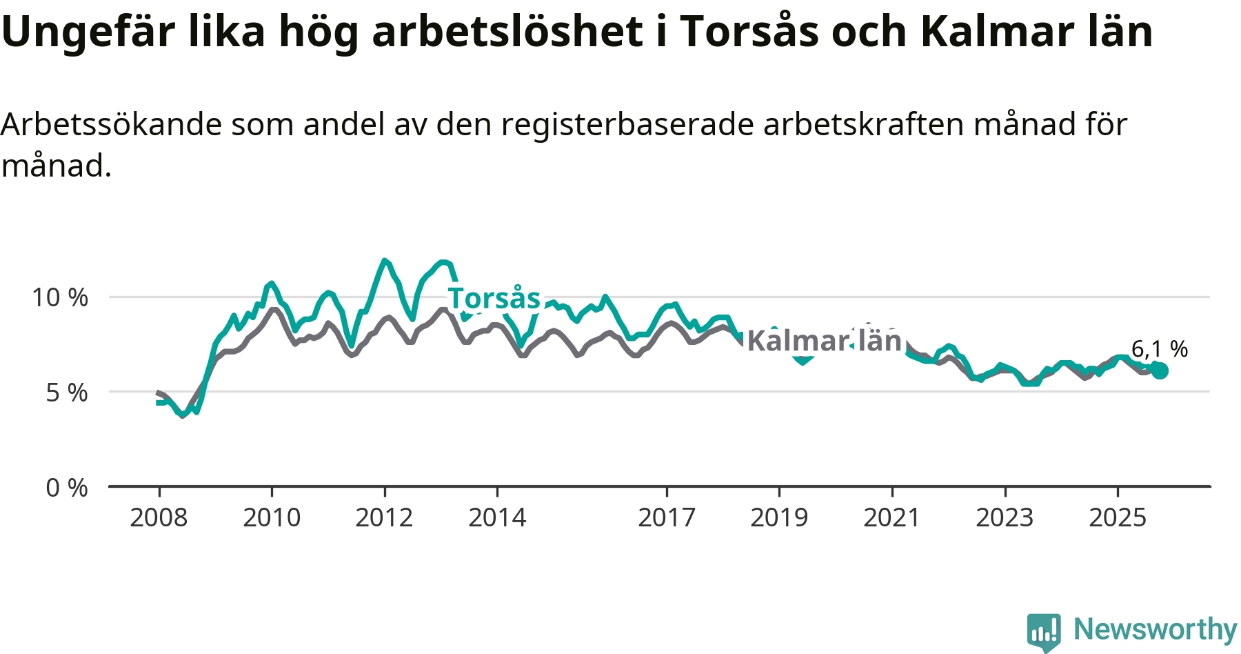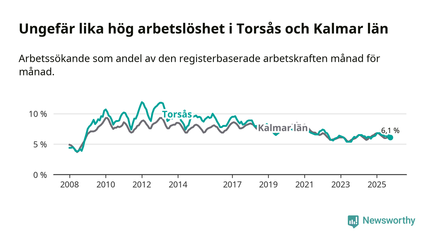 Under oktober månad rapporterade Torsås kommun en total arbetslöshet på 6,1 procent. Det är en minskning jämfört med samma tidpunkt i fjol (−0,1 procentenheter). Även i Kalmar län sjunker arbetslösheten .