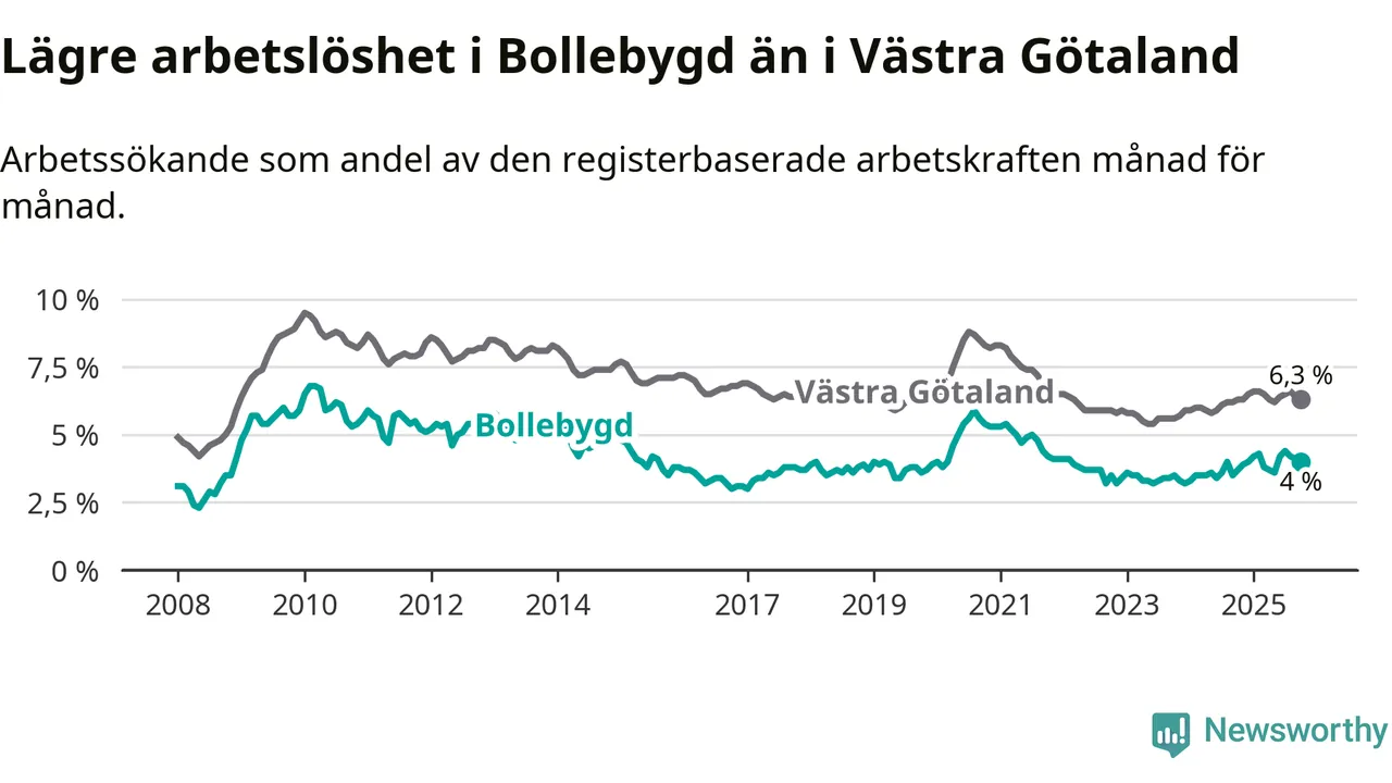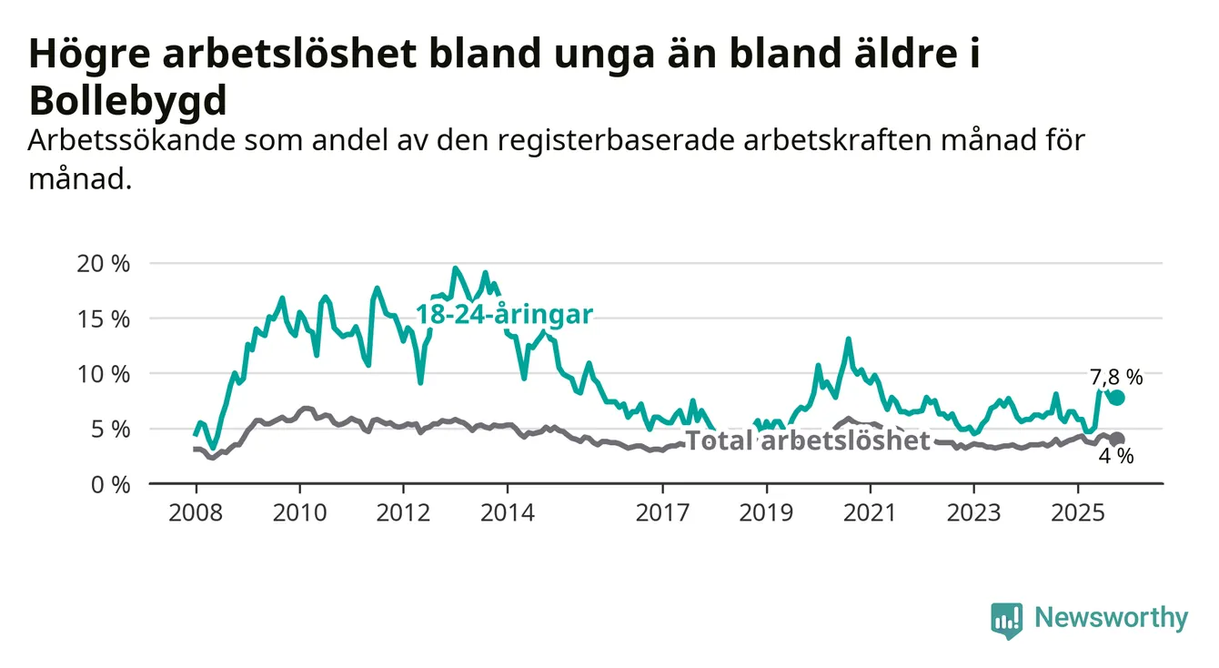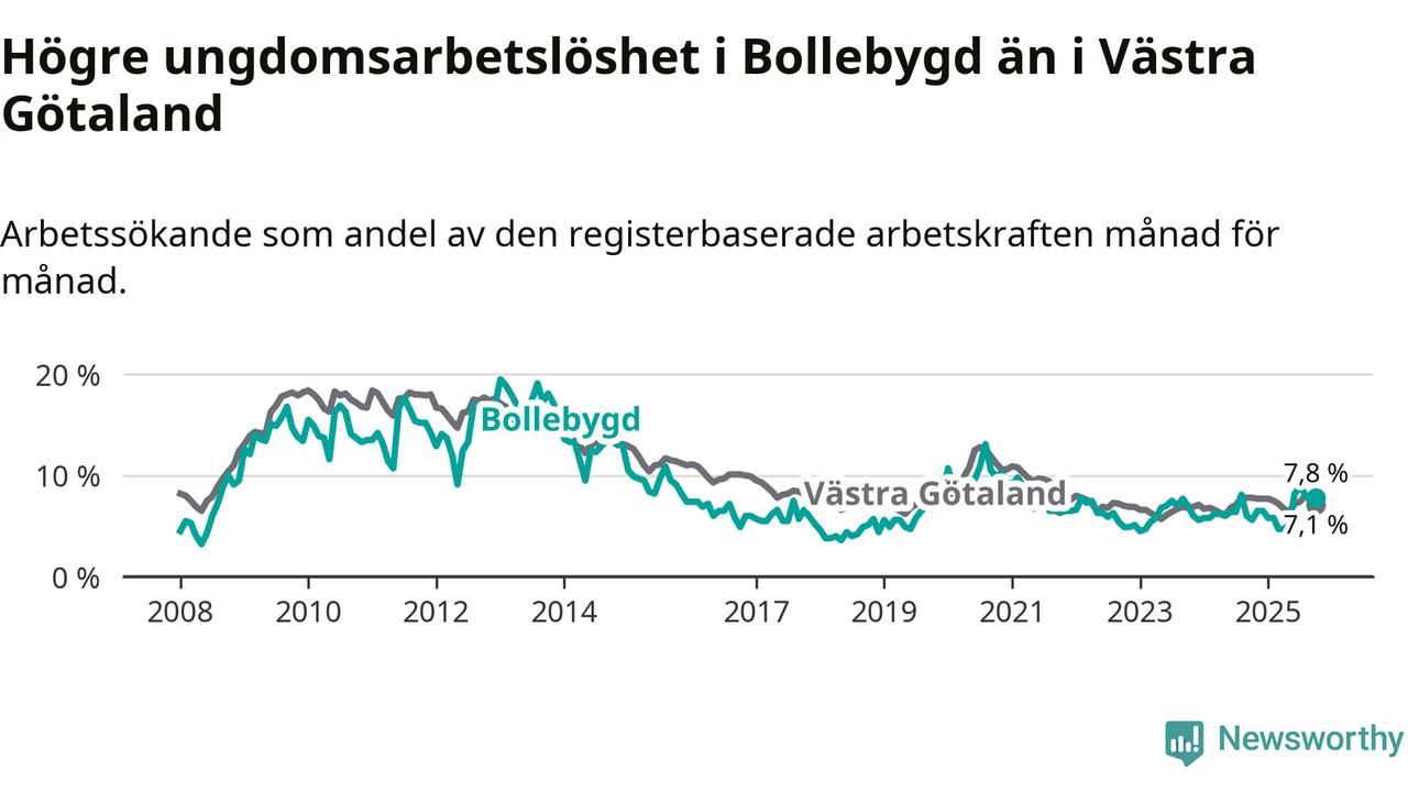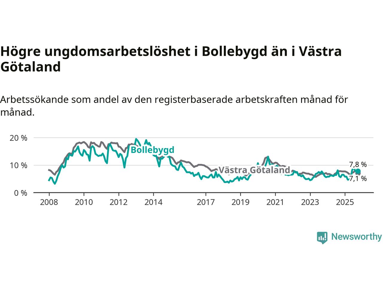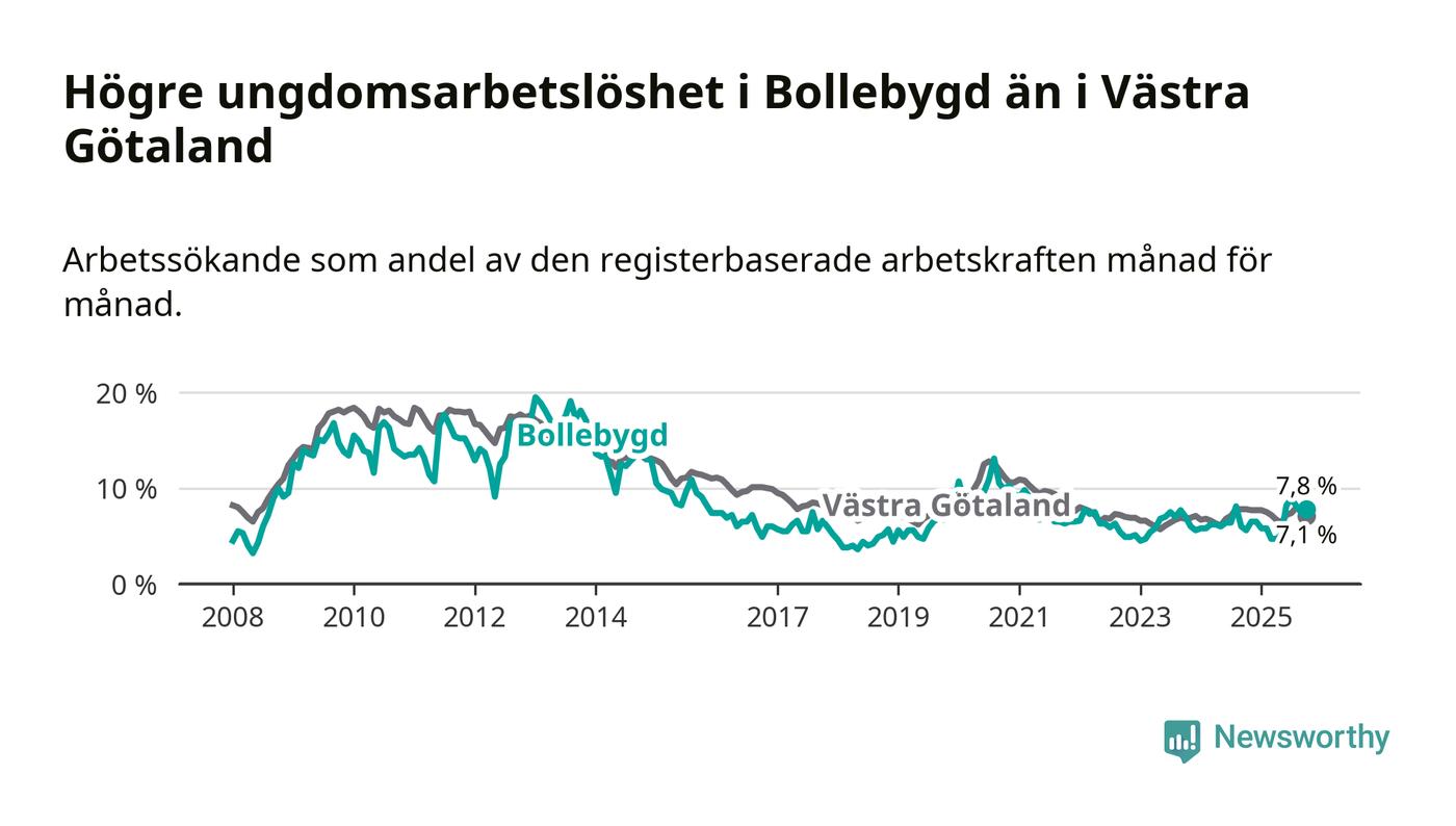 Medan Bollebygd har lägre total arbetslöshet än Västra Götaland, ligger ungdomsarbetslösheten 0,7 procentenheter högre i Bollebygd.