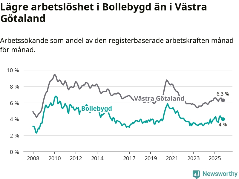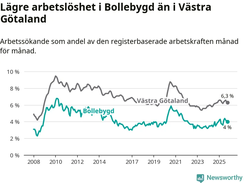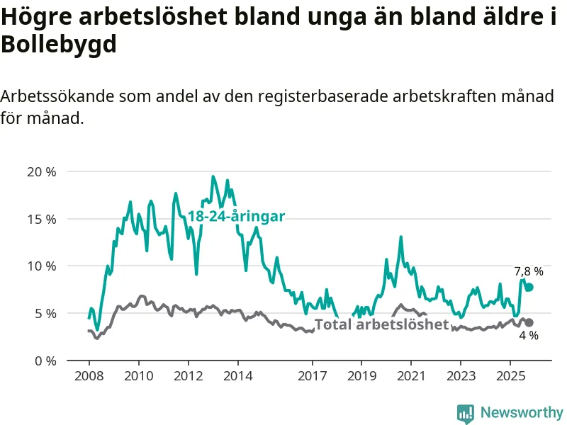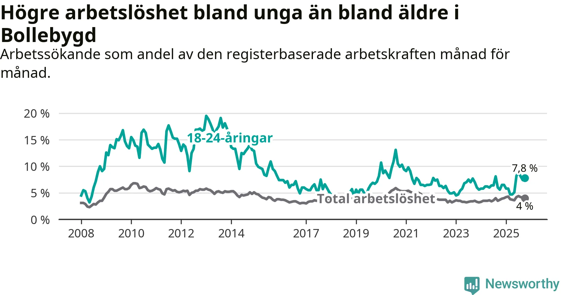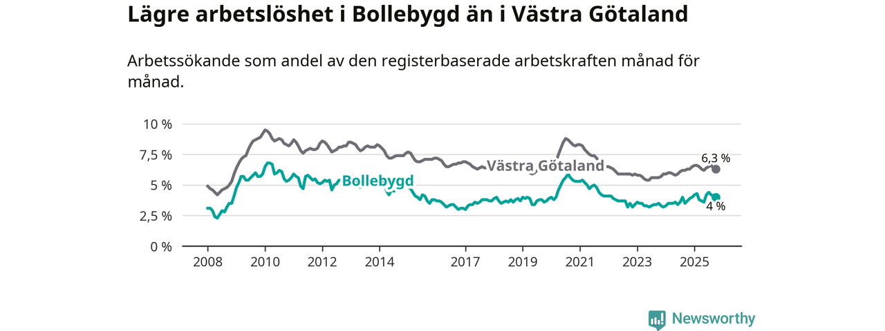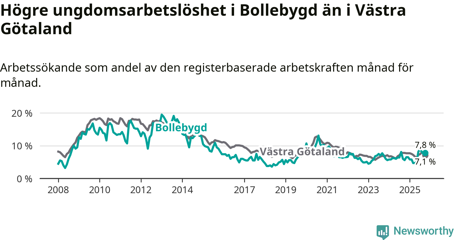 Medan Bollebygd har lägre total arbetslöshet än Västra Götaland, ligger ungdomsarbetslösheten 0,7 procentenheter högre i Bollebygd.