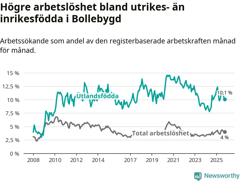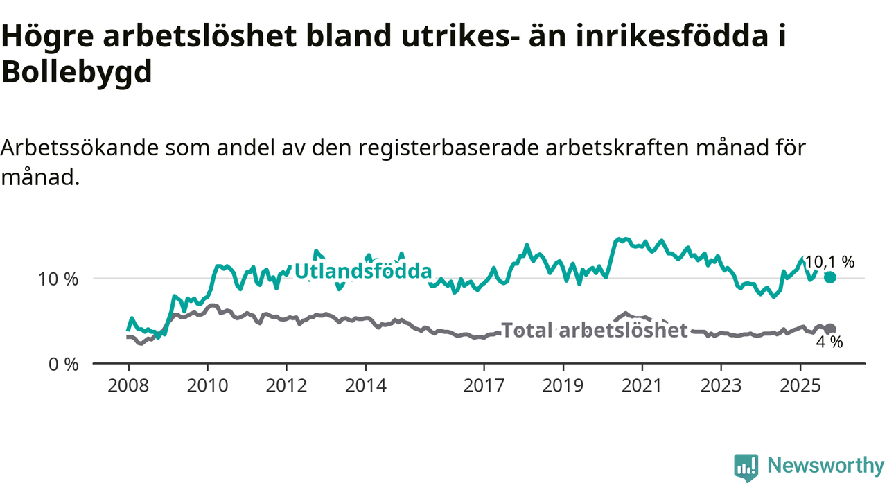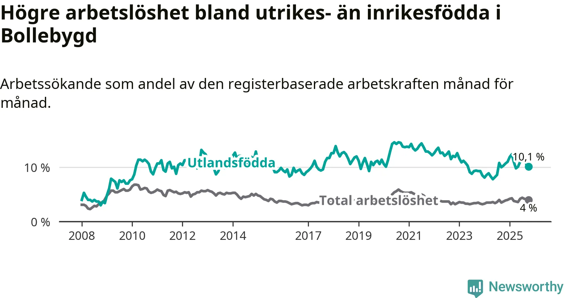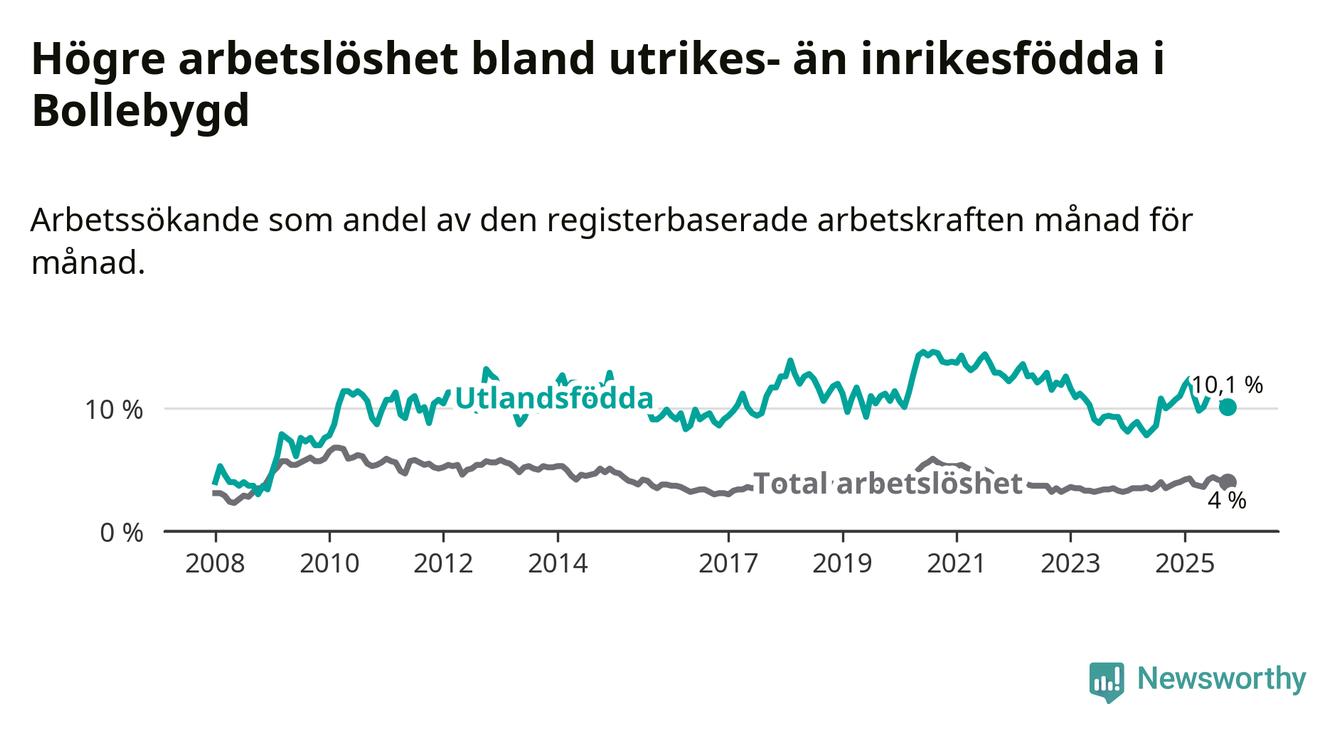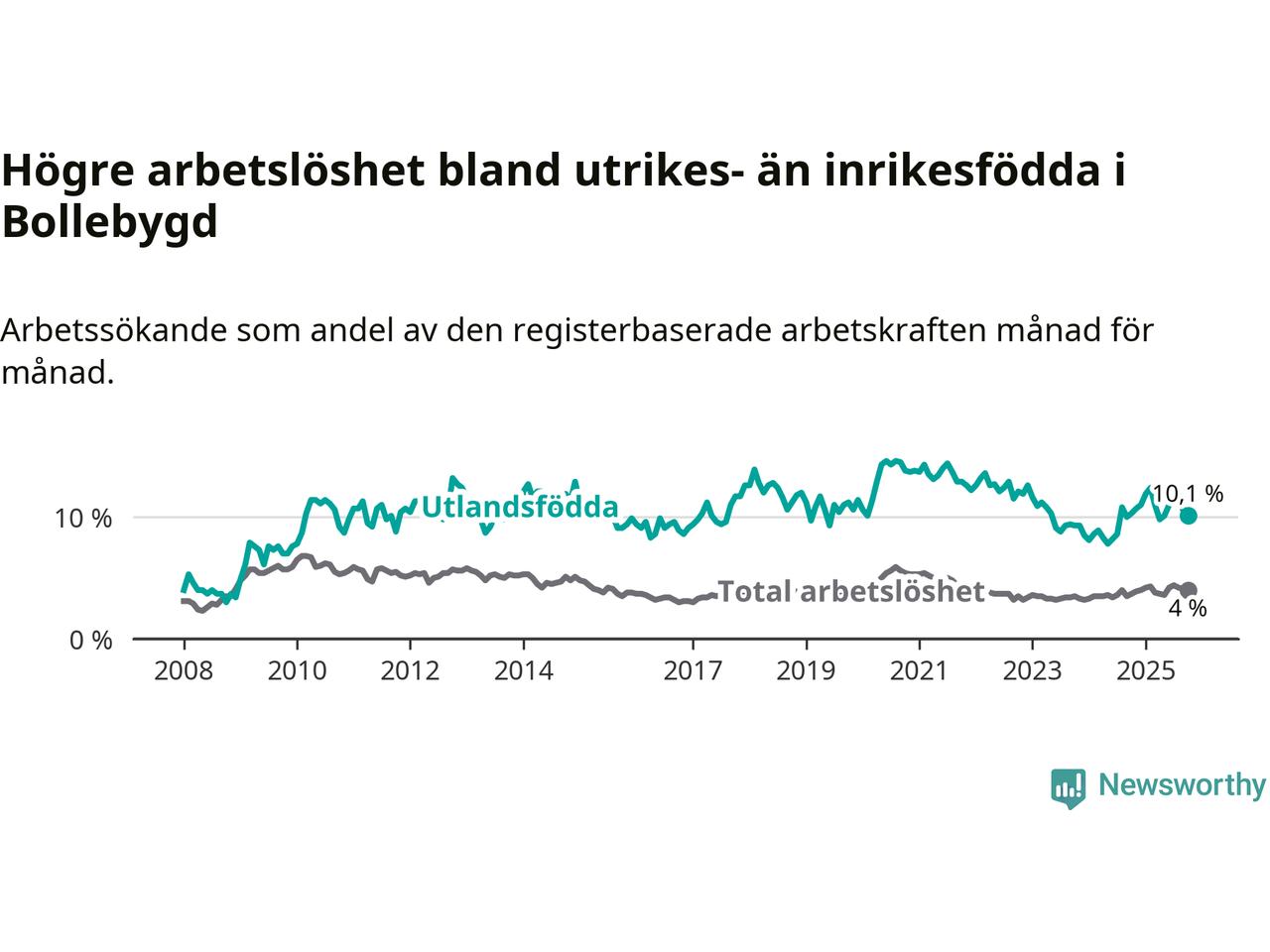 Arbetslösheten bland utlandsfödda var 10,1 procent i Bollebygd under oktober månad, motsvarande 66 av 653 personer. Det är 0,2 procentenheter färre än vid samma tidpunkt i fjol (+2 om man räknar personer). Den senaste månadens nedgång innebär ett trendbrott. Under de 14 föregående månaderna hade arbetslösheten bland utlandsfödda varit högre än motsvarande tidpunkt året innan.