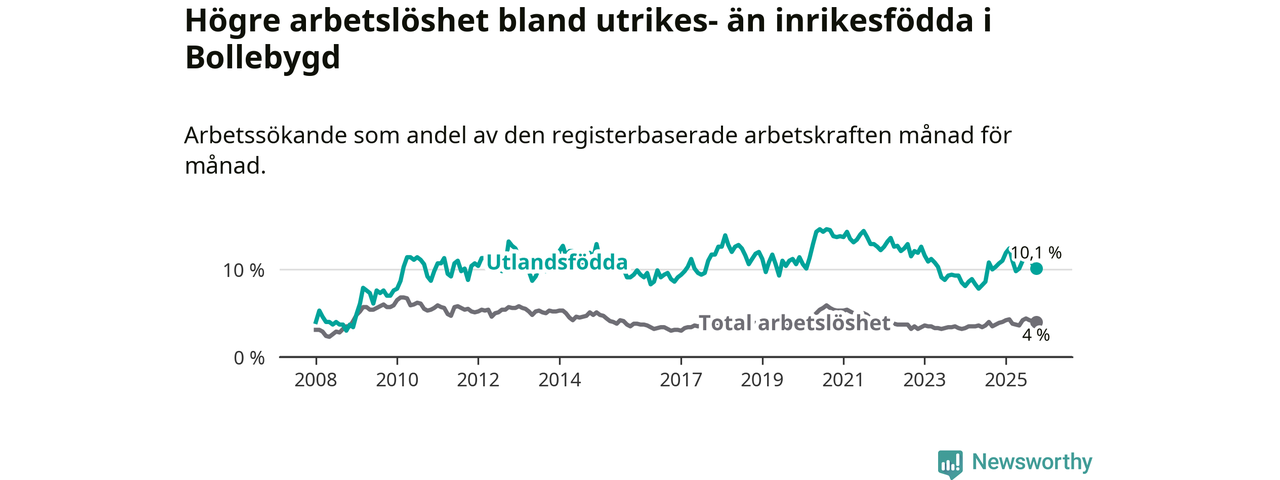 Sedan juli 2024 har arbetslösheten bland utlandsfödda i Bollebygds kommun ökat, men i oktober vände utvecklingen då andelen arbetslösa sjönk något jämfört med året innan.