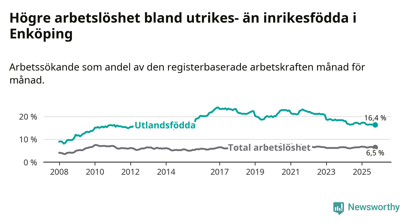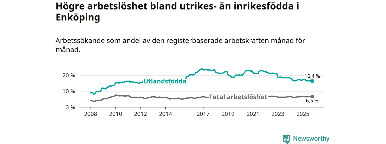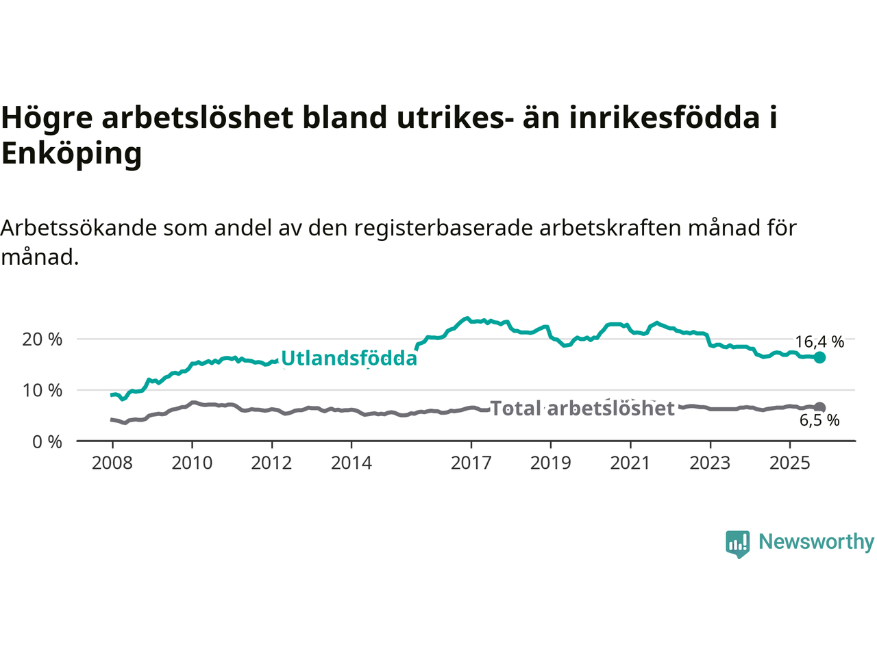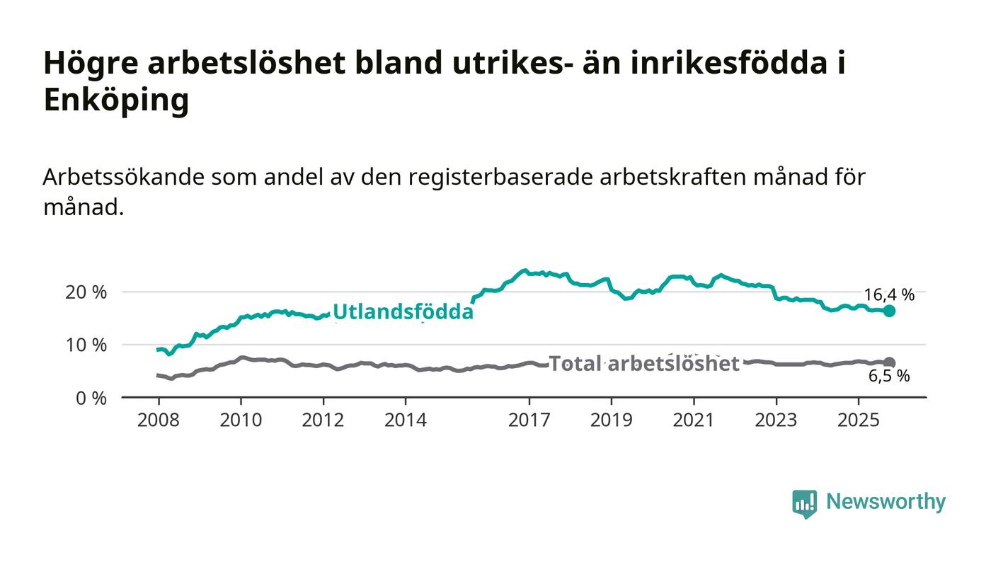 Arbetslösheten bland utlandsfödda var 16,4 procent i Enköping under oktober månad, motsvarande 814 av 4 963 personer. Det är 0,8 procentenheter färre än vid samma tidpunkt i fjol (−27 om man räknar personer).
