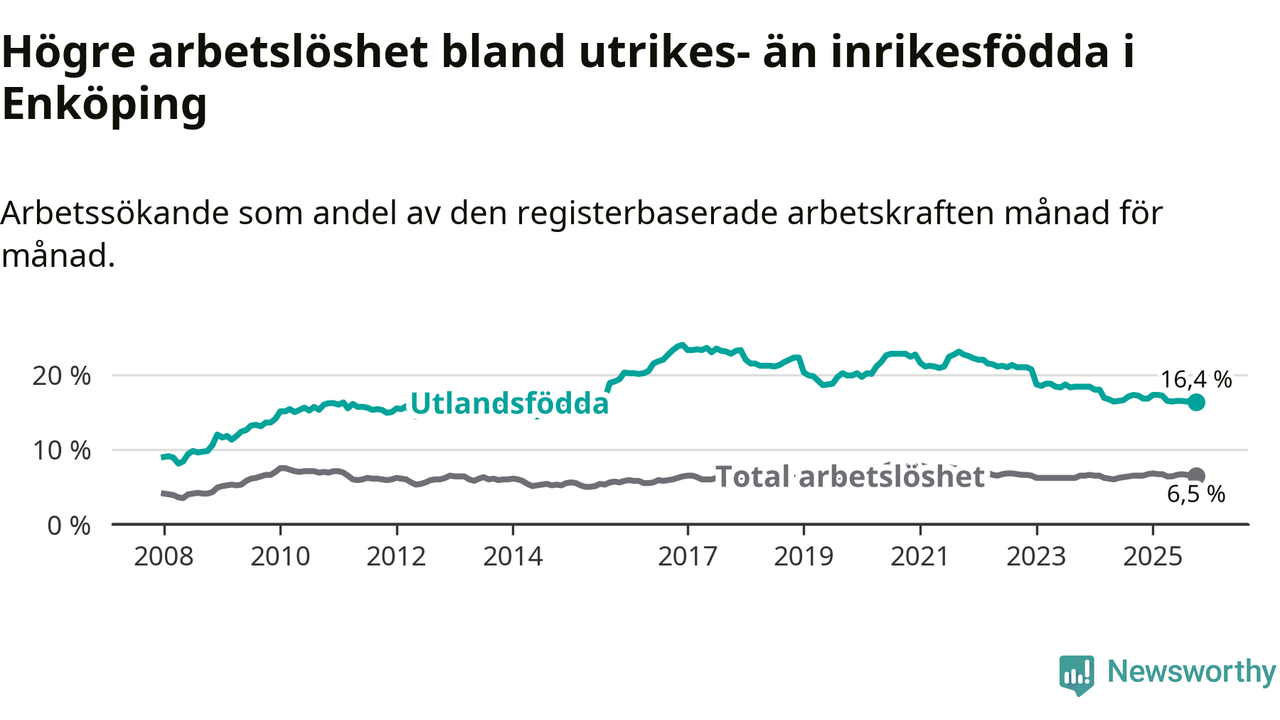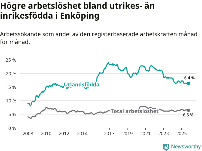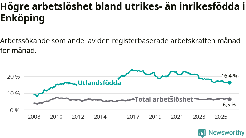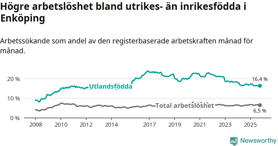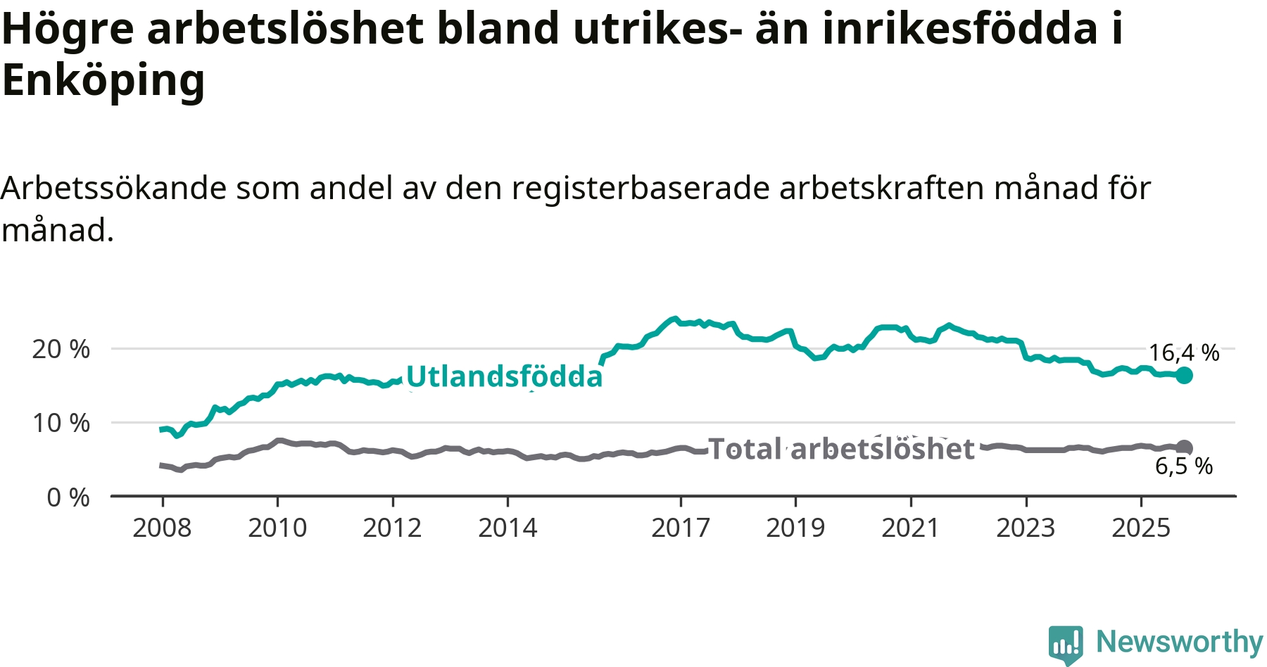 Arbetslösheten bland utlandsfödda var 16,4 procent i Enköping under oktober månad, motsvarande 814 av 4 963 personer. Det är 0,8 procentenheter färre än vid samma tidpunkt i fjol (−27 om man räknar personer).