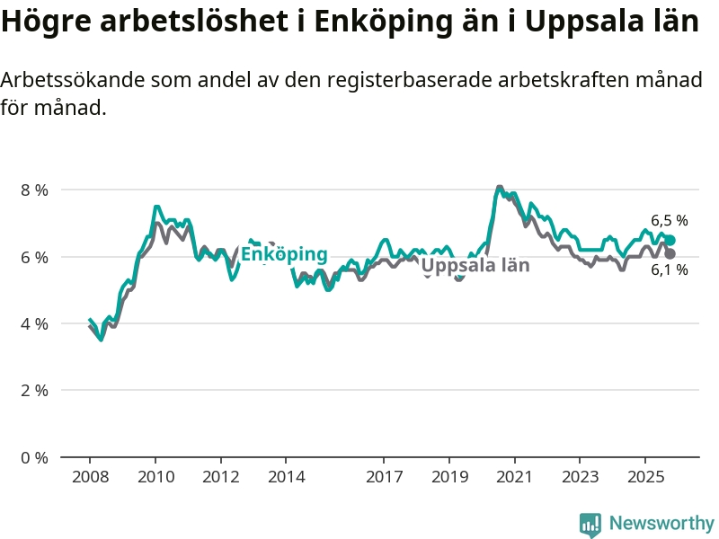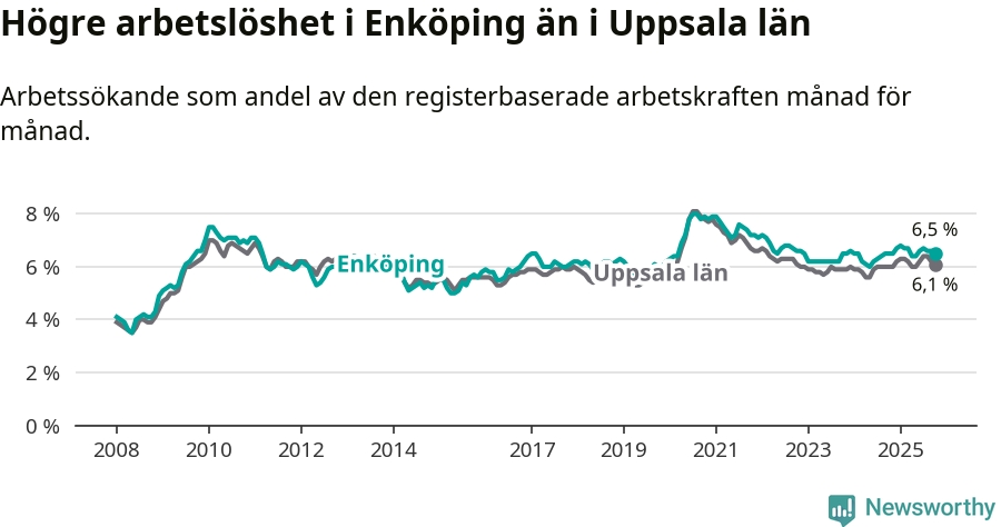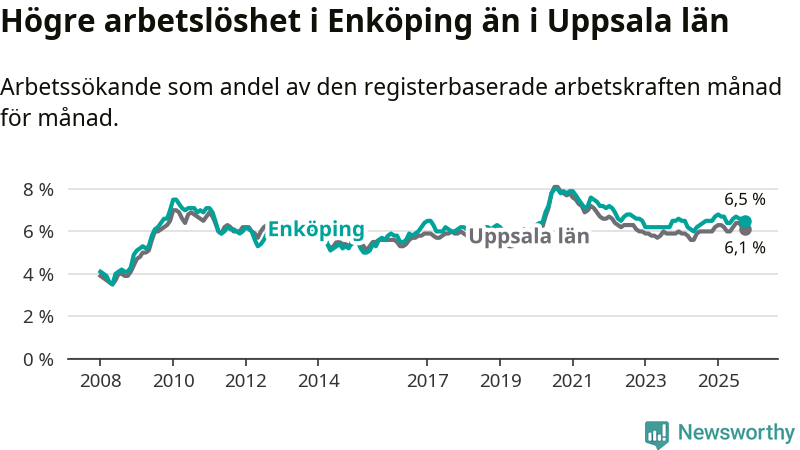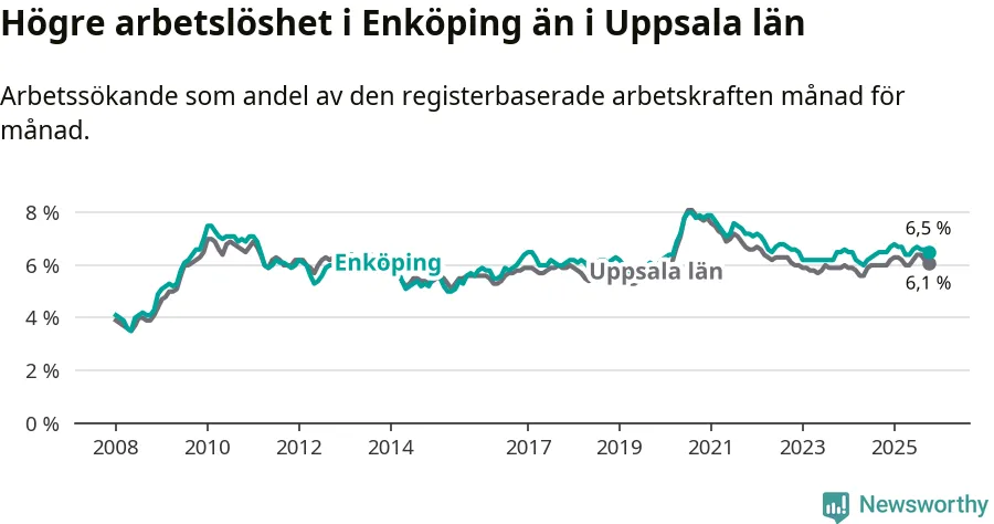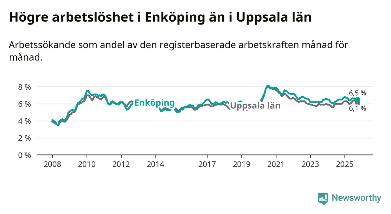 Under oktober månad rapporterade Enköpings kommun en total arbetslöshet på 6,5 procent. Det är i samma nivå som i oktober i fjol. I Uppsala län däremot stiger arbetslösheten något