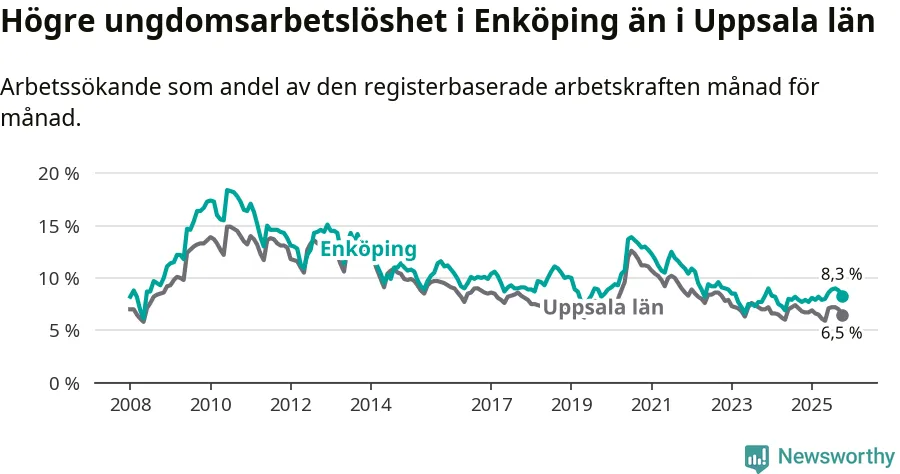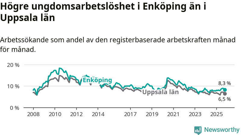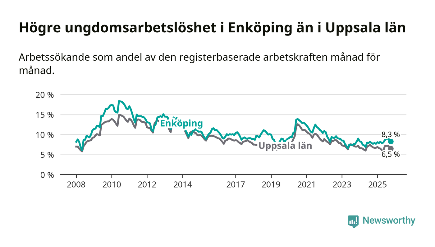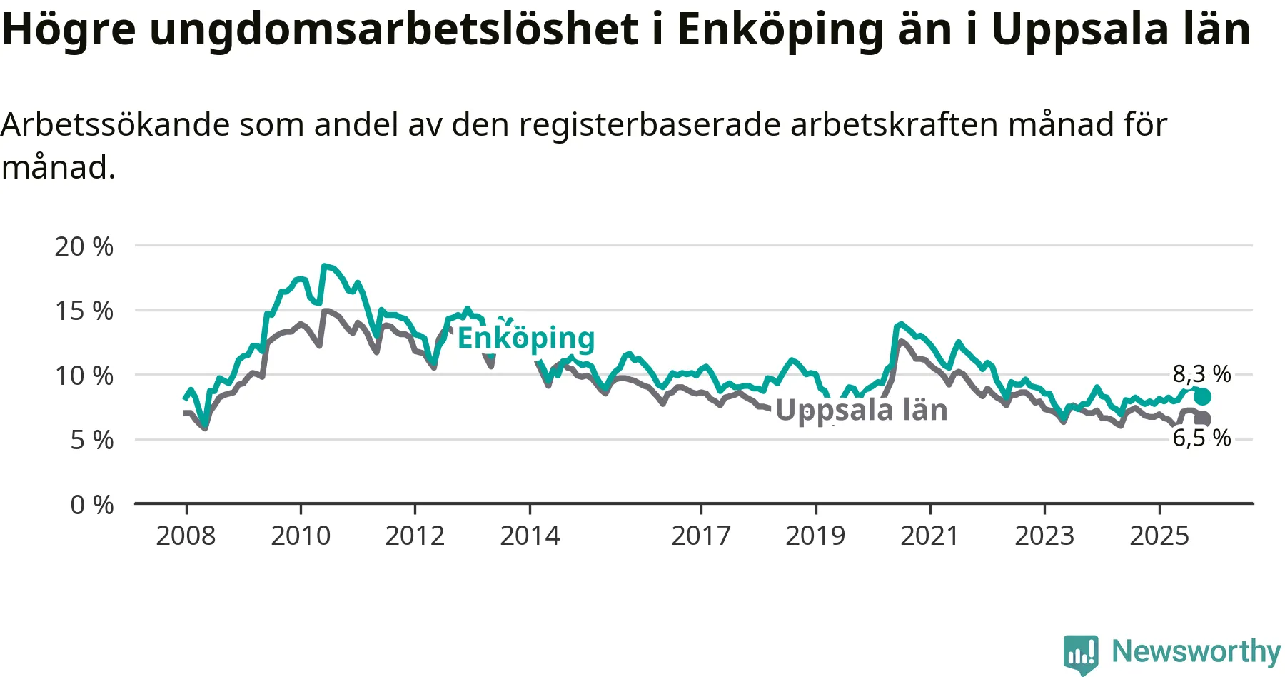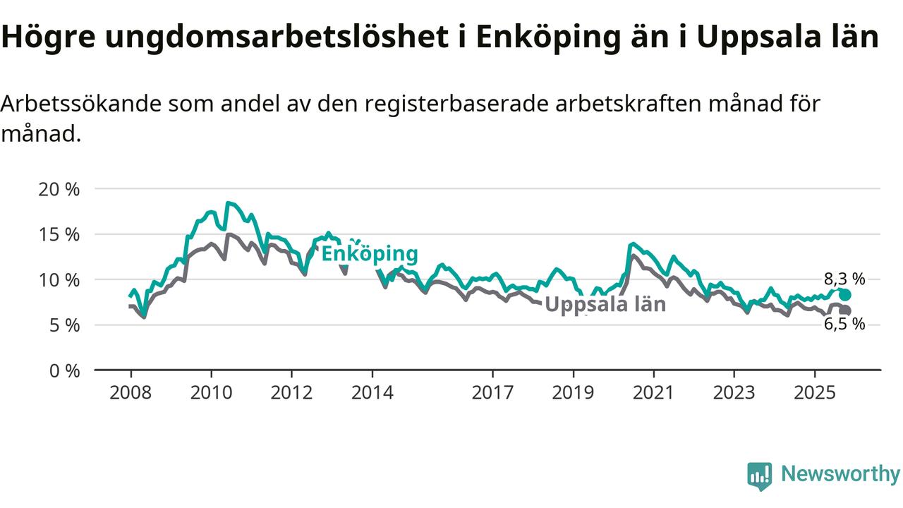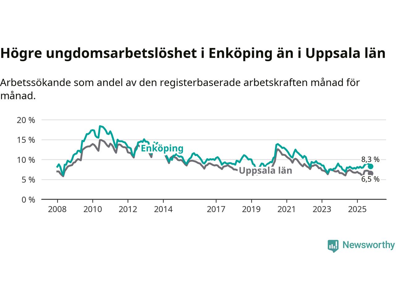 Precis som den totala arbetslösheten ligger ungdomsarbetslösheten i Enköping högre än i Uppsala som helhet. Skillnaden mellan kommunen och länet är 1,8 procentenheter.