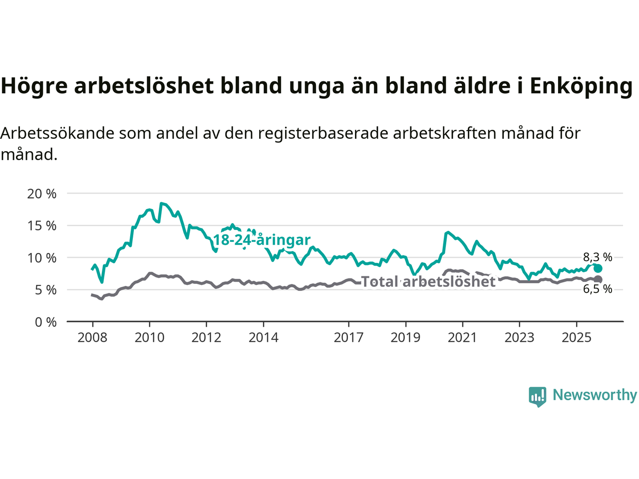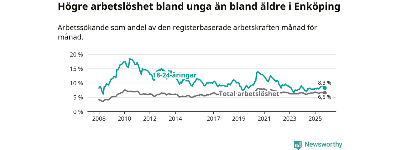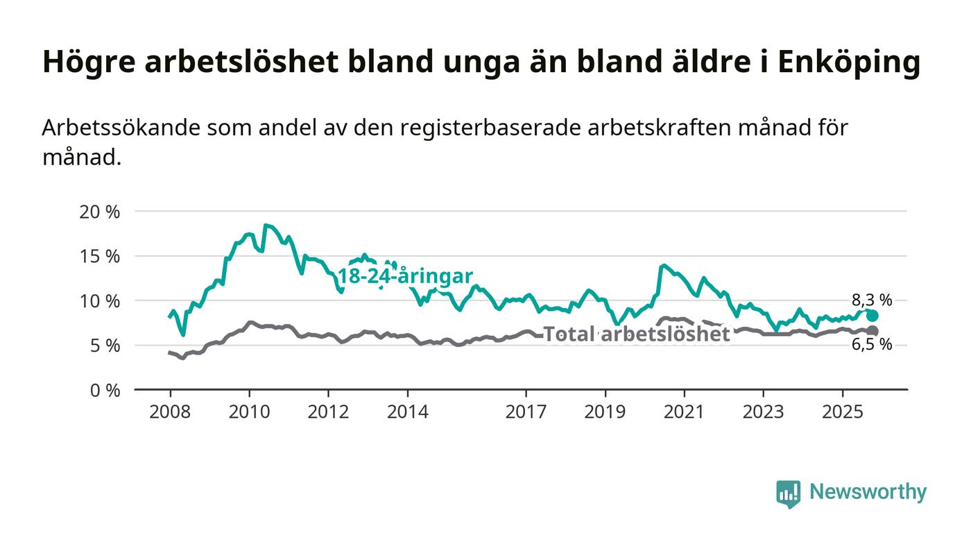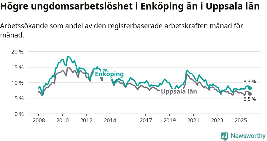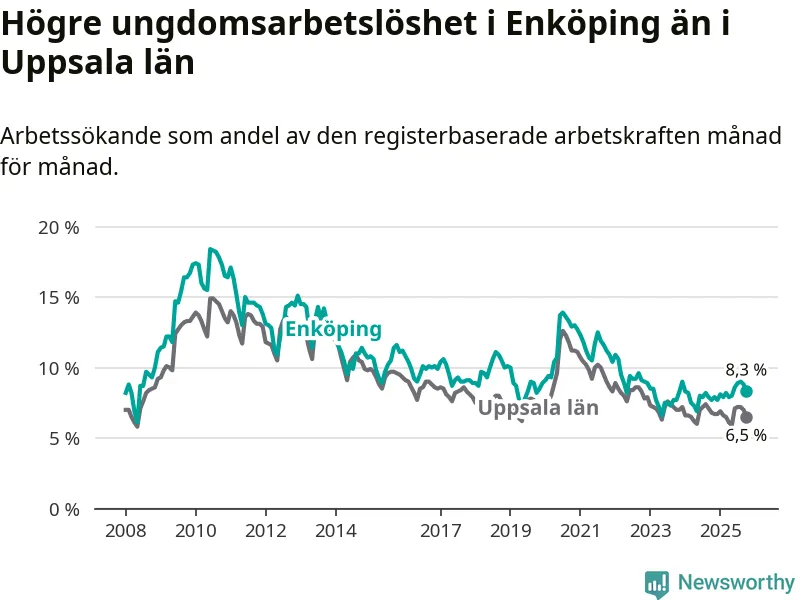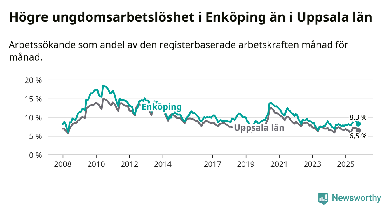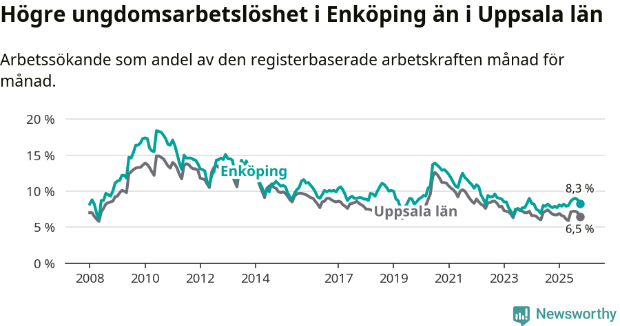 Precis som den totala arbetslösheten ligger ungdomsarbetslösheten i Enköping högre än i Uppsala som helhet. Skillnaden mellan kommunen och länet är 1,8 procentenheter.