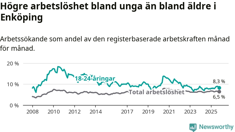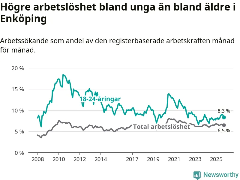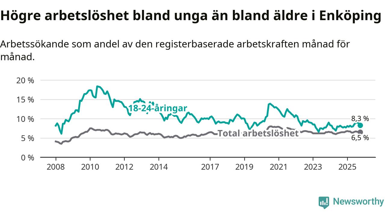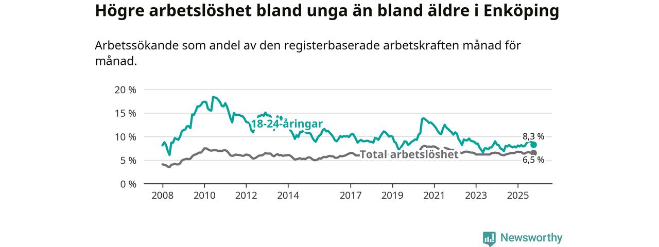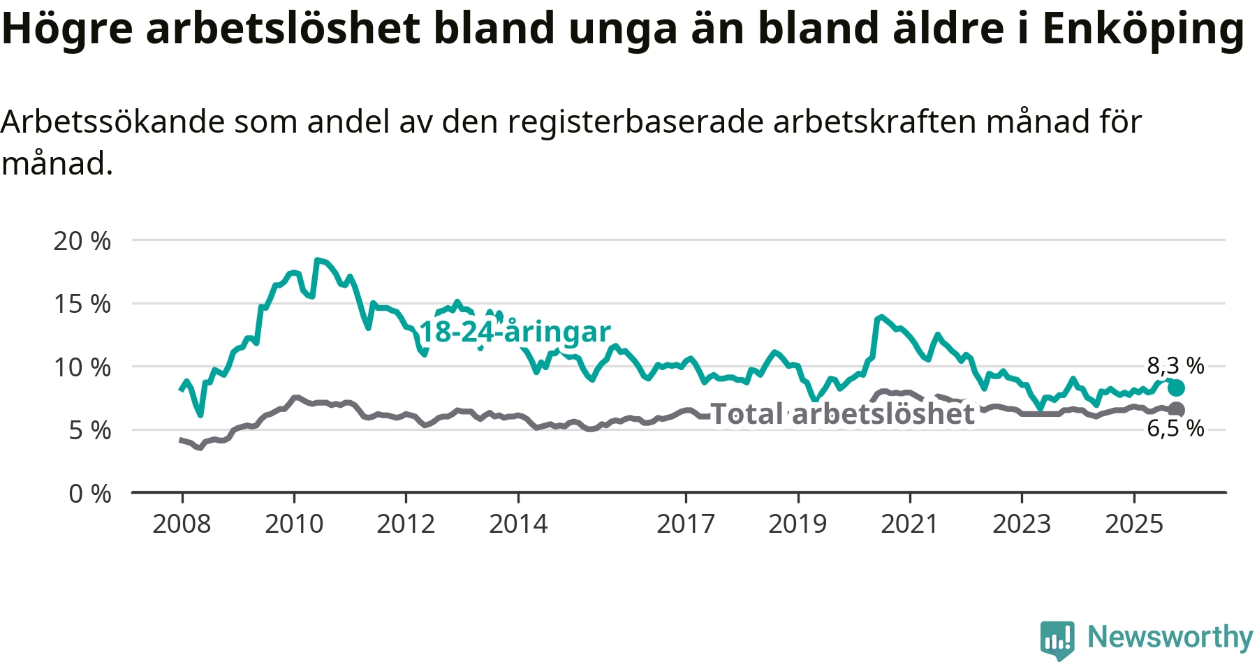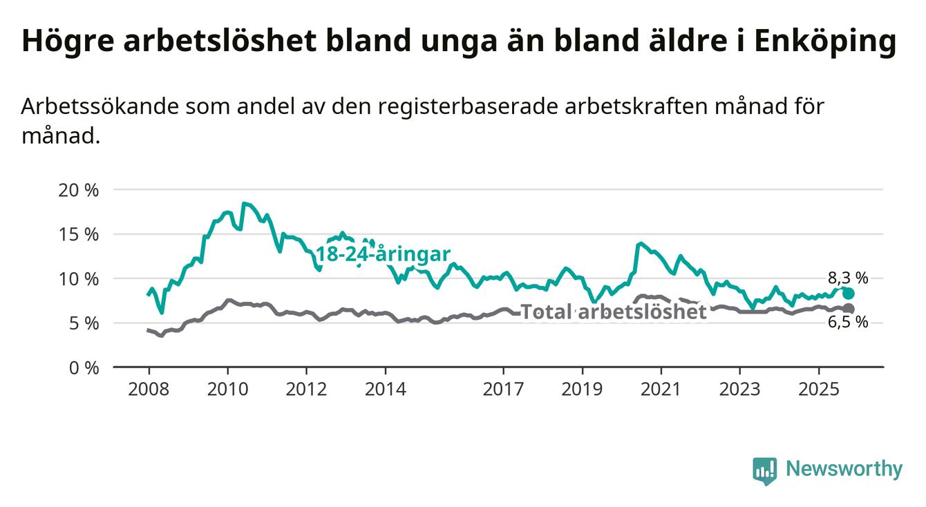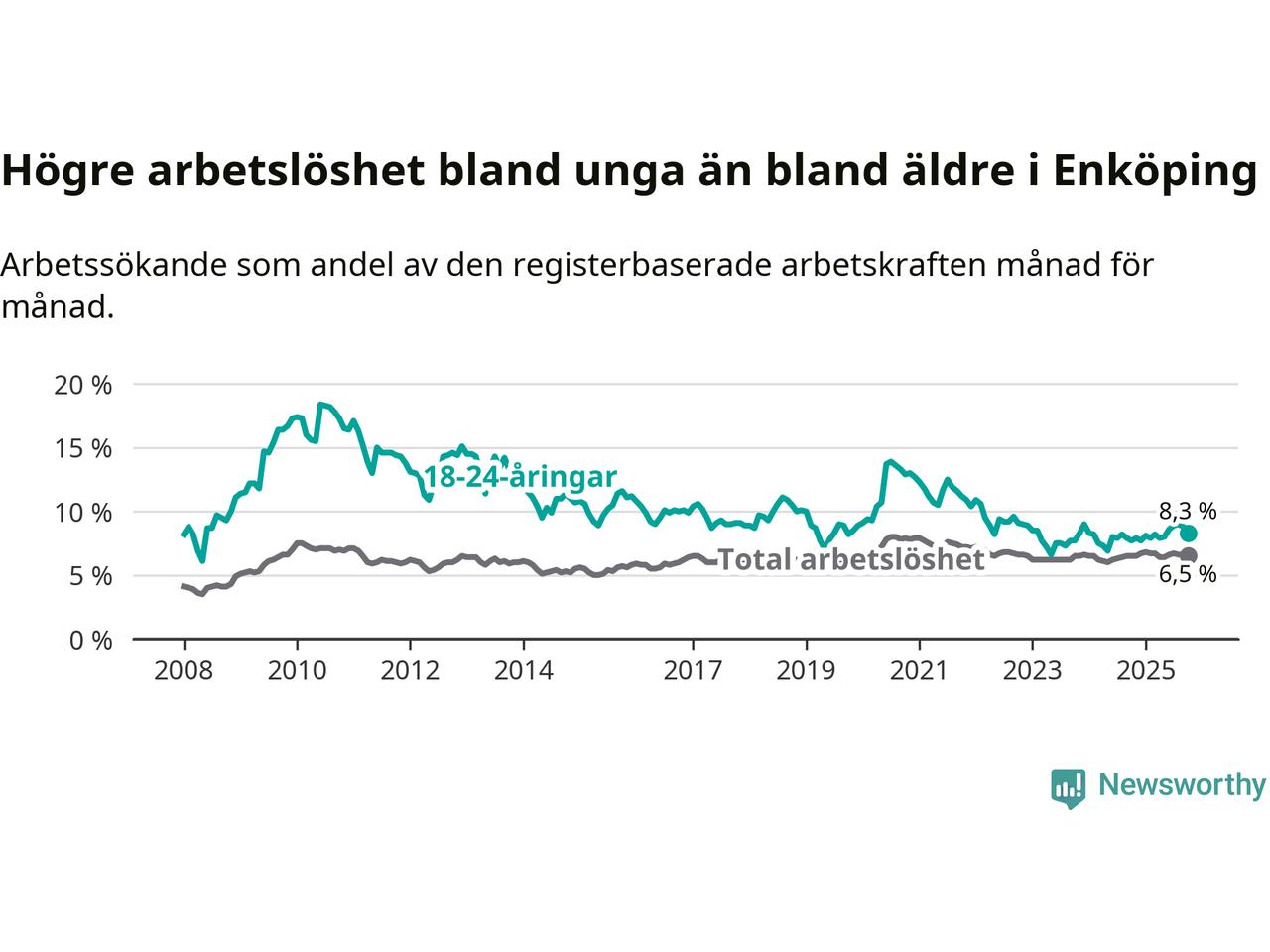 Precis som den totala arbetslösheten ligger ungdomsarbetslösheten i Enköping högre än i Uppsala som helhet. Skillnaden mellan kommunen och länet är 1,8 procentenheter.
