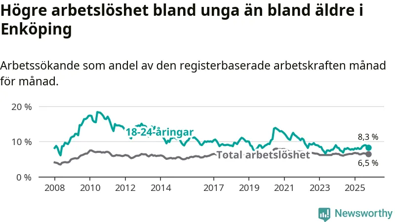 Till skillnad från den totala arbetslösheten stiger arbetslösheten bland unga (+0,6 procentenheter). I oktober var 8,3 procent av 18–24-åringarna inskrivna som arbetssökande (motsvarande 211 personer). Mäter vi antalet inskrivna ser vi en ökning med 16 personer på ett års sikt.