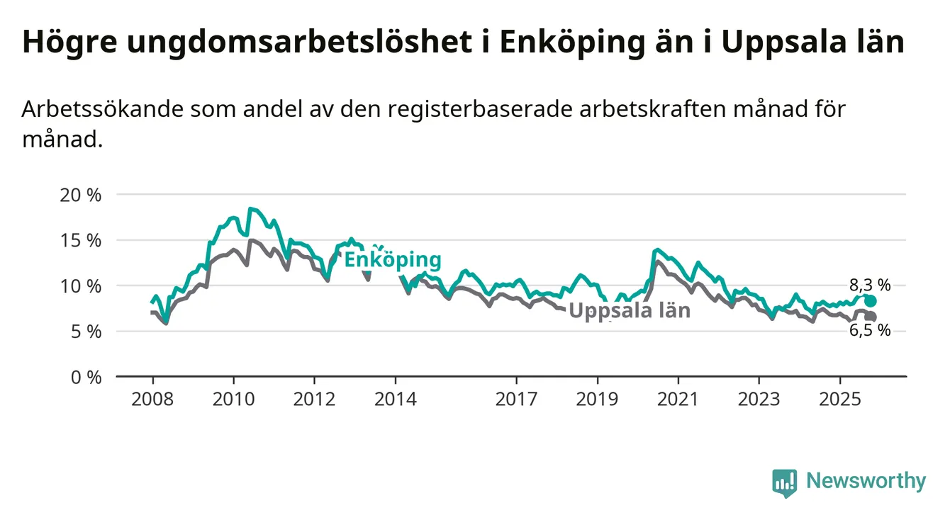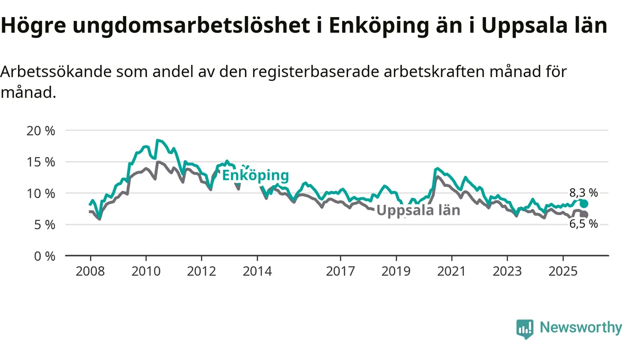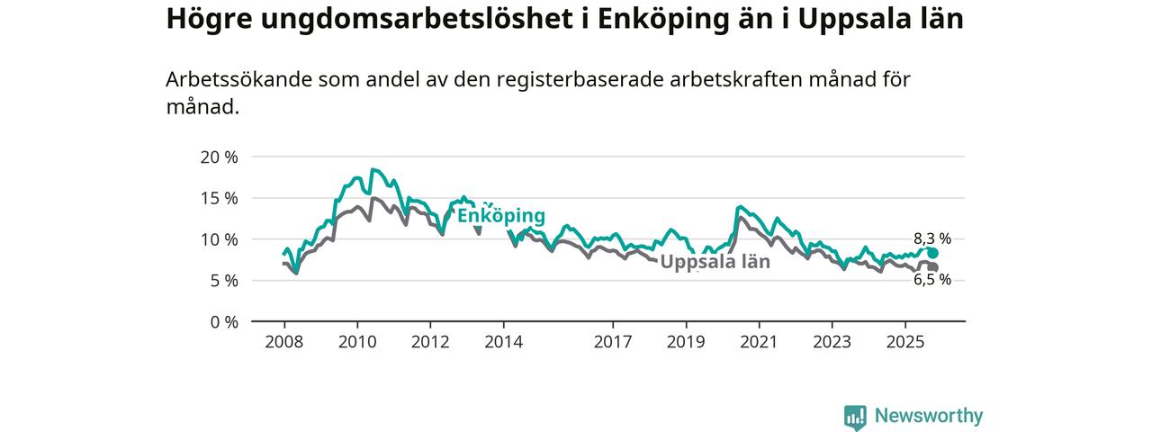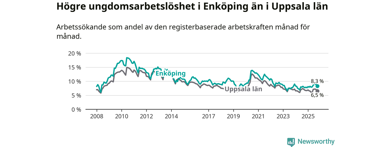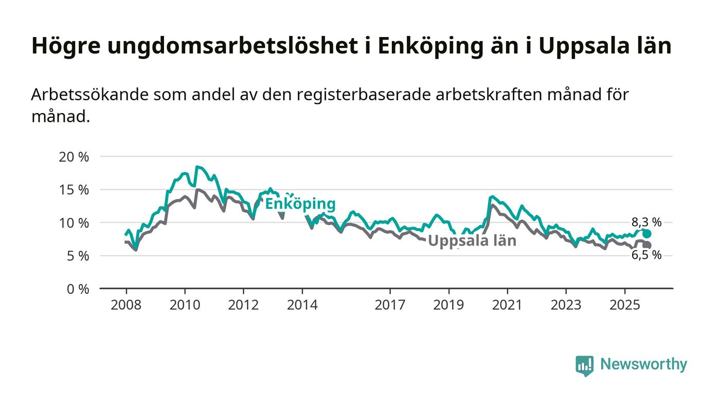 Graf: Arbetslöshet bland unga i Enköpings kommun och Uppsala län