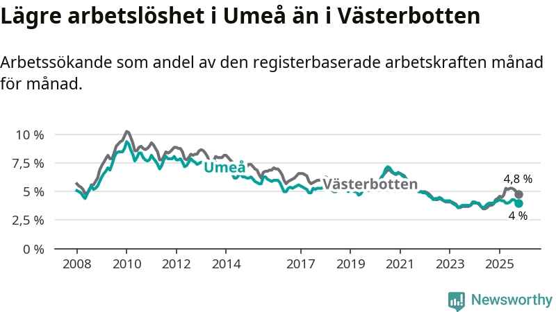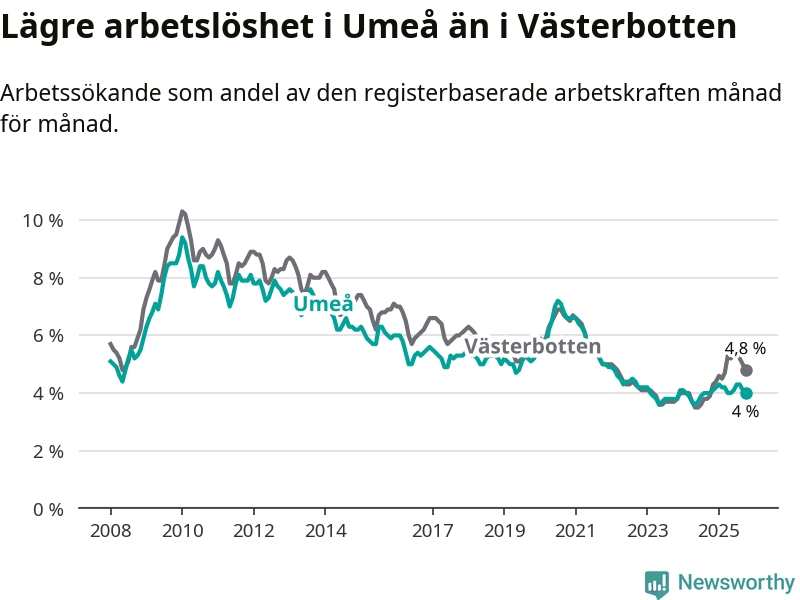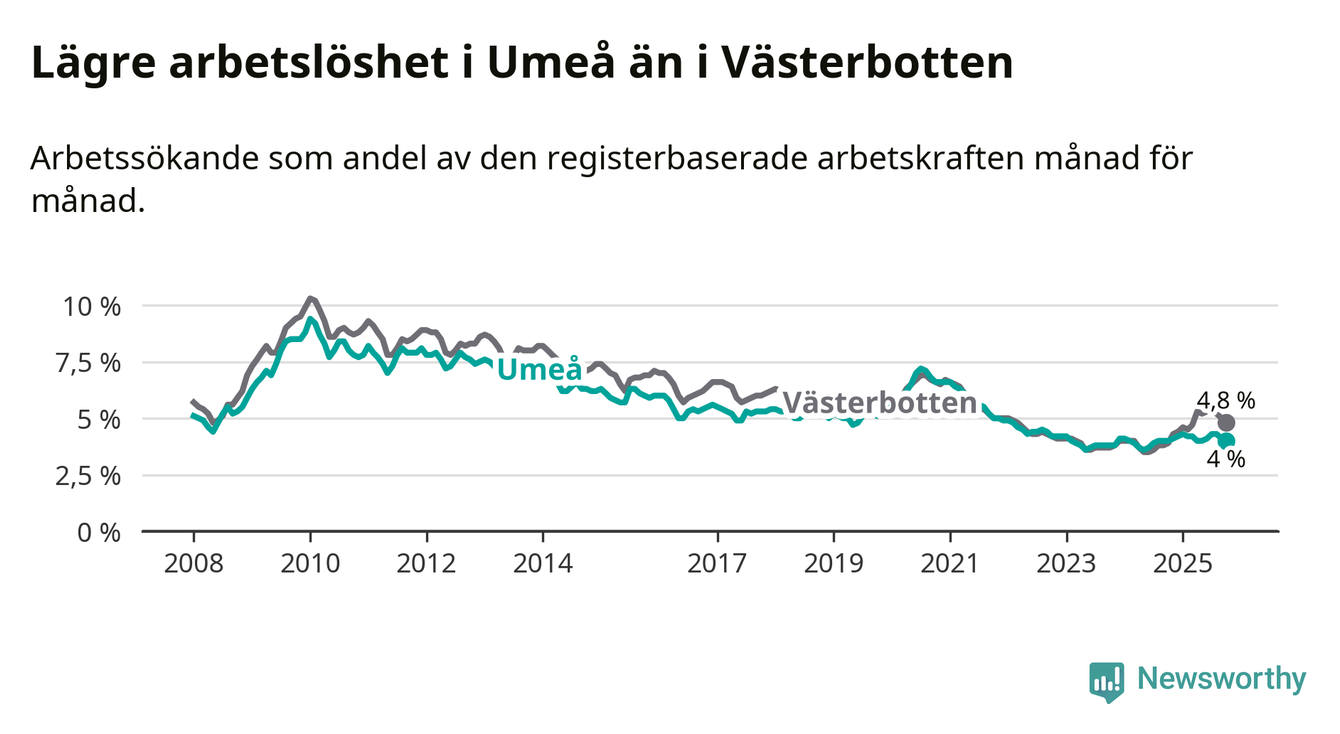 Graf: Arbetslöshet i Umeå kommun och Västerbottens län