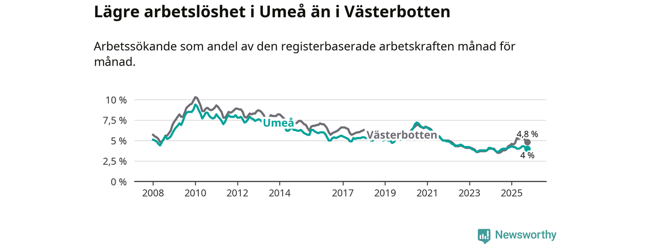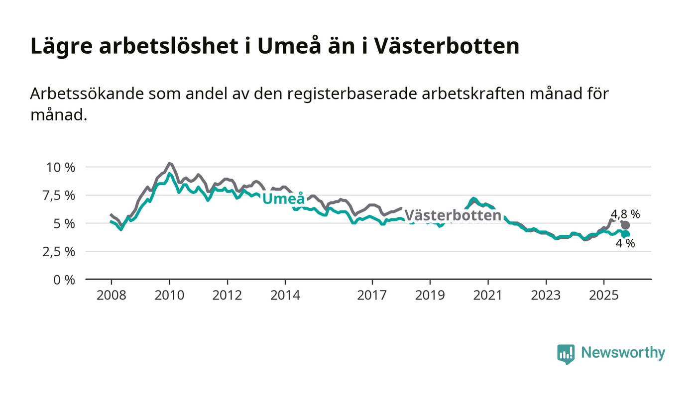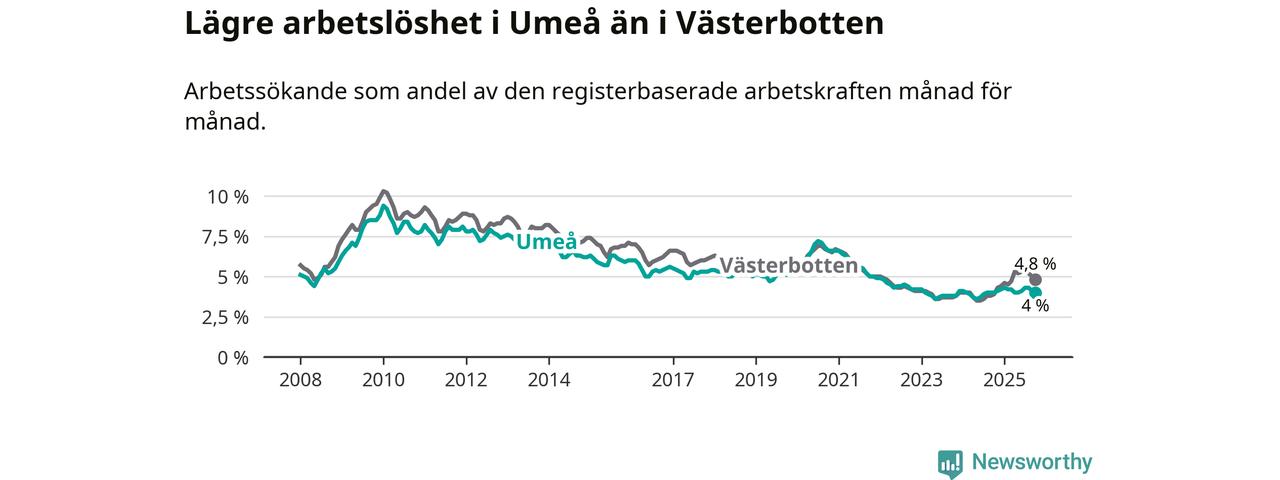 Under oktober månad rapporterade Umeå kommun en total arbetslöshet på 4,0 procent. Det är i samma nivå som i oktober i fjol. I Västerbottens län däremot stiger arbetslösheten