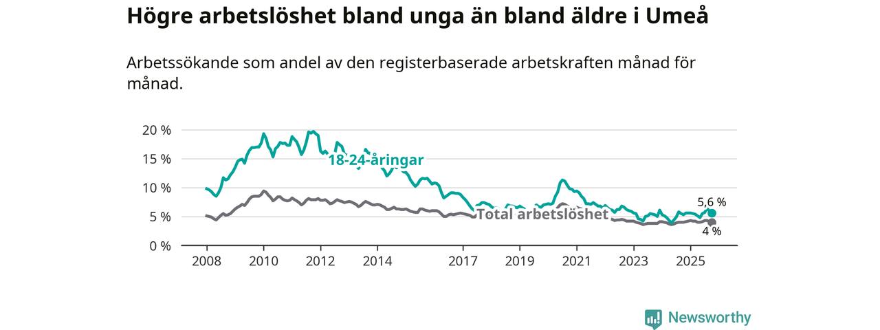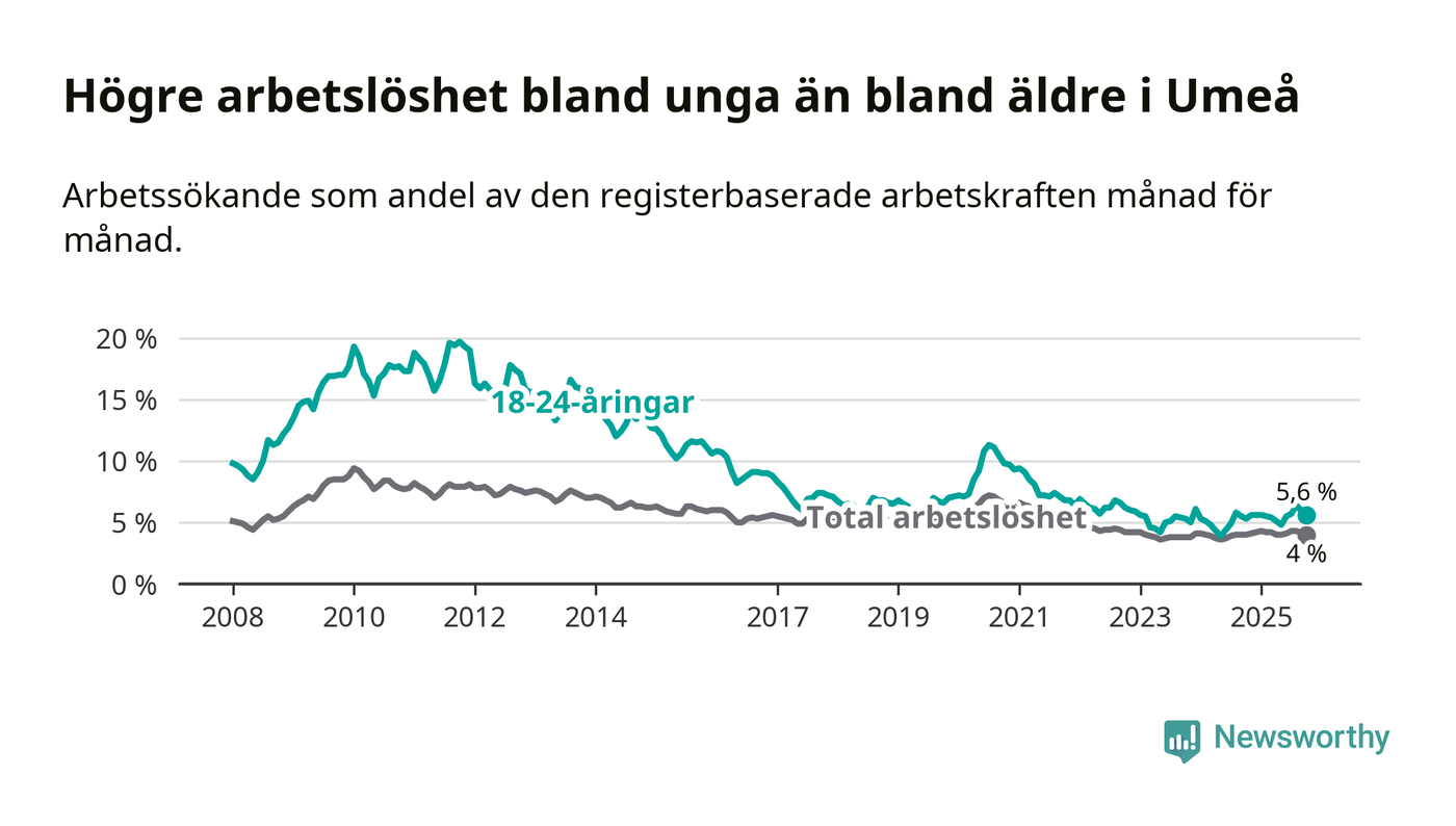 I och med den senaste månadens uppgång har de ungas arbetslöshet i Umeå stigit tio månader i följd (upp från 5,6 procent i december 2024 till 5,6 procent nu).